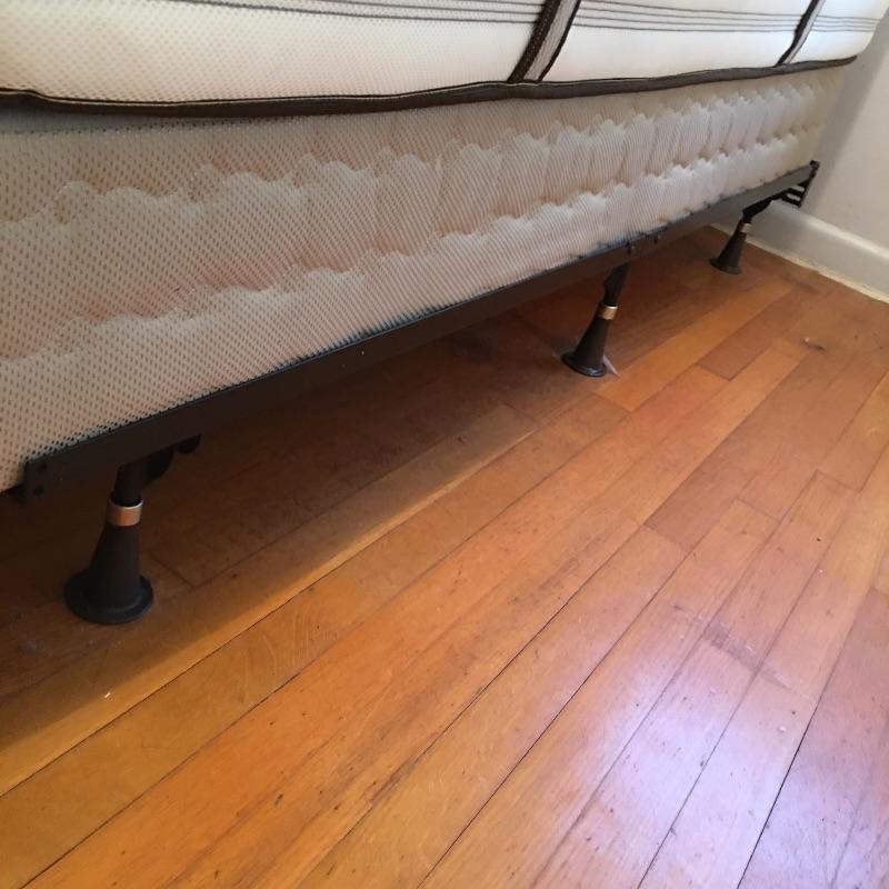 This lot includes two metal bed frames and mattresses to fit. First frame is queen sized and includes a Tempur-Pedic mattress and box spring in great condition (measures 59” x 79” x 11” ). Mattress has a zipper cover. The second frame is full sized and has a Beautyrest mattress that measures 51” x 72” x 12”. Mattresses and box springs are in great condition and available for free to the winning bidder of the bed frames. The Headboard is not included but available in lot 2.