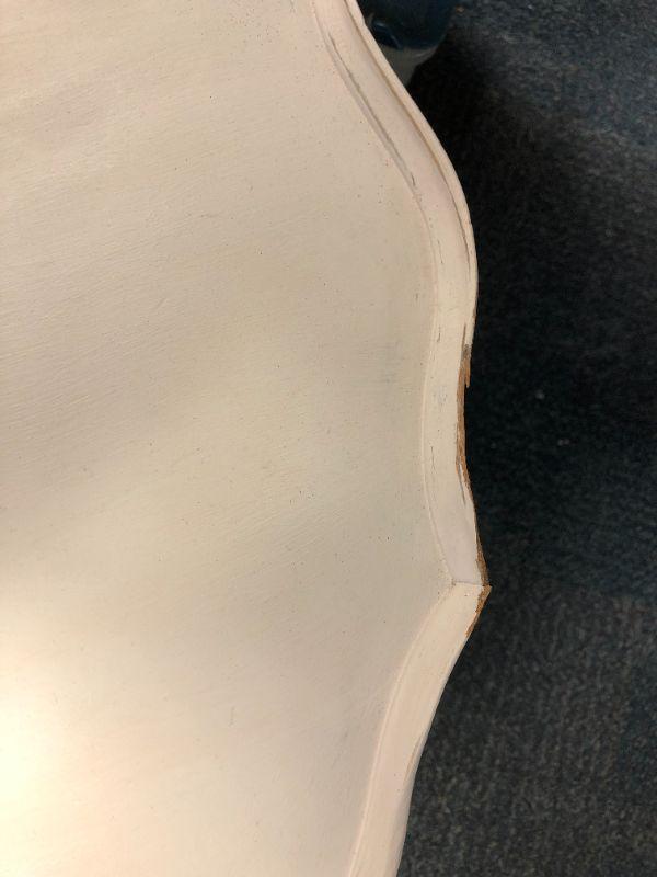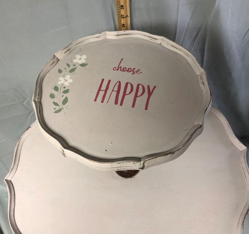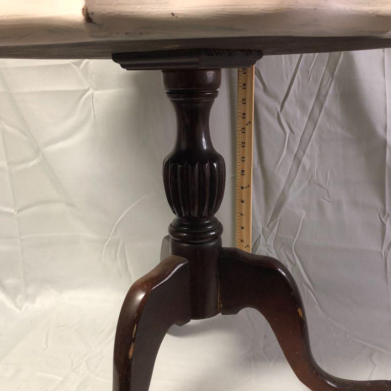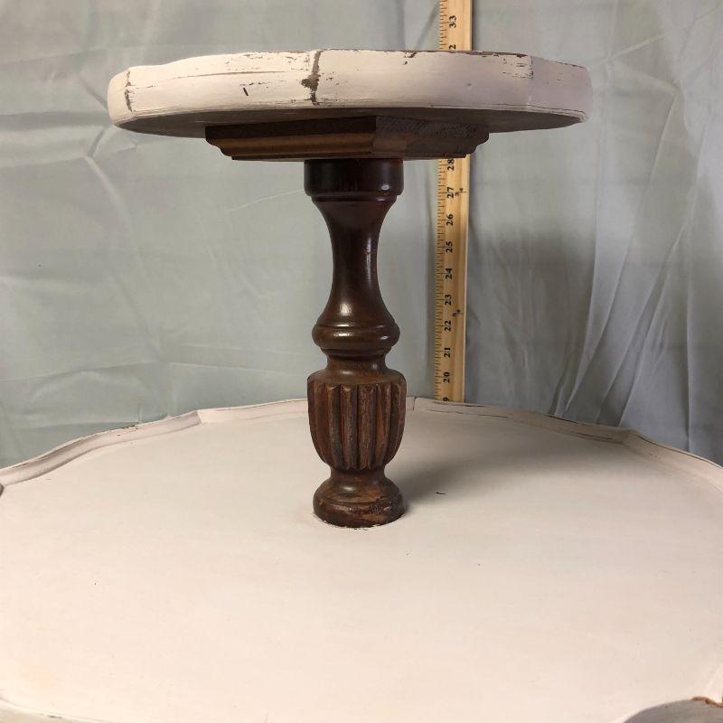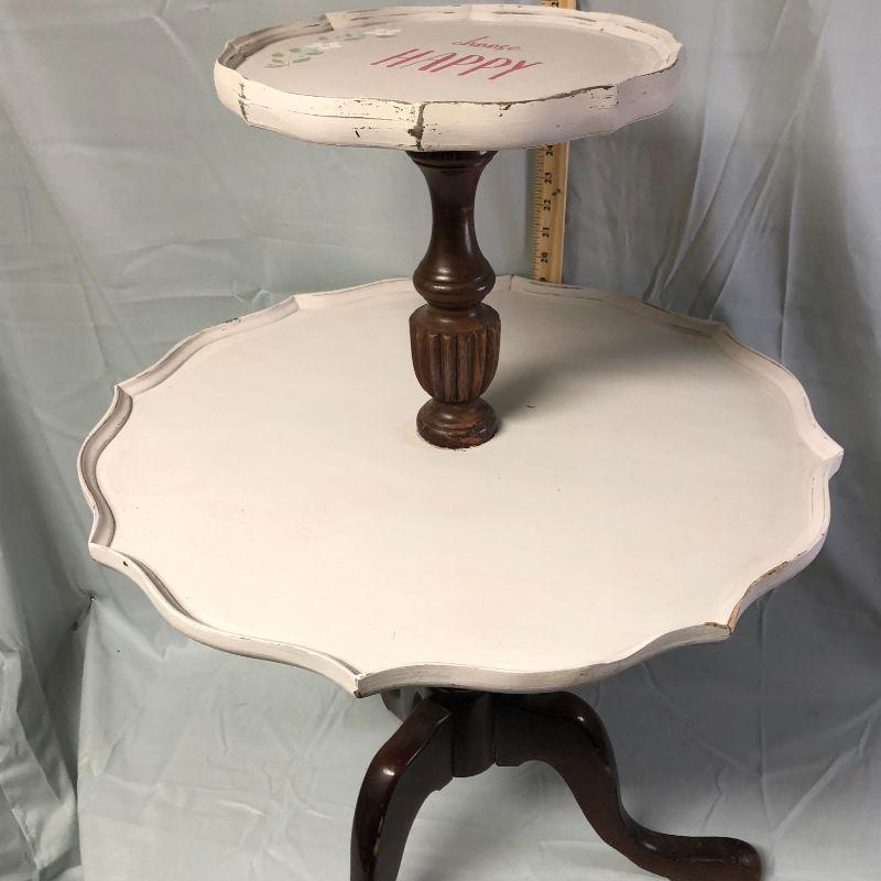 The two shelves are painted using chalk paint and there are scuff marks on the legs, but structurally, this table is in excellent condition. There is one spot on the lower level where the edging was damaged, but the way that it was painted camoflauges this. It stands about 31" with the bottom shelf about 21.5" across and the top shelf about 11.5".
