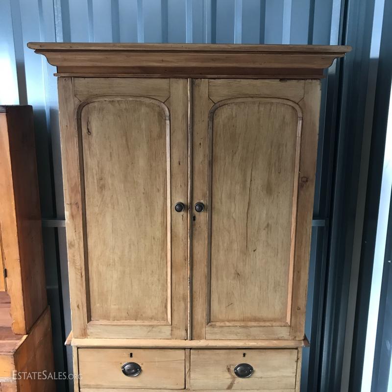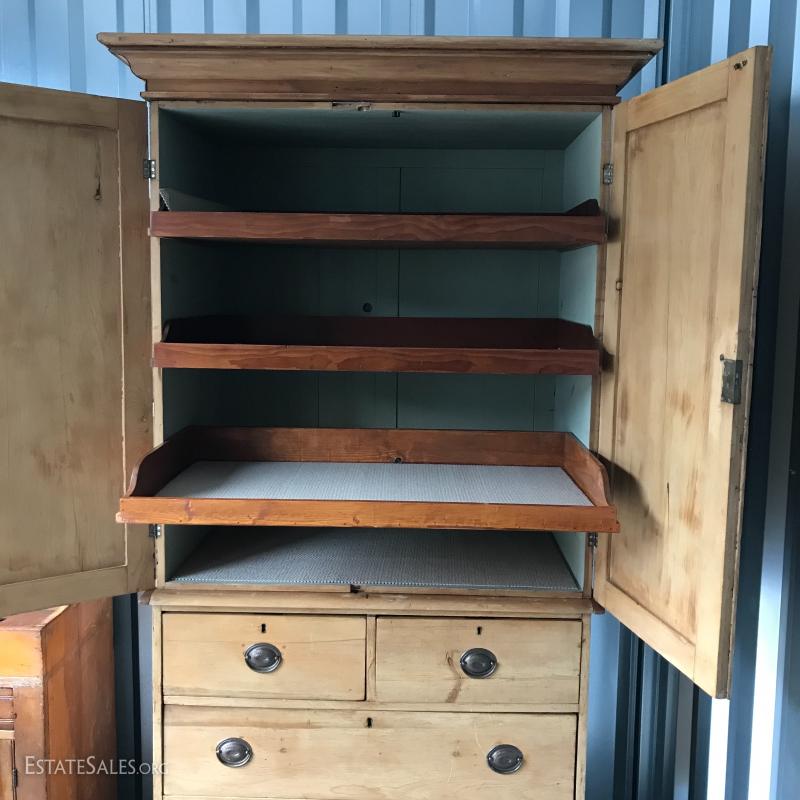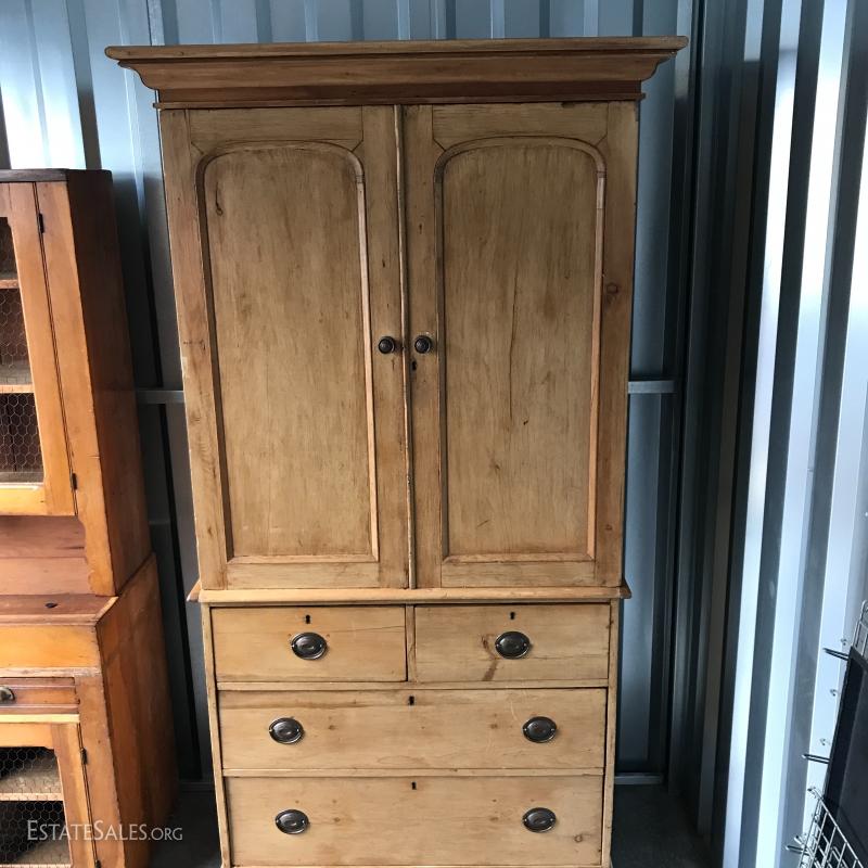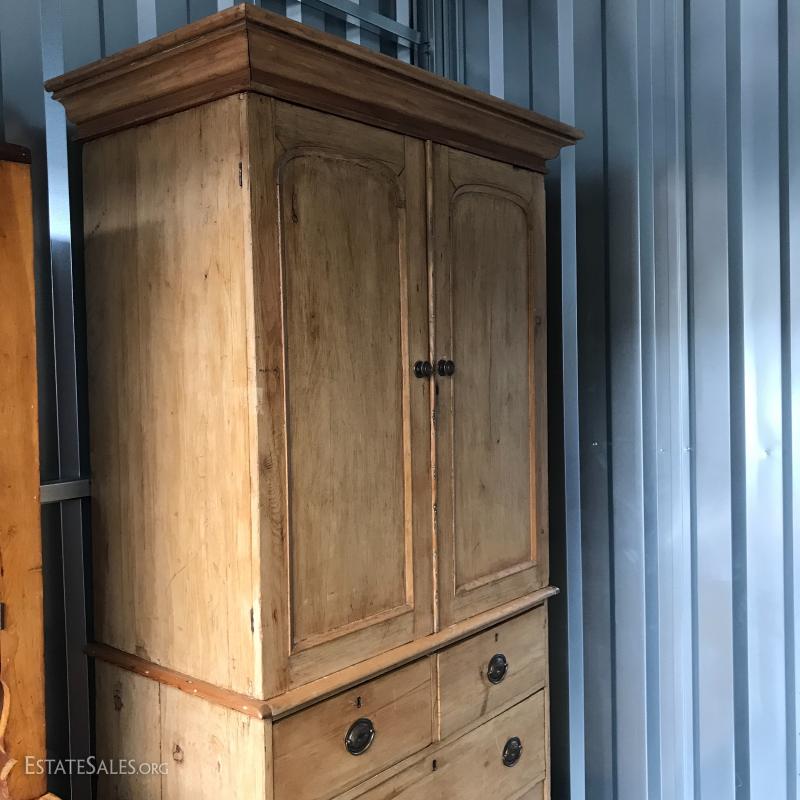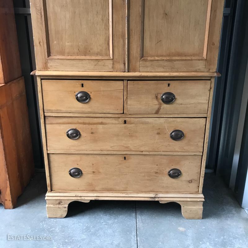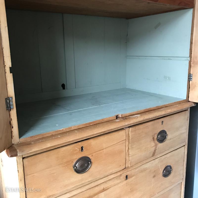3 piece rustic armoire with 4 drawers on bottom and sliding shelves in top cabinet. Unit measures 46” x26” x87” with top crown measuring 46” x26” x4.5” and top cabinet measures 40” x22” x44” and bottom drawers measure 42” x24” x30”. Take top cabinet and top molding off and just use as a dresser. Great versatile piece with tons of storage options. This item is avaialable for local pick up in Asheville, NC only.