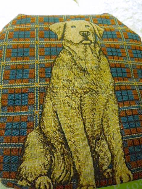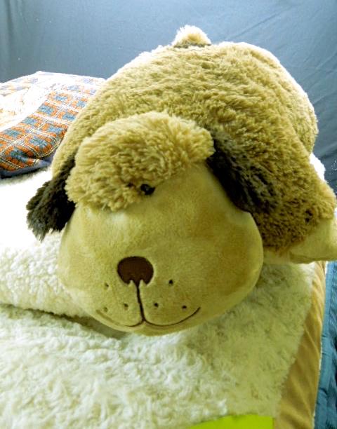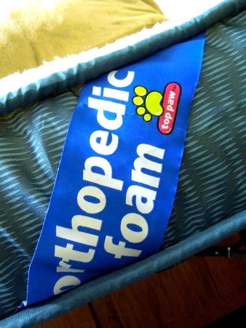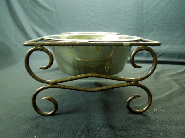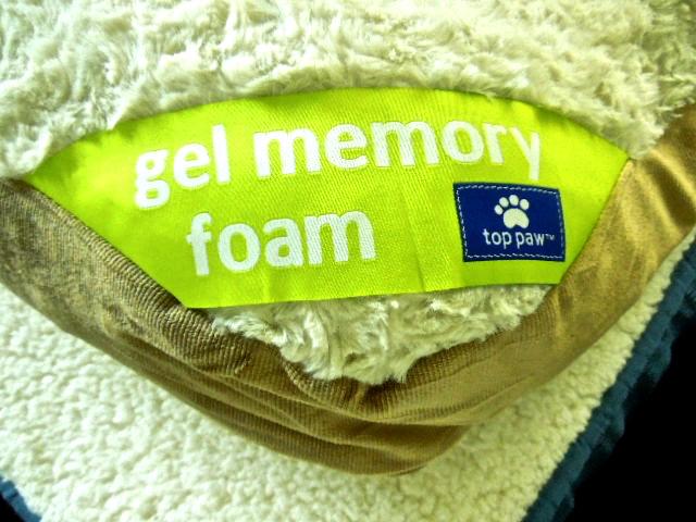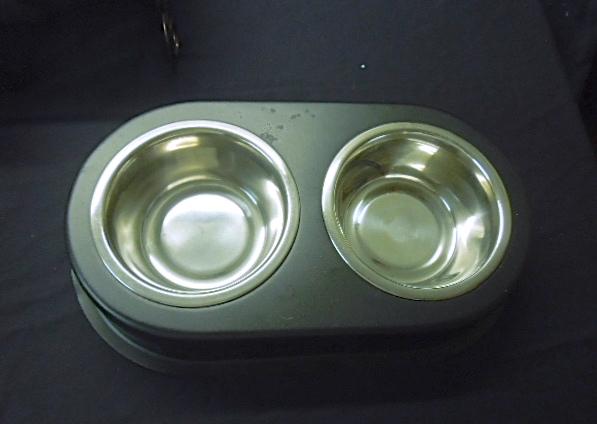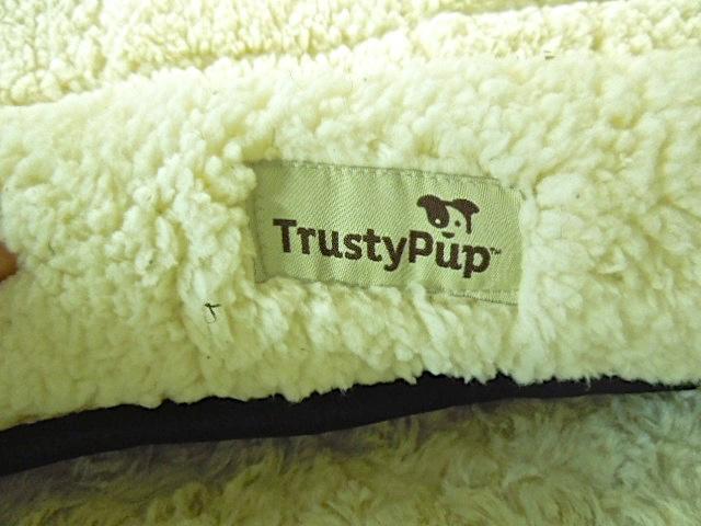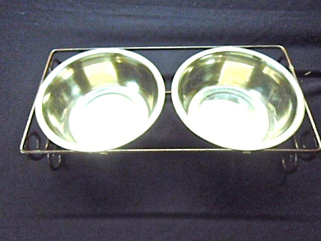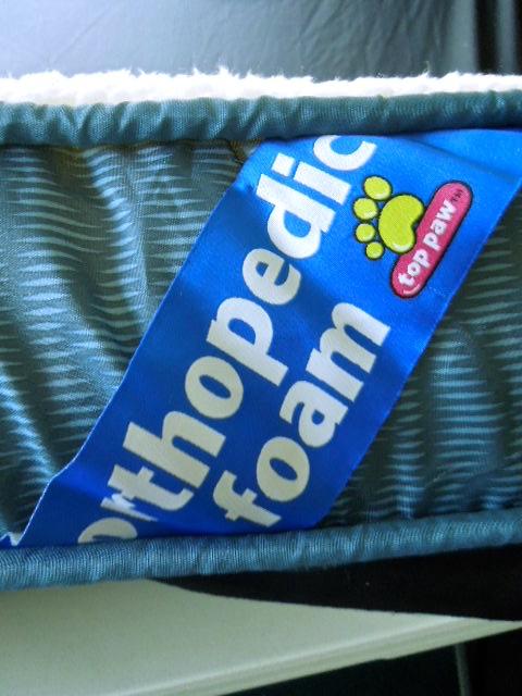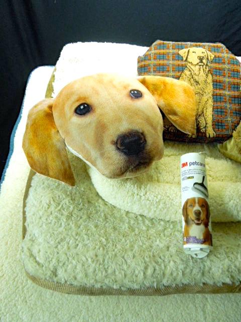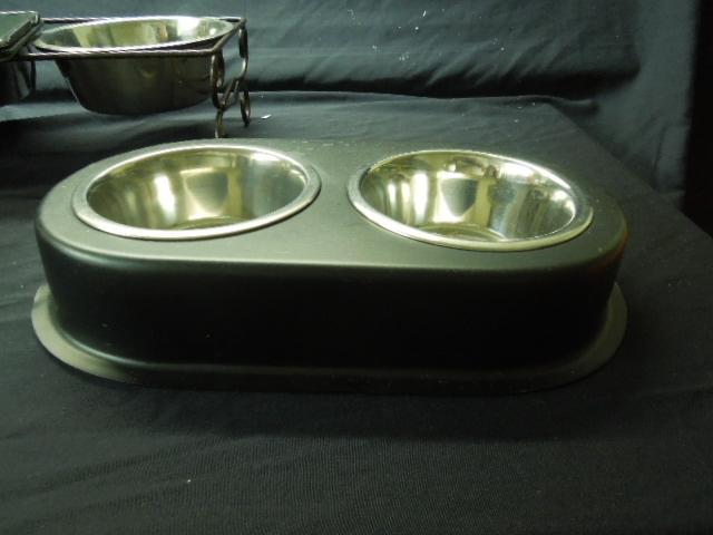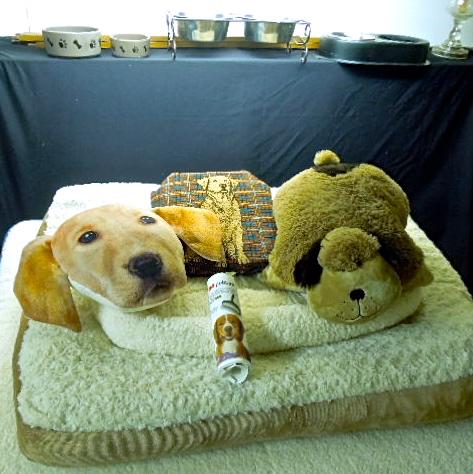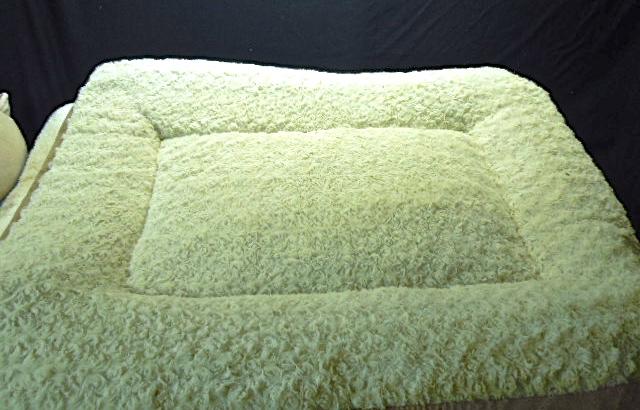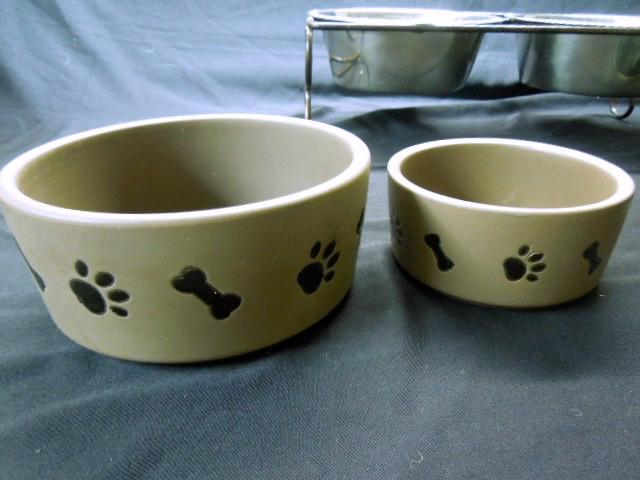 White dog bed 29" x 20"; Tan and white is 40" x 30"; blue and white 46" x 35". Bisque paw bowls 7" and 5"; metal bowls in scrolled rack 17" x 5". Extra character throw pillow, pet roller adhesive and plush toy.