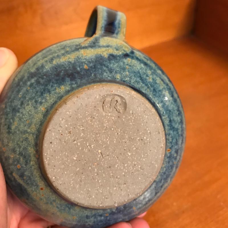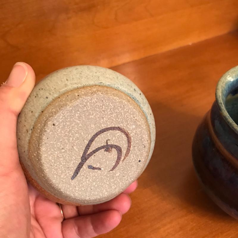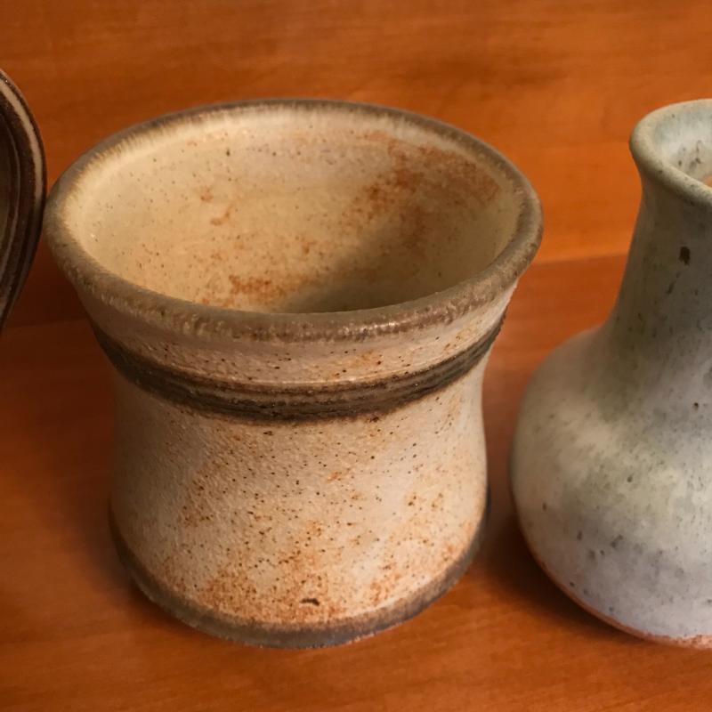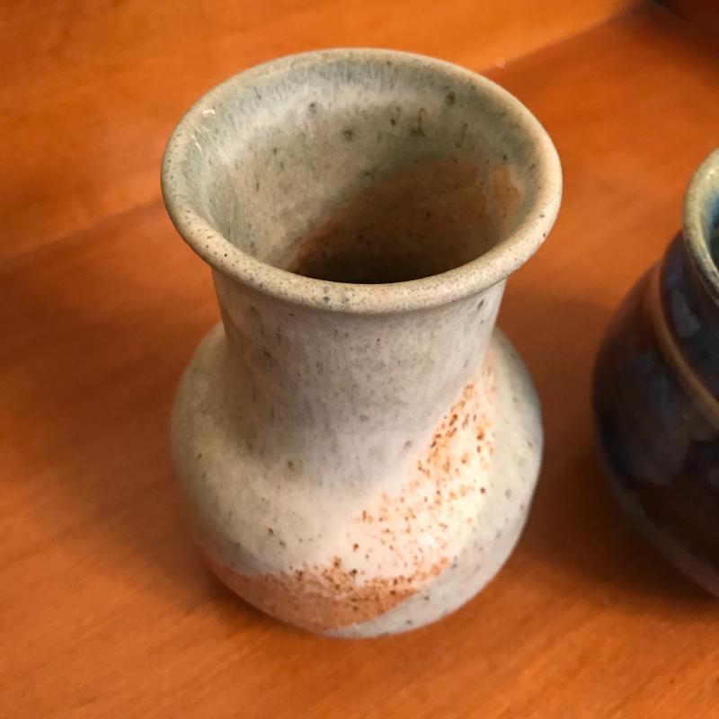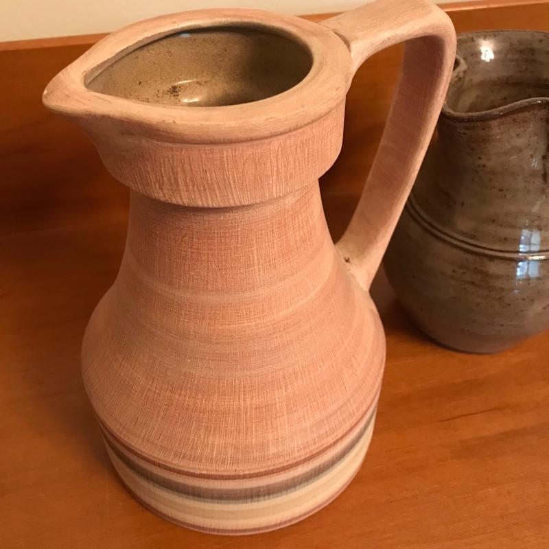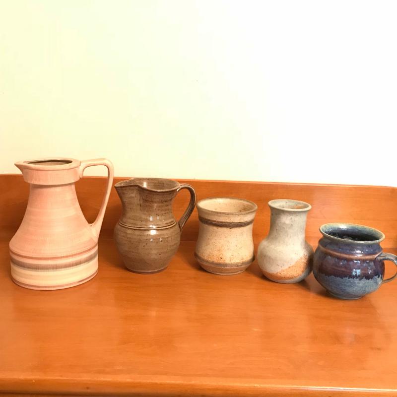 Five pieces of pottery: 2 pitchers, 2 vases and one mug. Largest mauve-hued pitcher measures 5.25" at the base and is 7.5" tall. All signatures are noted in pics. Shipping or local pick up.