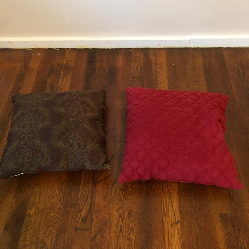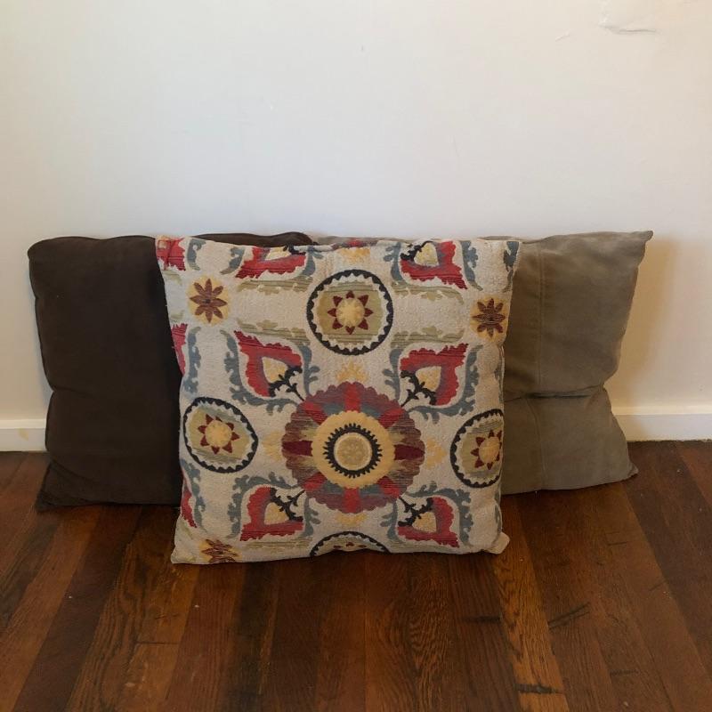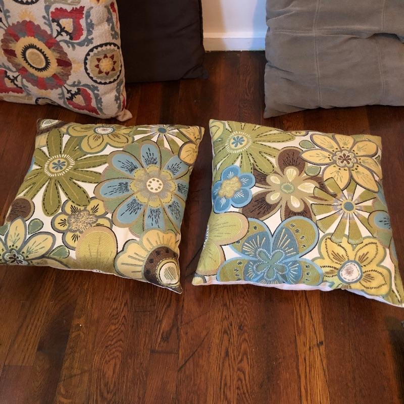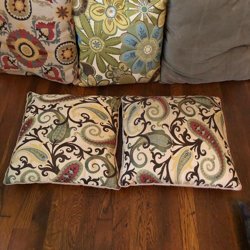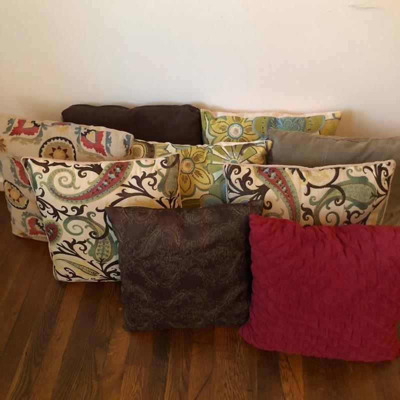 A total of nine standard sized accent pillows here; some are a match pair and the solid colors work very well mixed and matched up with any combination. A few may be good patio/porch pillows too.
