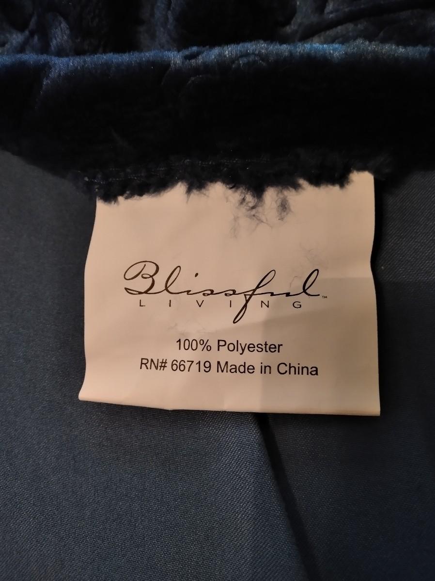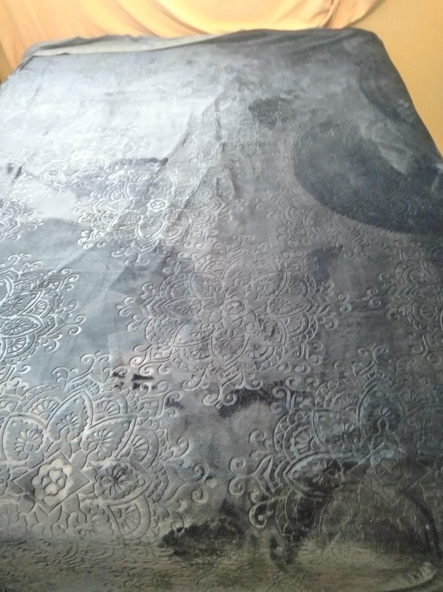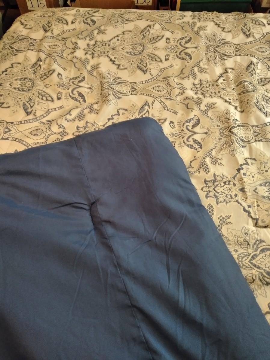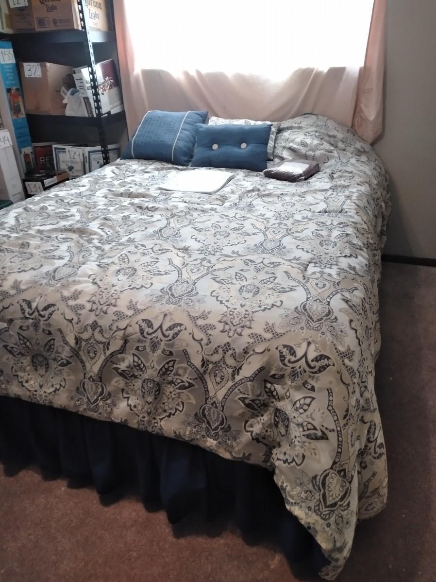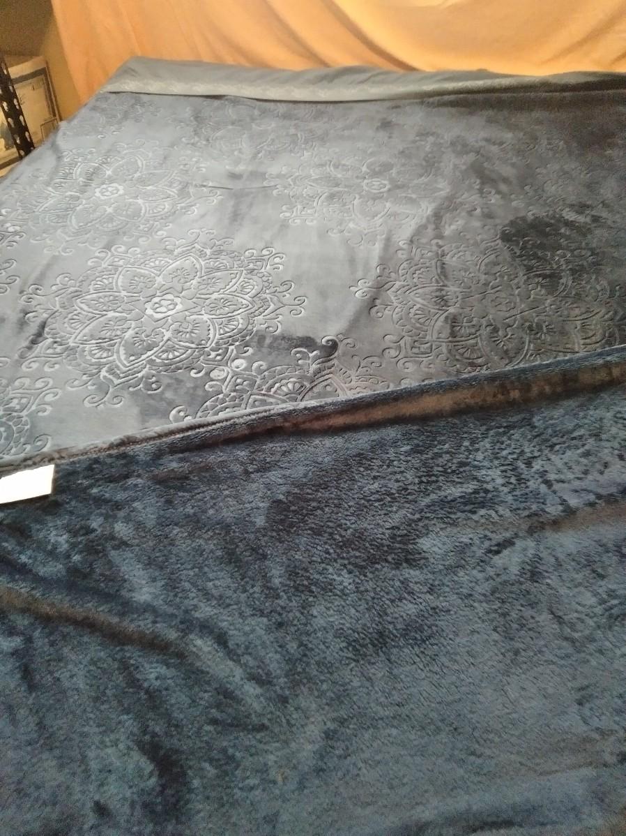REVERSIBLE QUEEN/KING COMFORTER (no tag) REVERSIBLE BLISSFUL LIVING POLYESTER BLANKET, HIGHGATE MANOR KING SIZED SHEET SET INCLUDES FITTED SHEET, FLAT SHEET, TWO BED SKIRTS, AND SOME THROW PILLOWS.