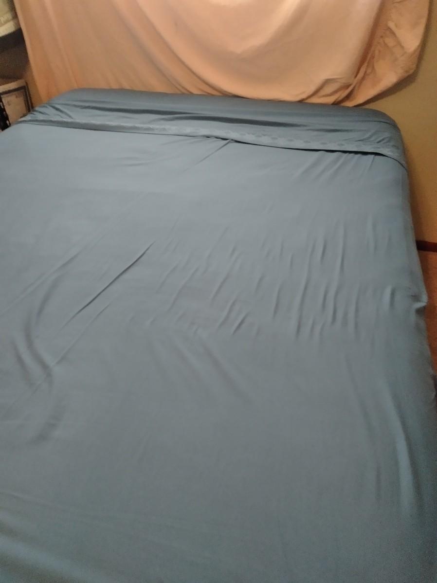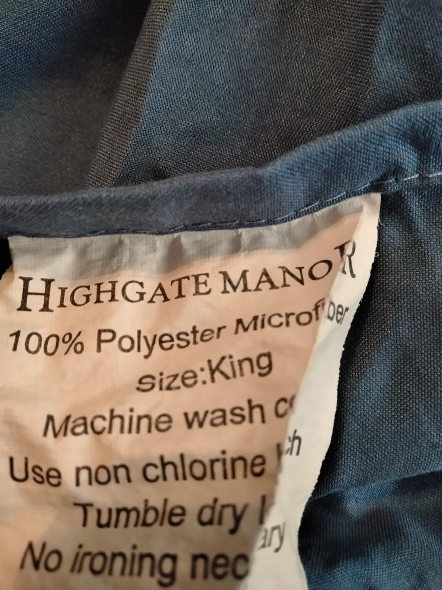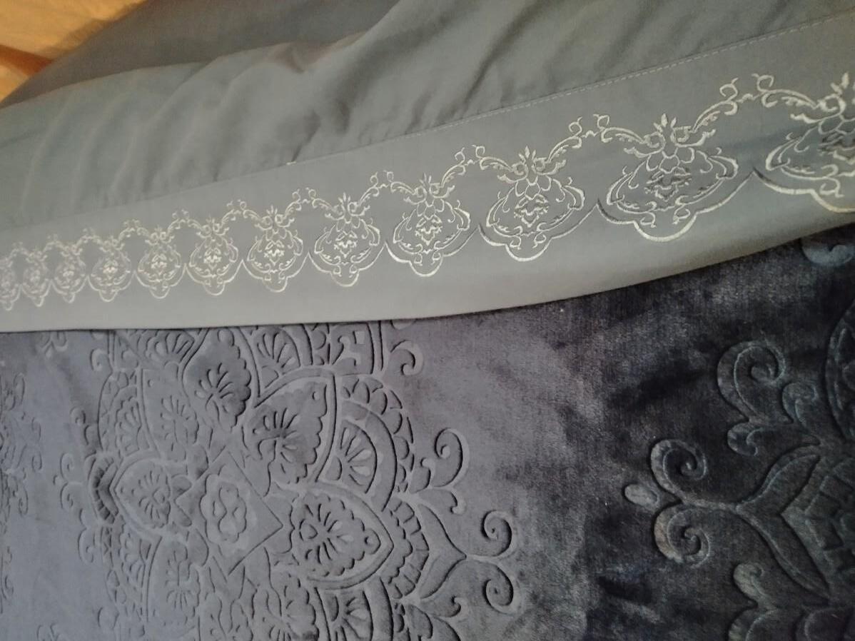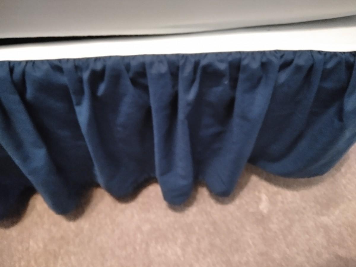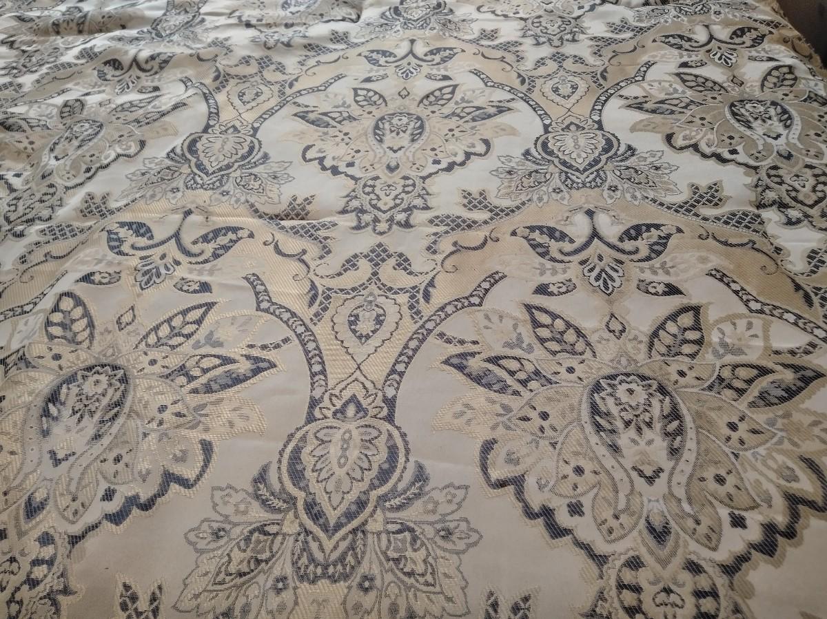 REVERSIBLE QUEEN/KING COMFORTER (no tag) REVERSIBLE BLISSFUL LIVING POLYESTER BLANKET, HIGHGATE MANOR KING SIZED SHEET SET INCLUDES FITTED SHEET, FLAT SHEET, TWO BED SKIRTS, AND SOME THROW PILLOWS.