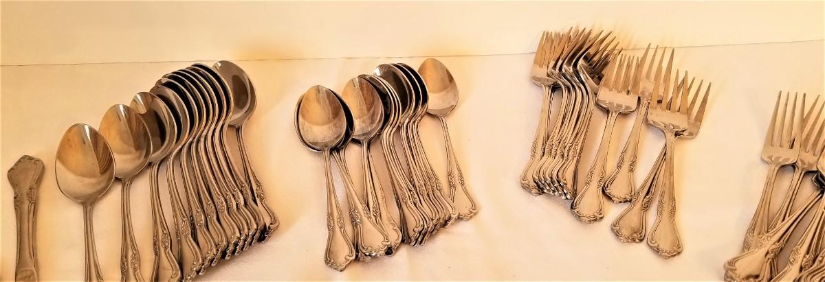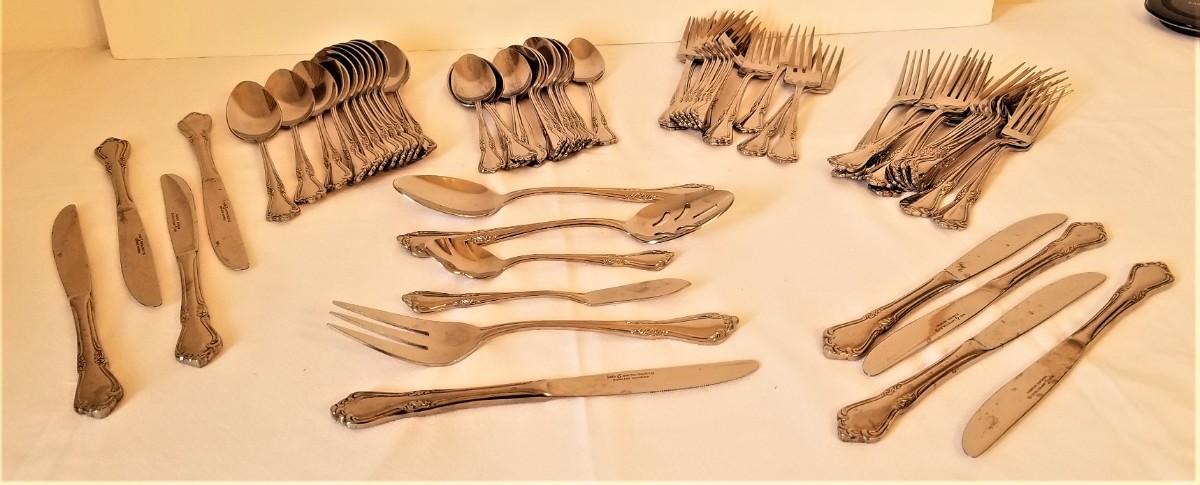 Set of Reed & Barton Select stainless flatware - you get all you see here. 9 Knives, 11 tablespoons, 13 teaspoons, 12 salad forks, 11 dinner forks, 5 serving pieces. Good used condition.