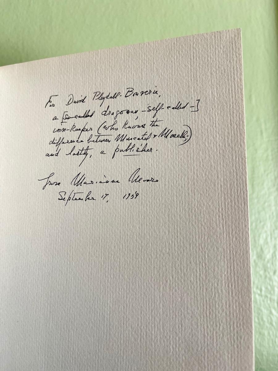 LOT 5 - SIGNED Marianne Moore - O To Be A Dragon Poetry Book. This hardcover book has the original dust jacket and is in very good condition. Signed personal inscription to David from 1959. Inner pages and very clean and neat. There are some very faint marks on covers. This book was part of the David-Pleydell-Bouverie library at Bouverie Ranch in Glen Ellen. This item can be viewed at our Green + Cate Showroom in Sebastopol from July 15th - July 18th between the hours of 9am-5pm. For the benefit of the Bouverie Preserve of Audubon Canyon Ranch