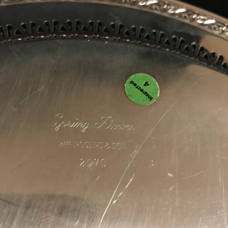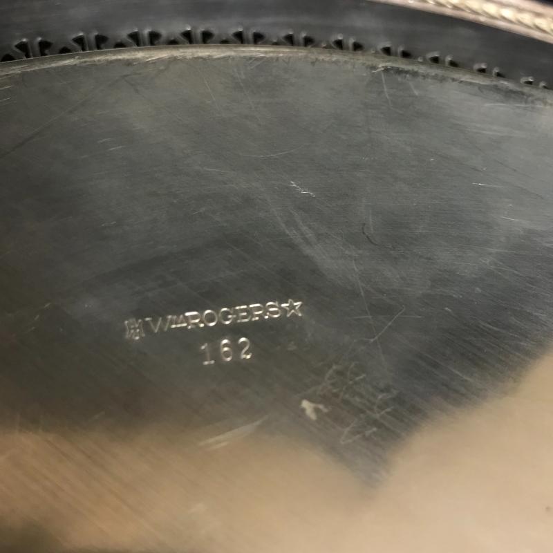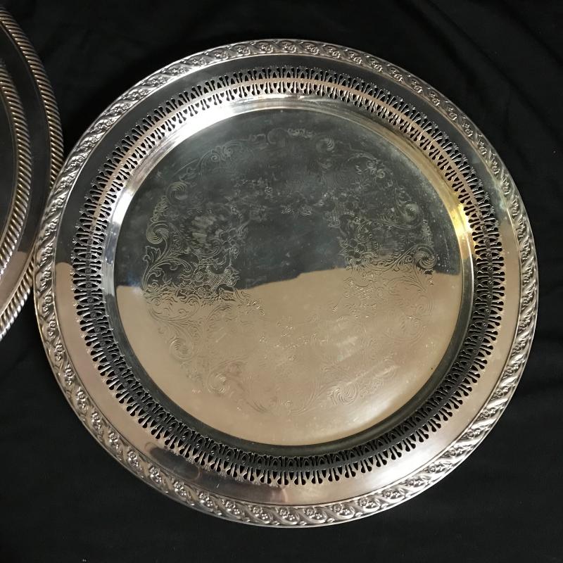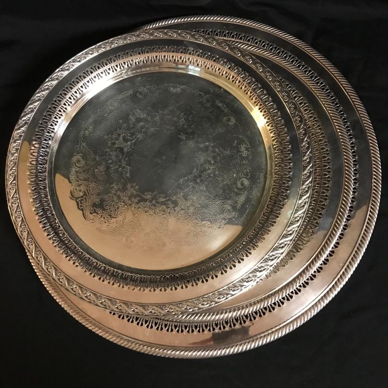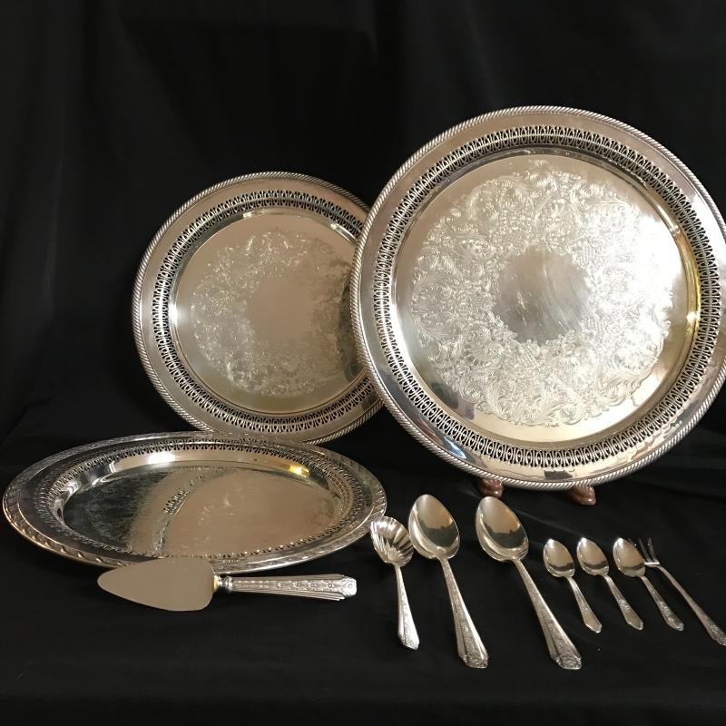 Reed & Barton serving and demitasse cutlery along with three WM Rogers platters, two matching with the largest measuring 15”. Shipping available.