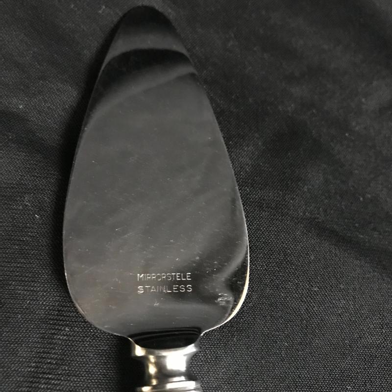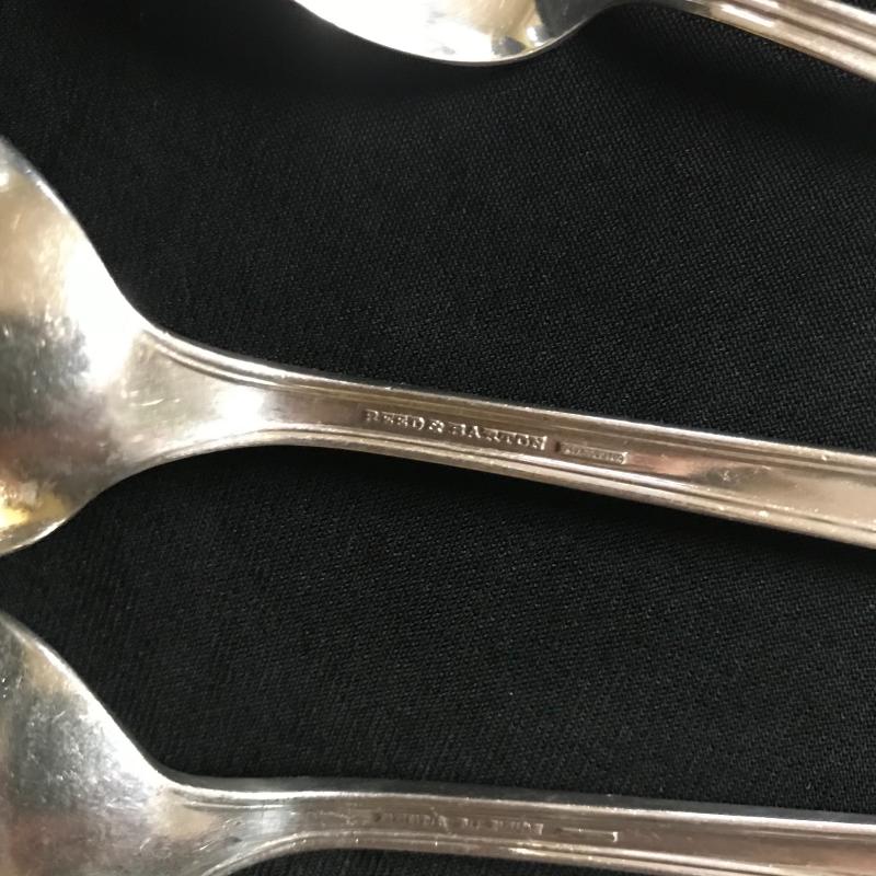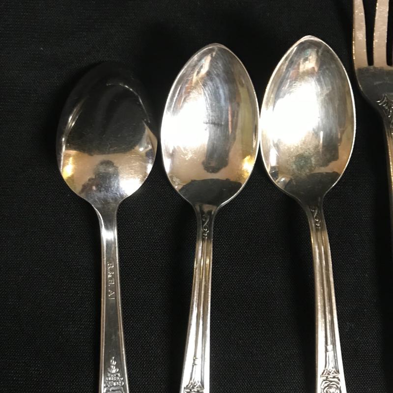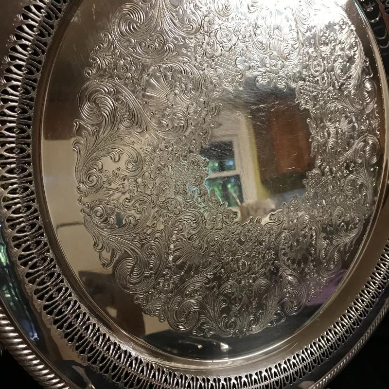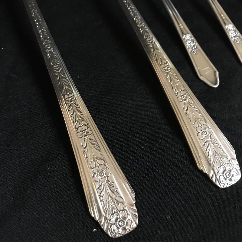 Reed & Barton serving and demitasse cutlery along with three WM Rogers platters, two matching with the largest measuring 15”. Shipping available.