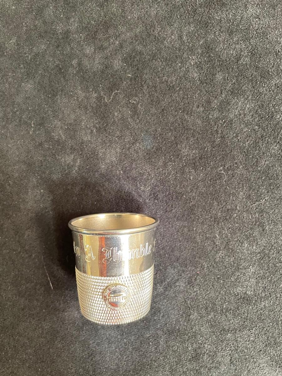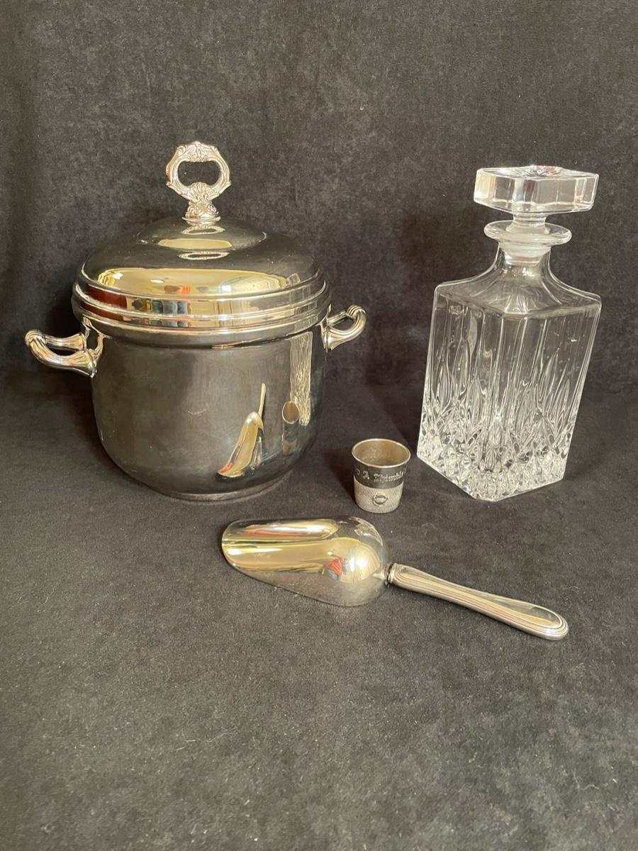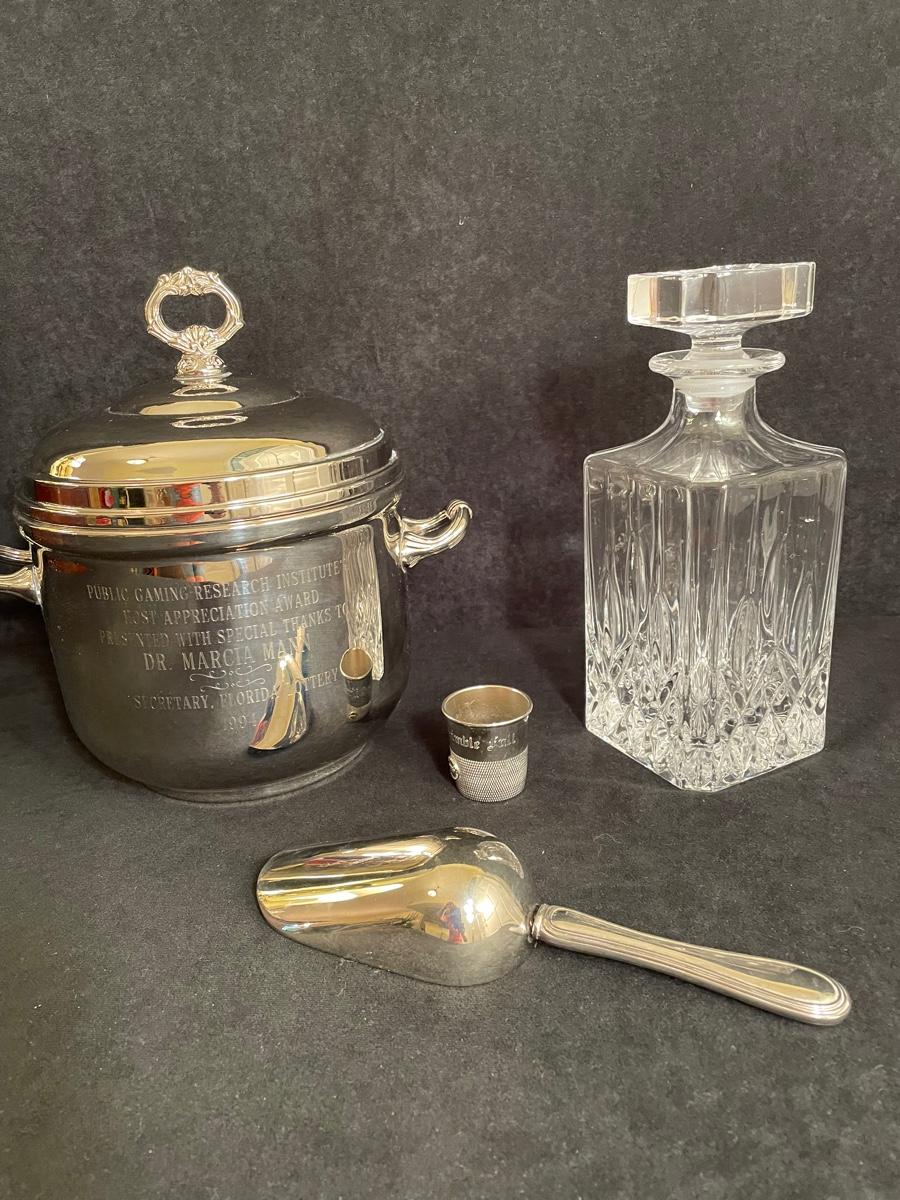Crystal decanter, silver-plate ice bucket, ice scoop and shot glass that looks like a thimble engraved with "Only a Thimble full". The ice bucket is engraved with some commemorative details, but the backside is plain.