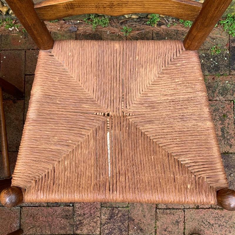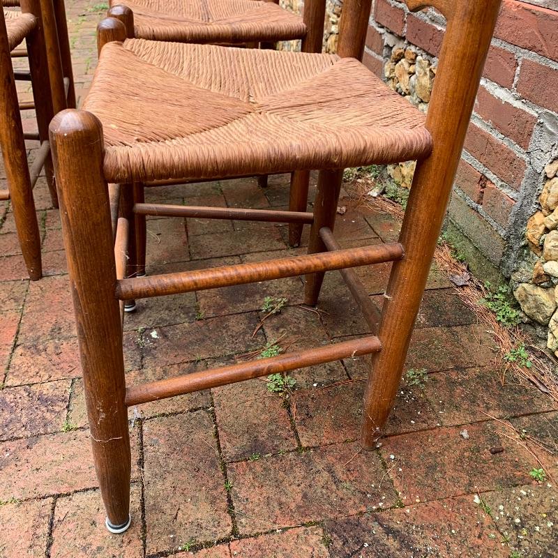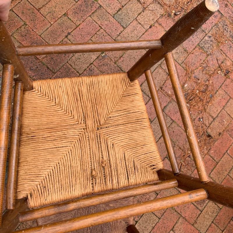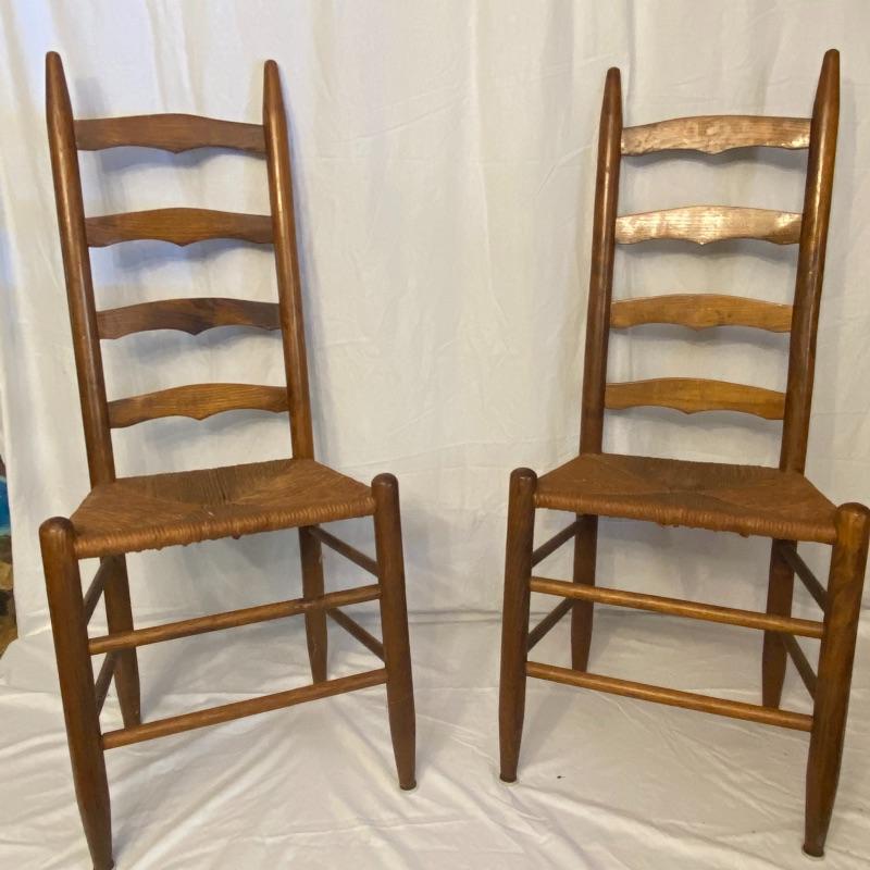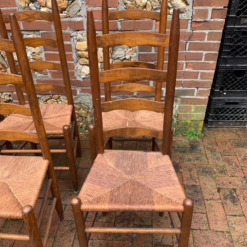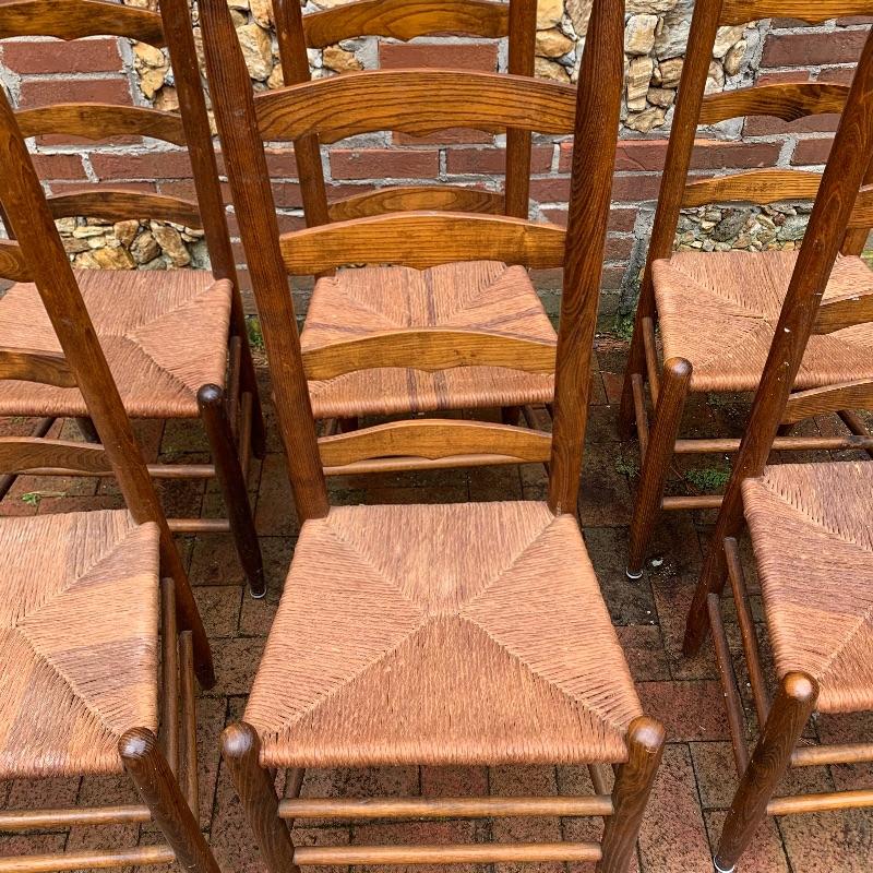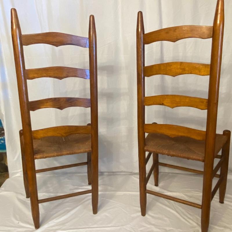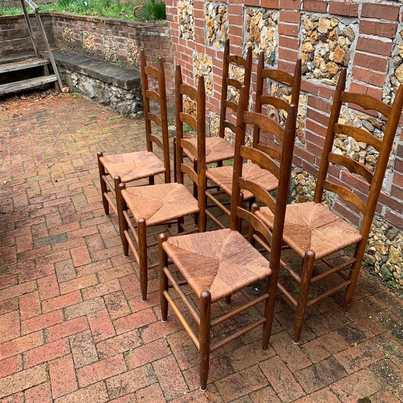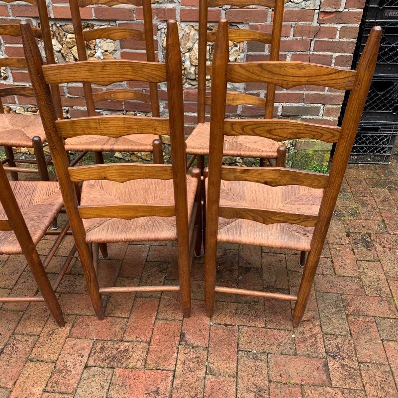 Set of six ladder-back chairs, made from beautiful wood with cute woven seat details. All are in good condition. Measurements are 18” x 13.5” x 17”. Back of the chair stands 42” high. Local pickup only.