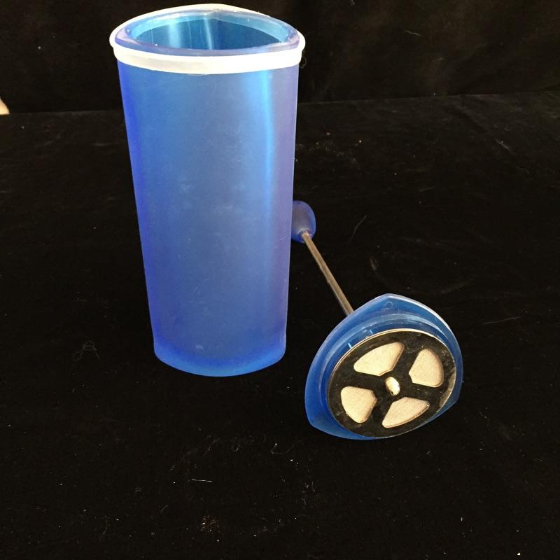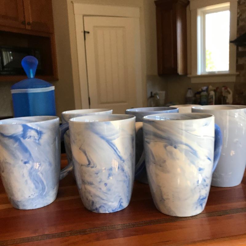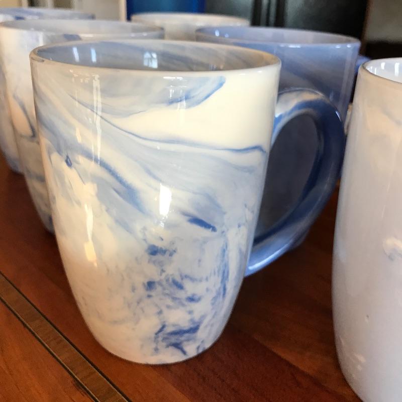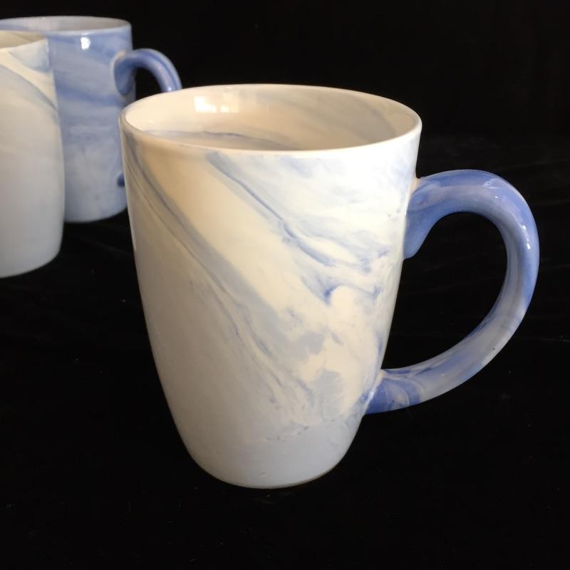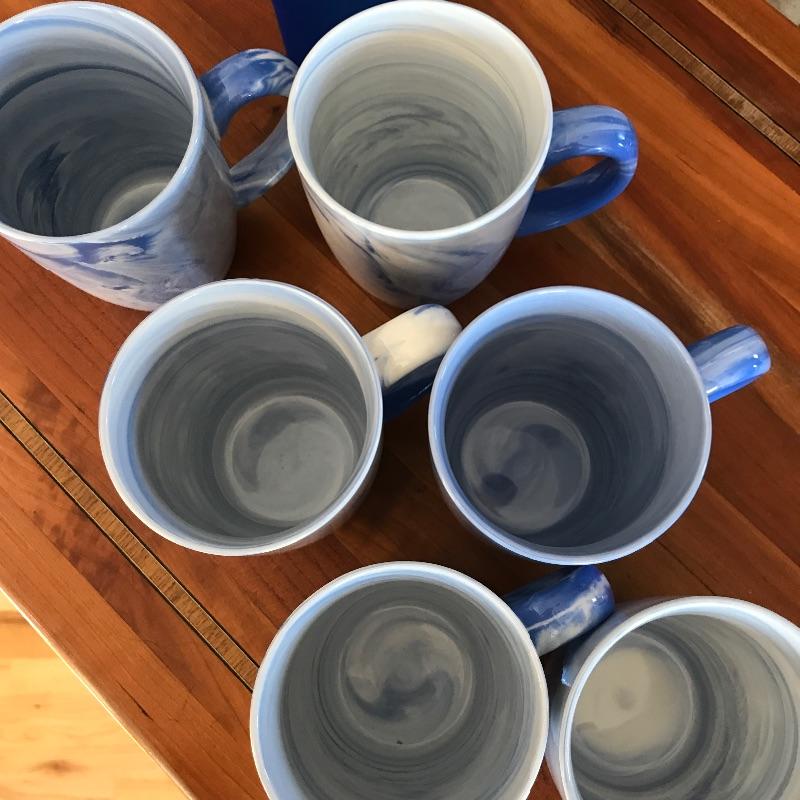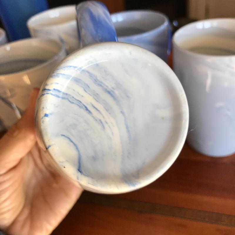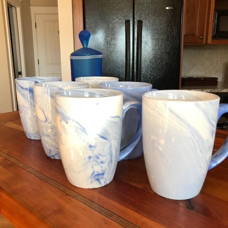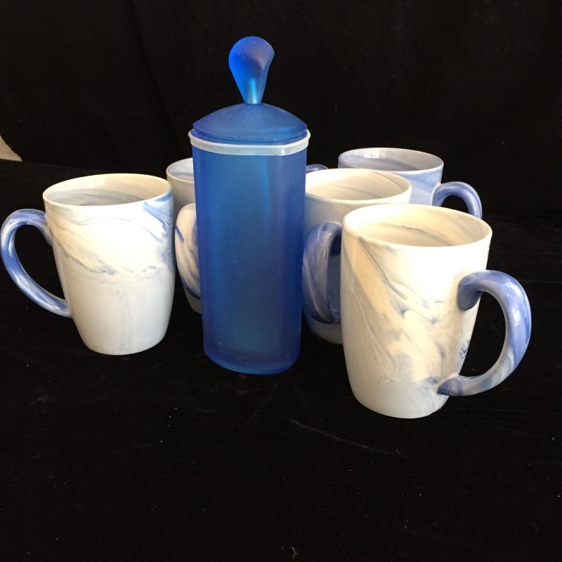 These six large tea or coffee mugs have a lovely blue and white marble look to them (all different) and come with a blue tea or coffee press so you can make that perfect brew. No markings on bottom.