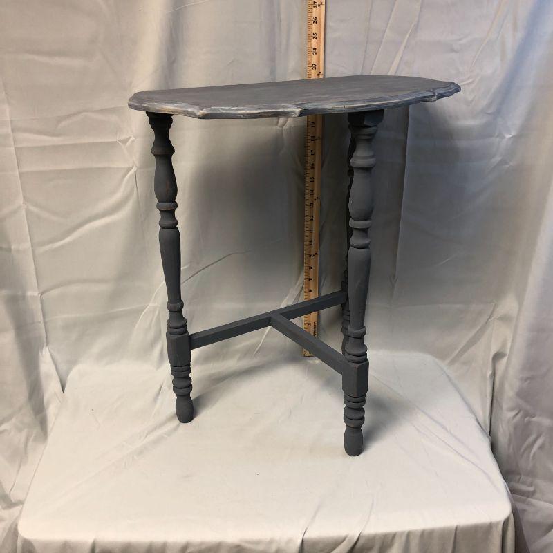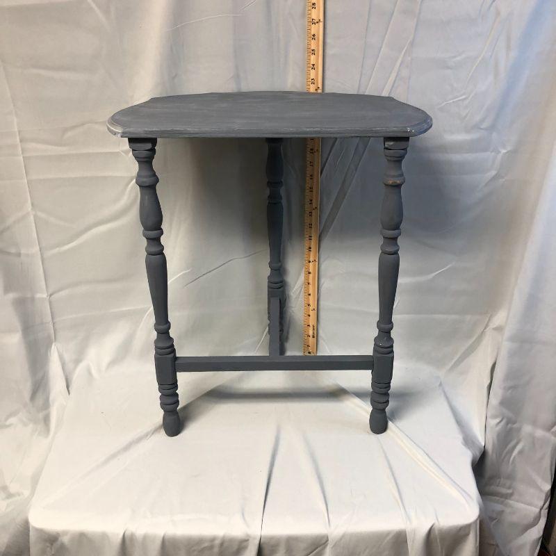 This table is in good condition and solid wood. It is painted with chalk paint so if you don't like the color, it is easy to paint over. It is approximately 22.5" x 19.75" x 12".