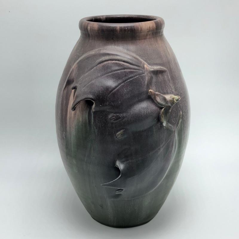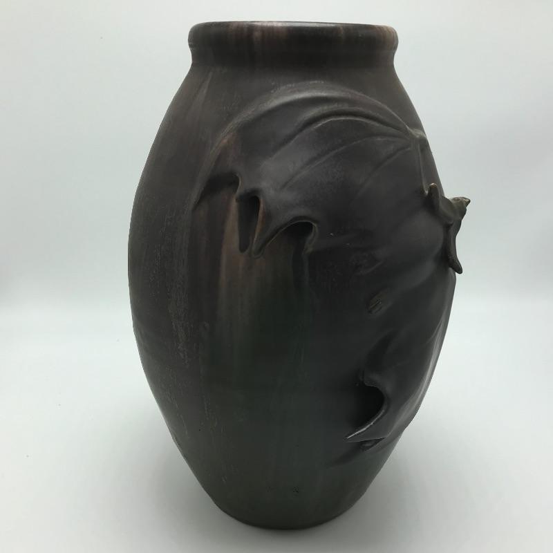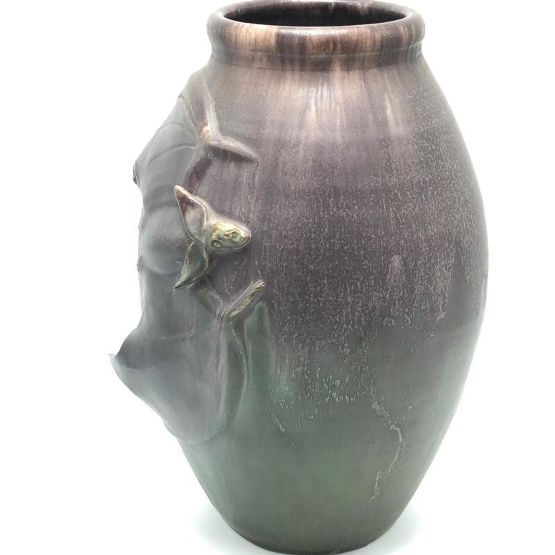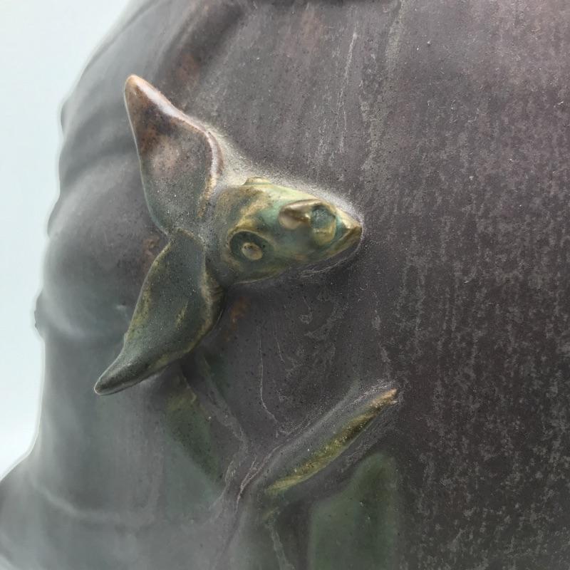 With warm muted yet rich earth tones, this bat vase by Scott Draves is gorgeous. The Door Studio Pottery is glazed inside, signed by the artist and a great addition for anyone who appreciates uniquely designed pottery. Colors are dark purple and greens and are hard to convey in photos.