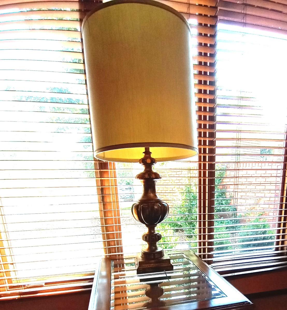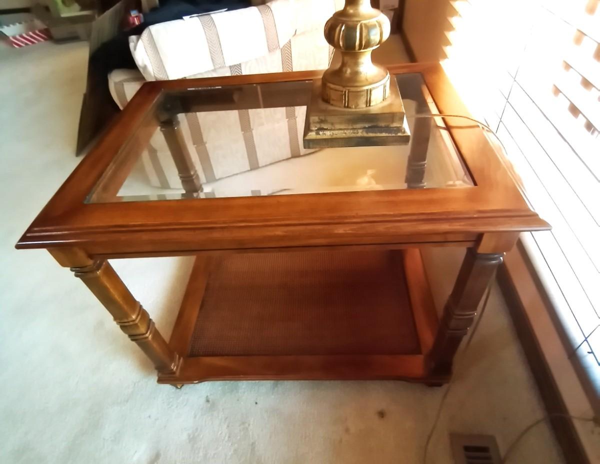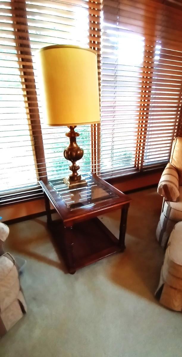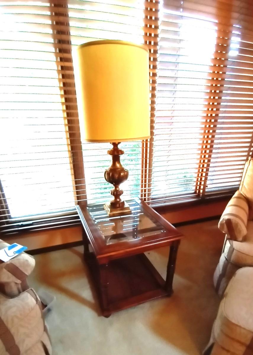 TWO TIER END TABLE WITH GLASS TOP MEASURES 26X20 AND LAMP 35" TALL WITH SHADE