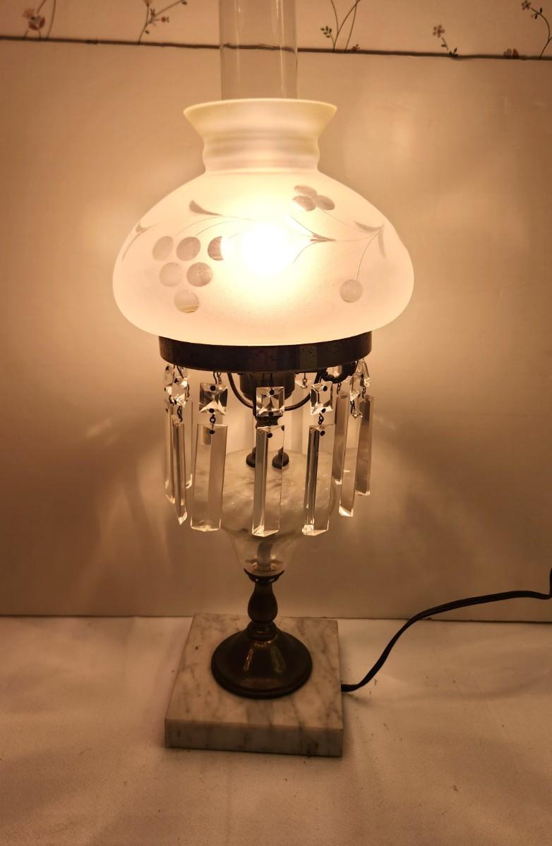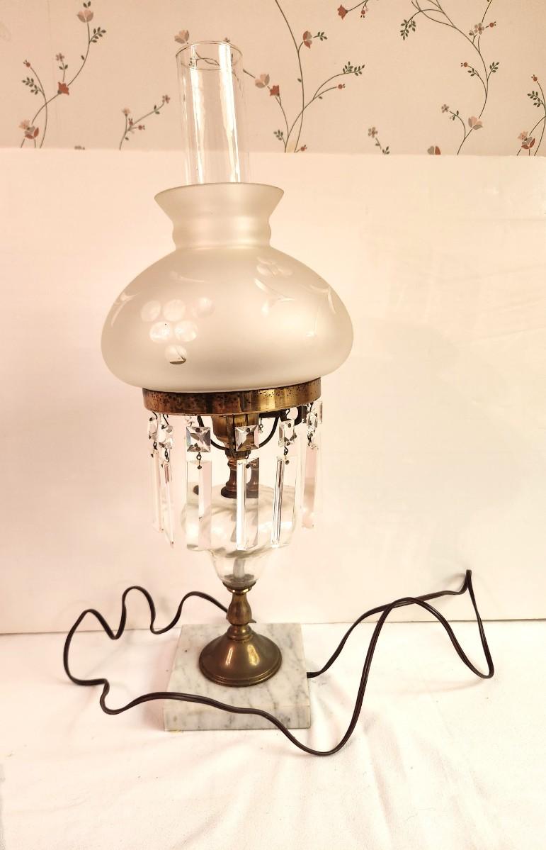 Pretty boudoir lamp - vintage - works, but switch needs replacing. Marble base - crystal accents around frosted glass shade - very pretty. 21" tall.