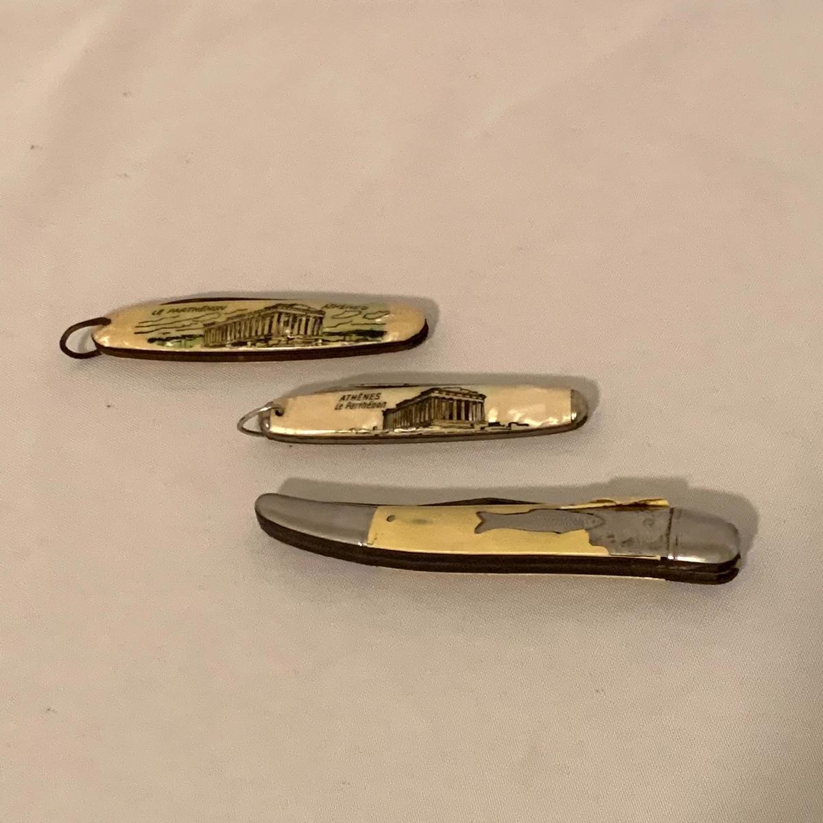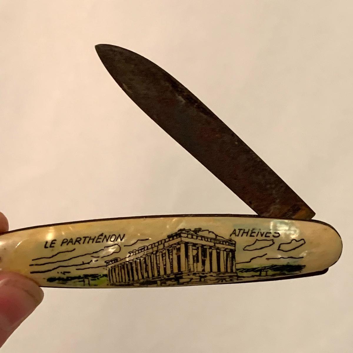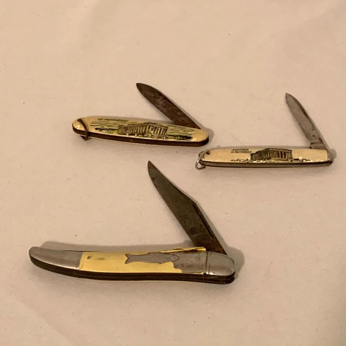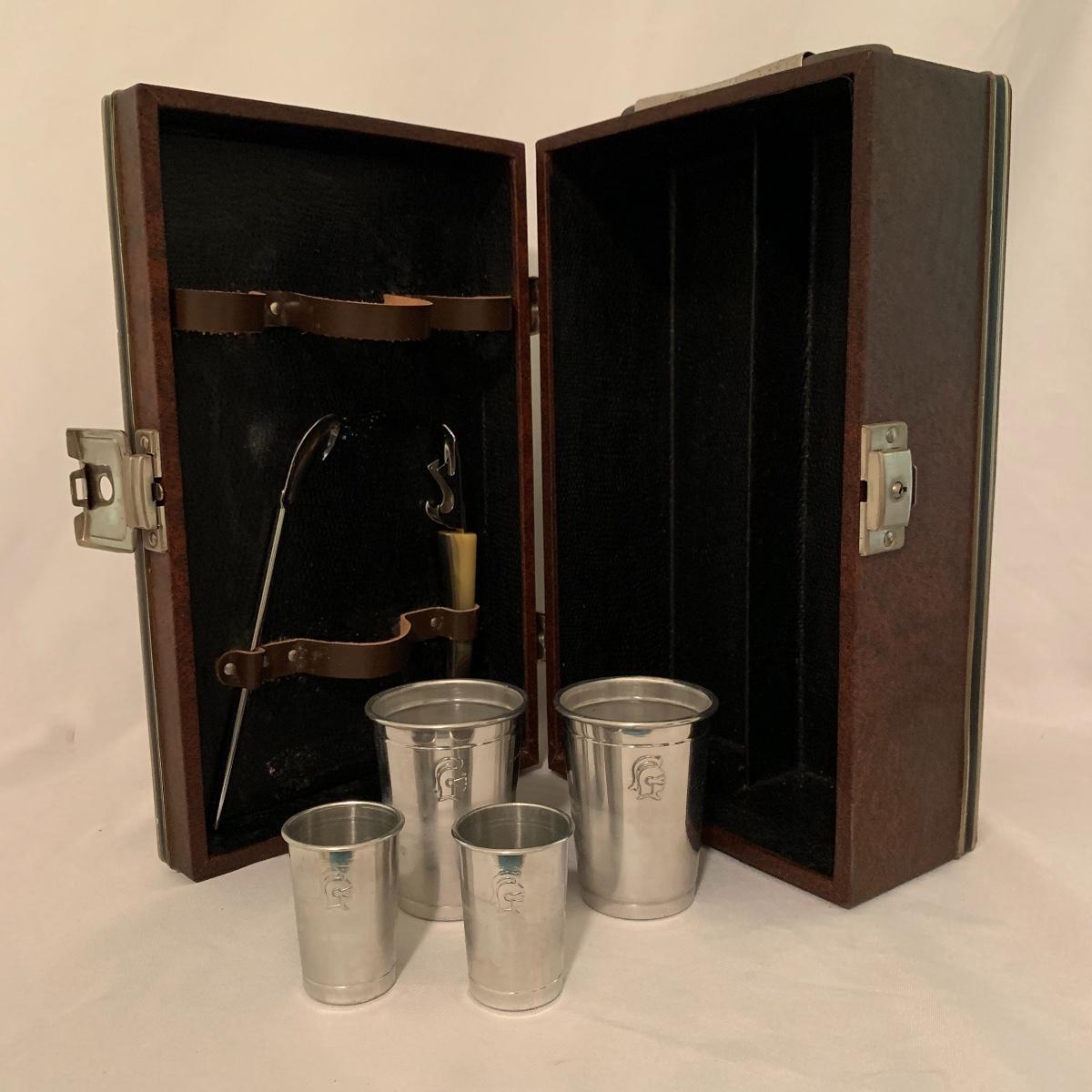 Just in time for Fathers Day, any item in this lot would be a gift cherished by the men in your life (or woman!). A vintage portable travel bar, the Original Trav-L Bar by Ever Wear, comes in a case with a latch and handle for convenient transport to your friend’s party or a picnic. It comes with a stirring spoon, a bottle opener, two metal tumblers, and two metal shot glasses. All it’s missing is your favorite bottle of gin! Or if you want to travel lighter, pour that gin into the vintage metal flask in this collection. It comes with an attached corked flip top lid that screws on. It is imprinted with “Apollo Silver Co”. The lid is dented but functional. There is also a small brass match case, full of matches. It latches and has a little button on the side that opens the lid. Four knives are included. One is in a leather case that says “Mexico”. Three are pocket knives. Two of which have shell handles with Athens Parthenon designs. The metal on the pocket knives is rusted. There is also an iron rifle figurine and an interesting metal whistle with a dragon design. Shipping available.