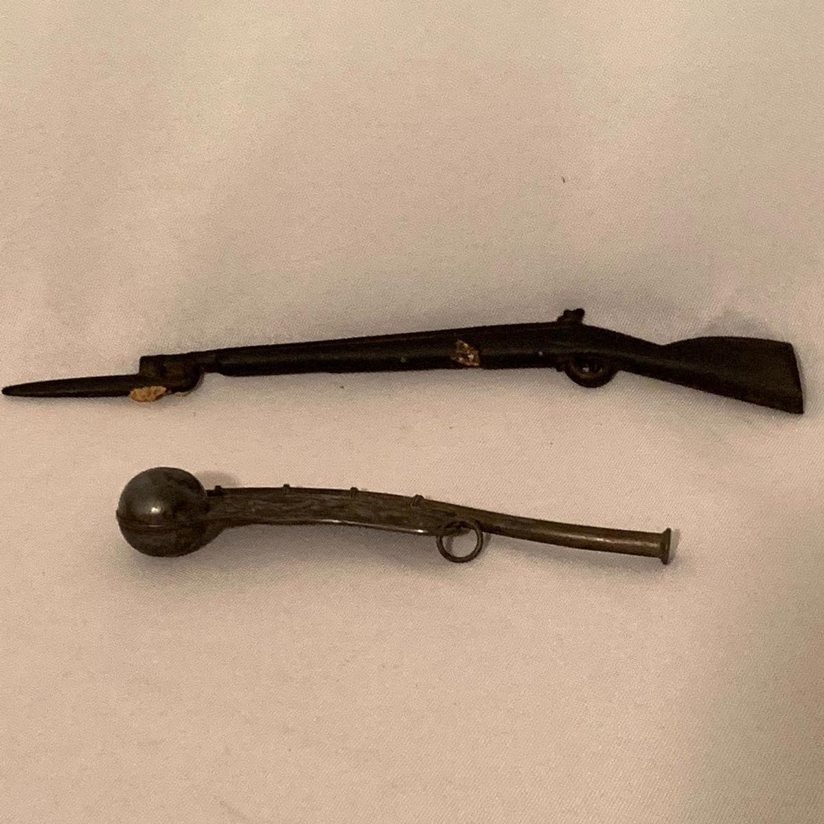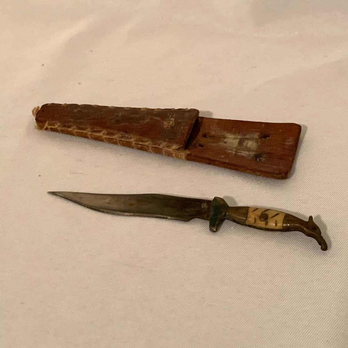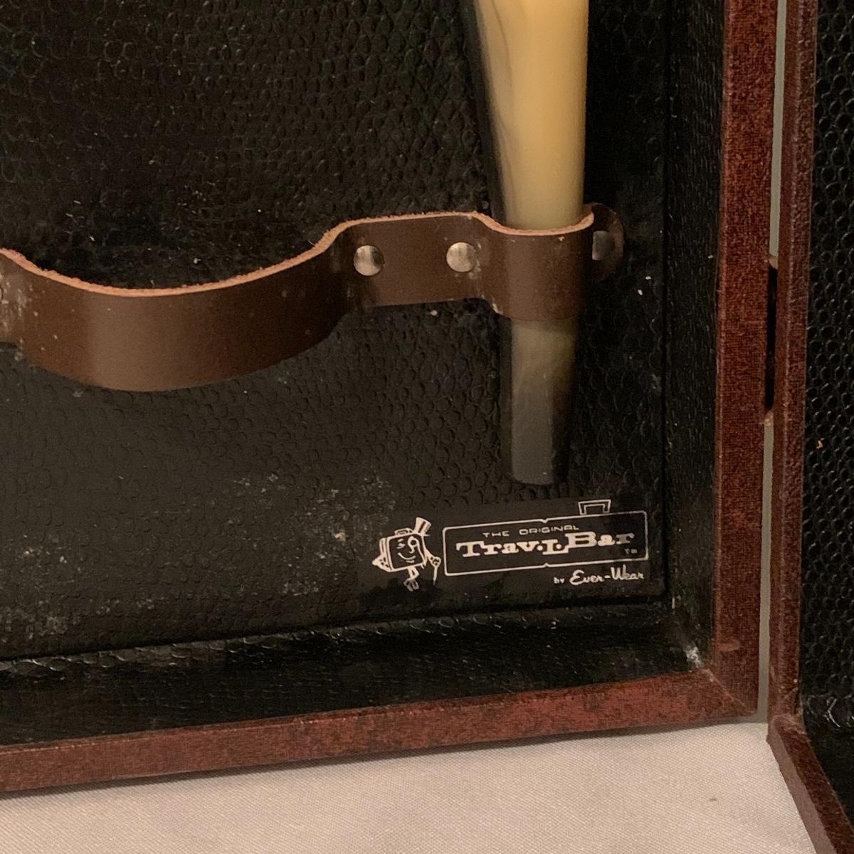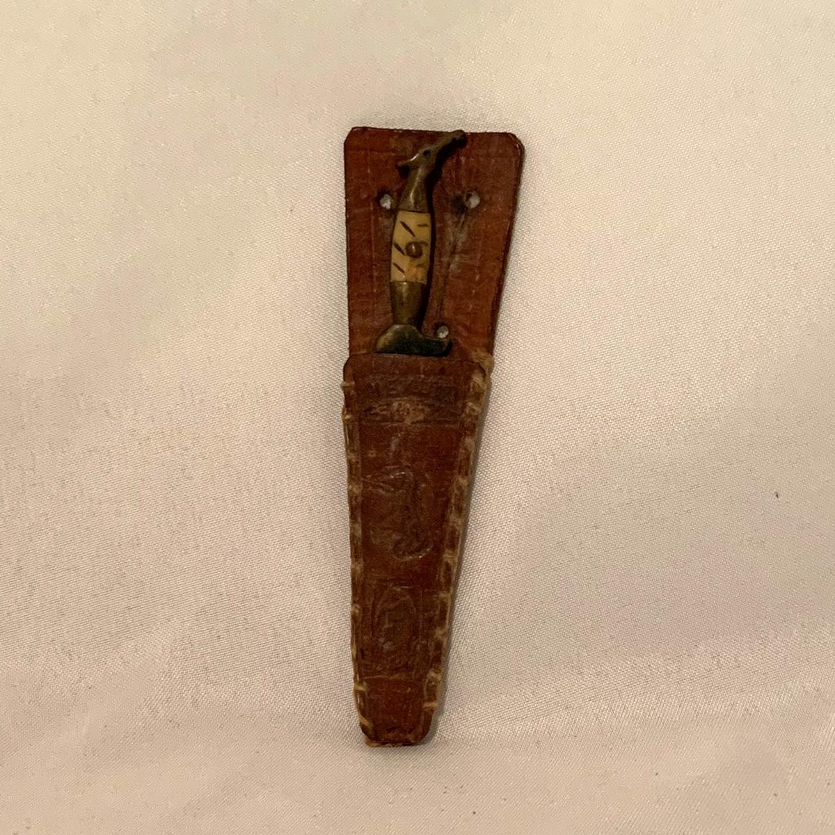Just in time for Fathers Day, any item in this lot would be a gift cherished by the men in your life (or woman!). A vintage portable travel bar, the Original Trav-L Bar by Ever Wear, comes in a case with a latch and handle for convenient transport to your friend’s party or a picnic. It comes with a stirring spoon, a bottle opener, two metal tumblers, and two metal shot glasses. All it’s missing is your favorite bottle of gin! Or if you want to travel lighter, pour that gin into the vintage metal flask in this collection. It comes with an attached corked flip top lid that screws on. It is imprinted with “Apollo Silver Co”. The lid is dented but functional. There is also a small brass match case, full of matches. It latches and has a little button on the side that opens the lid. Four knives are included. One is in a leather case that says “Mexico”. Three are pocket knives. Two of which have shell handles with Athens Parthenon designs. The metal on the pocket knives is rusted. There is also an iron rifle figurine and an interesting metal whistle with a dragon design. Shipping available.