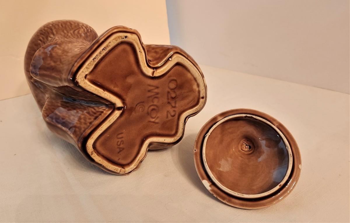 Cute vintage (collectible) McCoy pottery cookie jar - 10.5" tall. Please check all photos. Small old chigger to the inside of the lid - does not show when displayed.