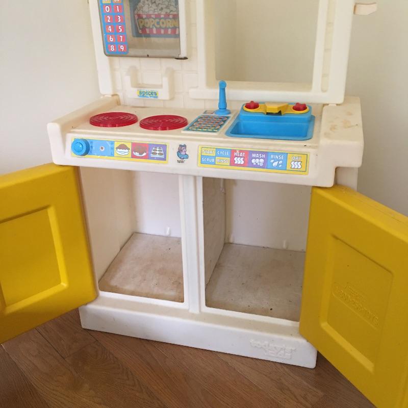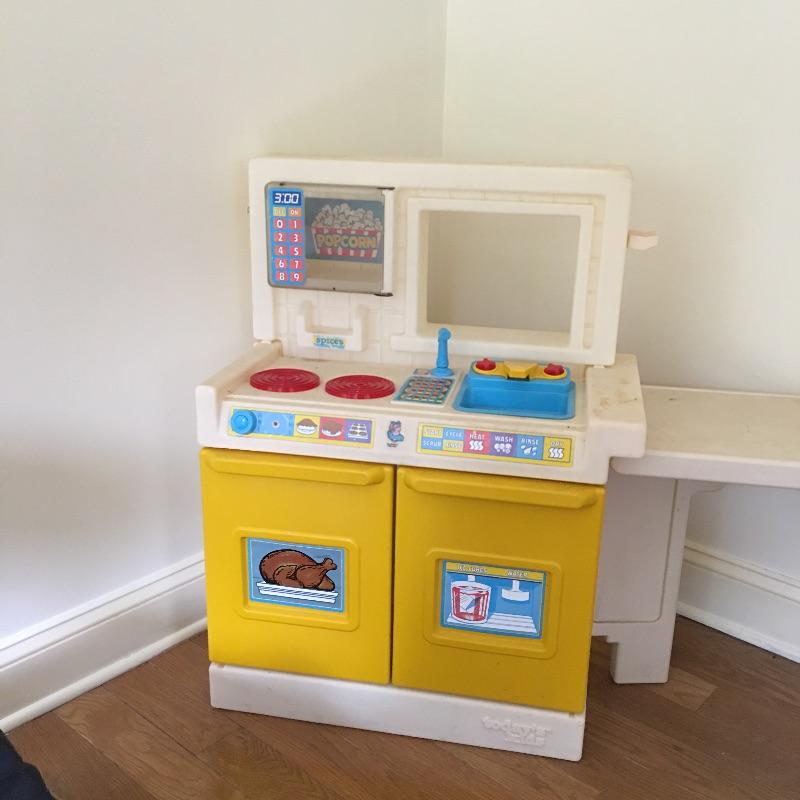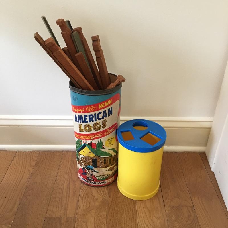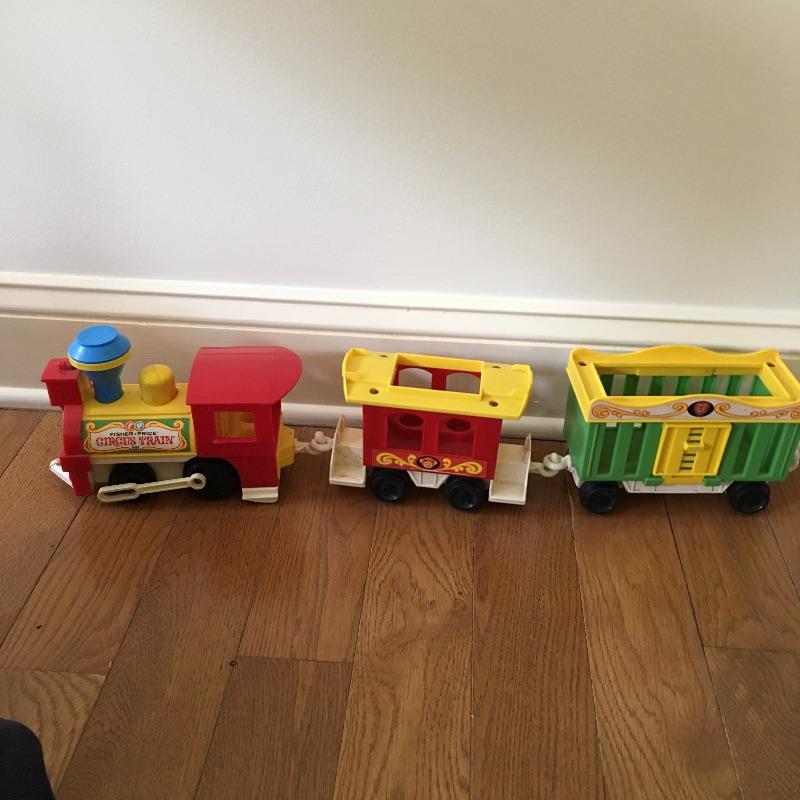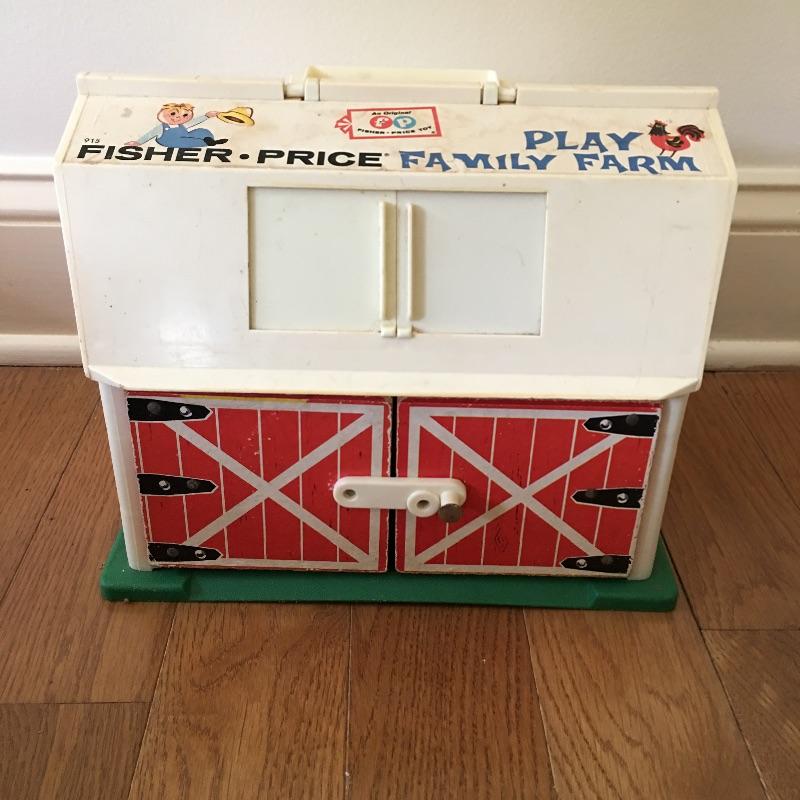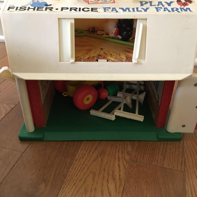 Vintage toys and more. Lot includes kitchen set, Fisher Price barn and train, coloring books, Smurfs metal lunch box, ceramic tea set and bowl, America the Beautiful book and more. These items may be vintage, but they have a lot of life left in them!