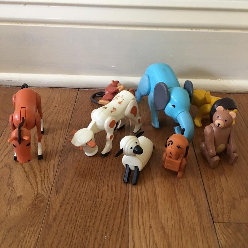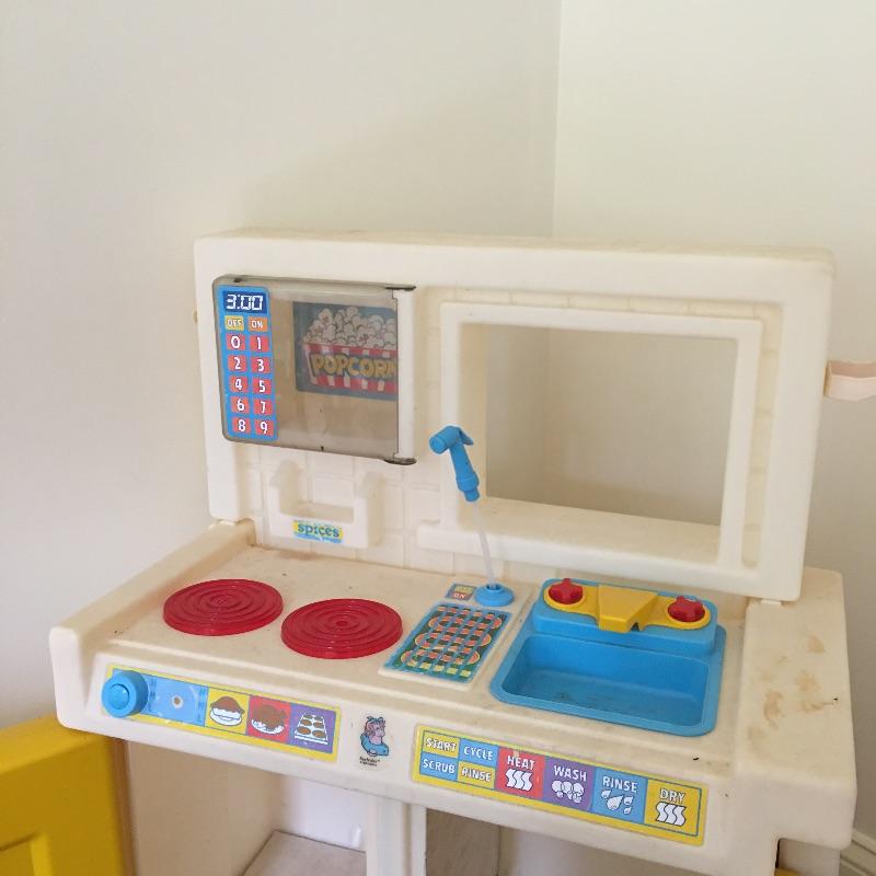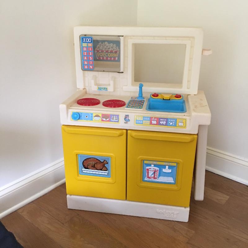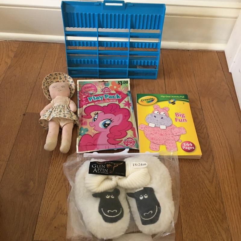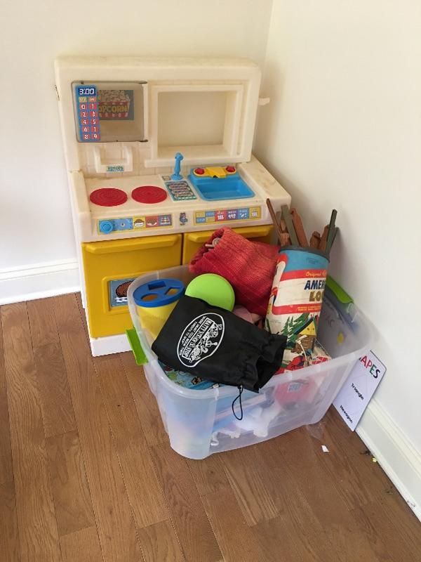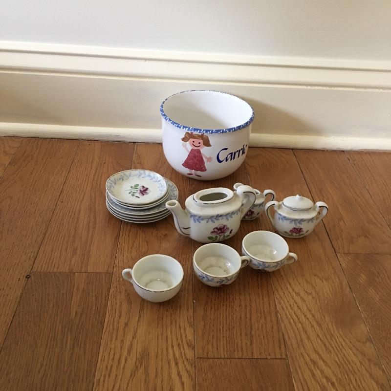 Vintage toys and more. Lot includes kitchen set, Fisher Price barn and train, coloring books, Smurfs metal lunch box, ceramic tea set and bowl, America the Beautiful book and more. These items may be vintage, but they have a lot of life left in them!