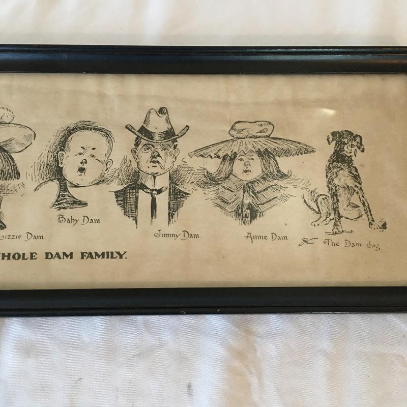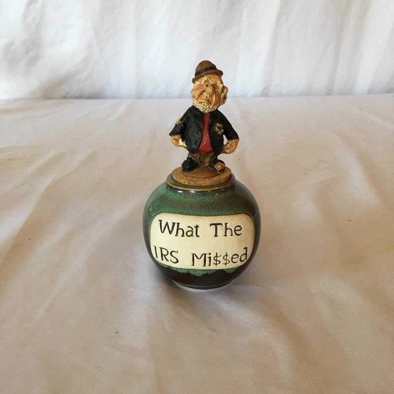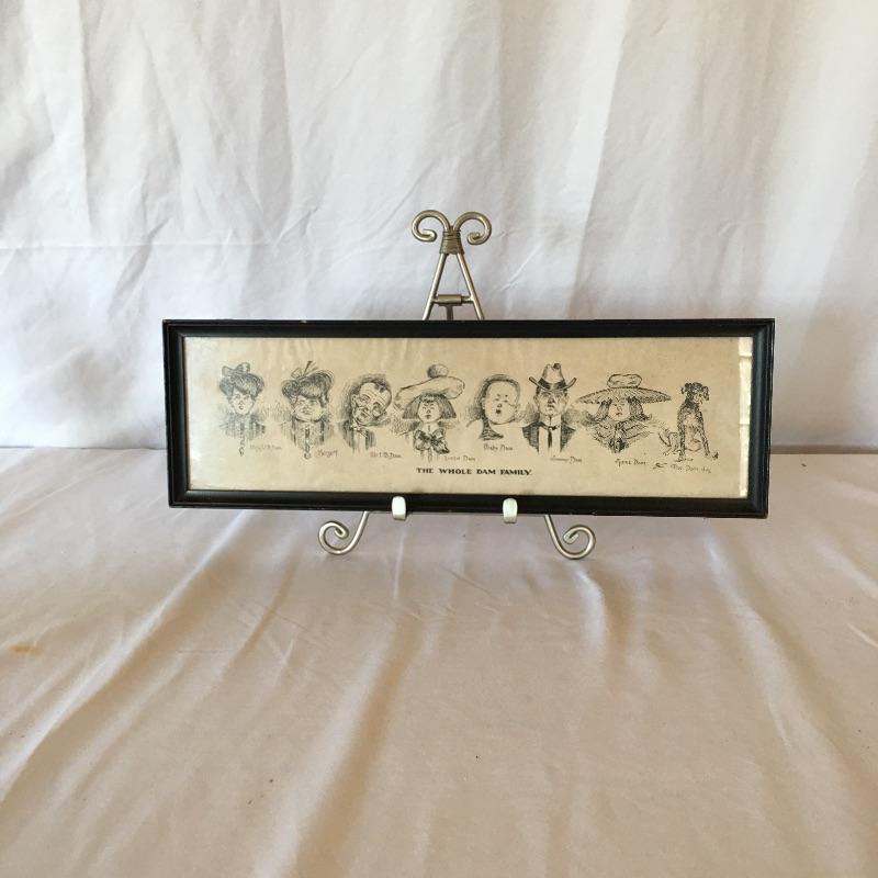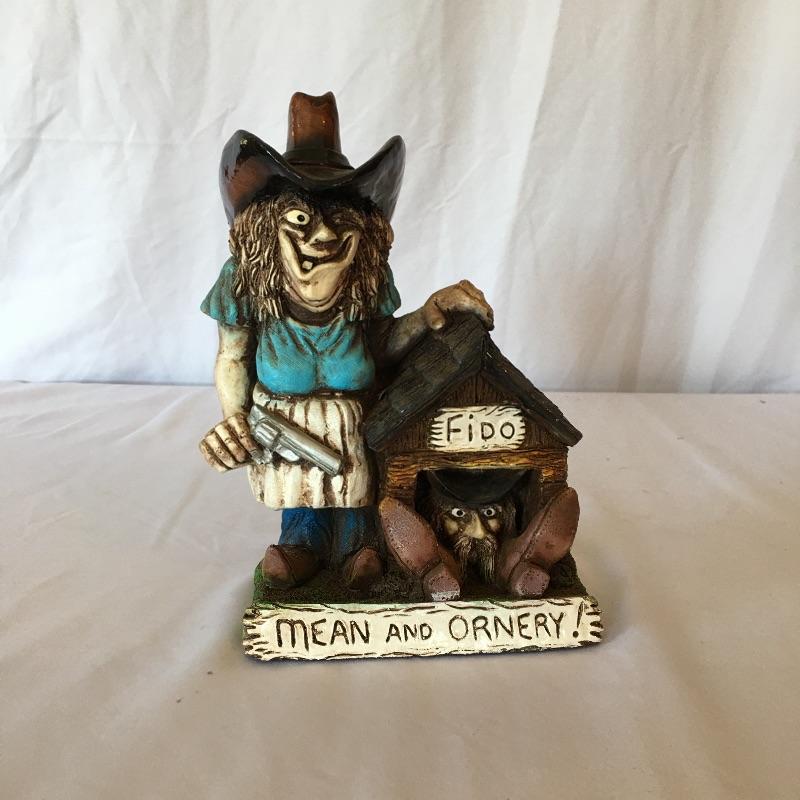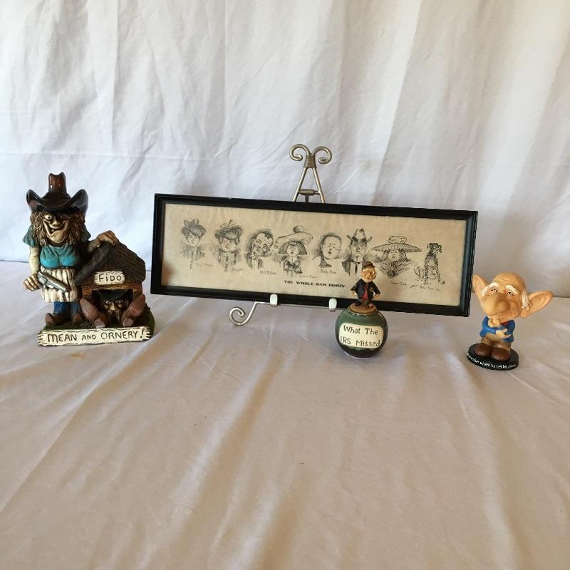 A great lot for Christmas gifts! This whimsical array includes a funny framed piece of art titled "The Whole Dam Family", What the IRS Missed jar, Bill Vernon "Mean and Ornery" collectible figurine and a Coots piece titled “Glasses”. Frame measures 5.75” x 17.75”.