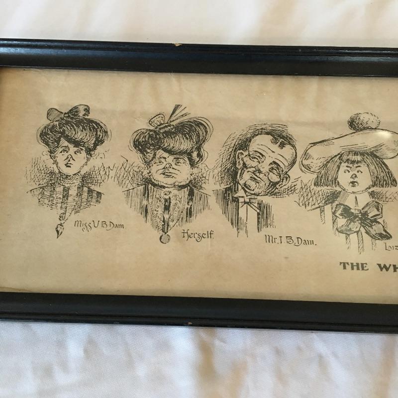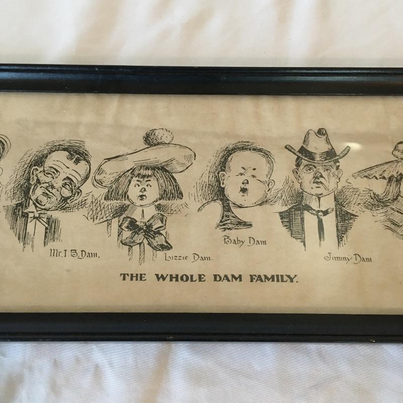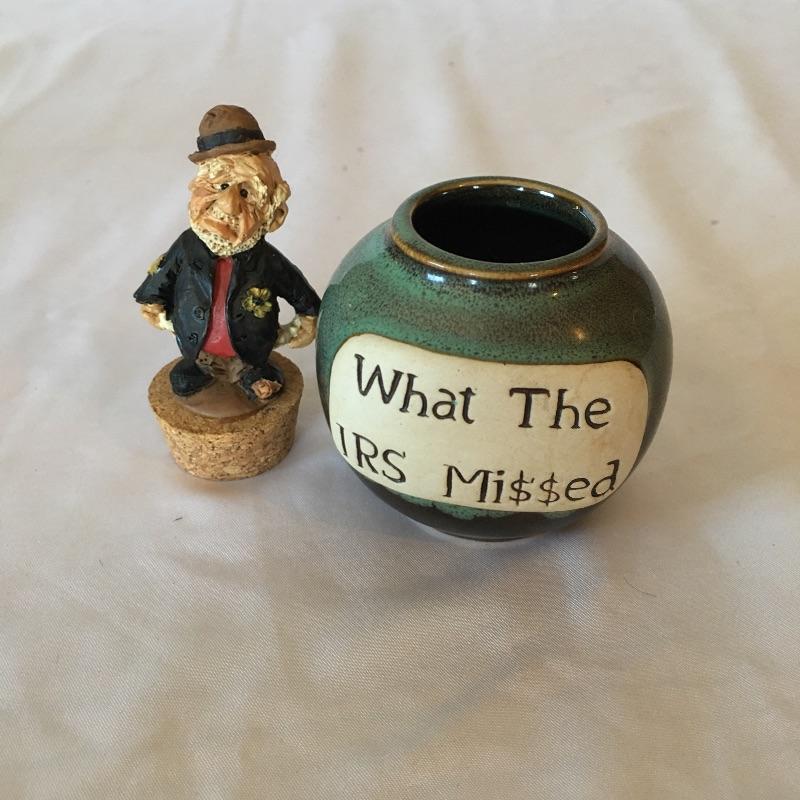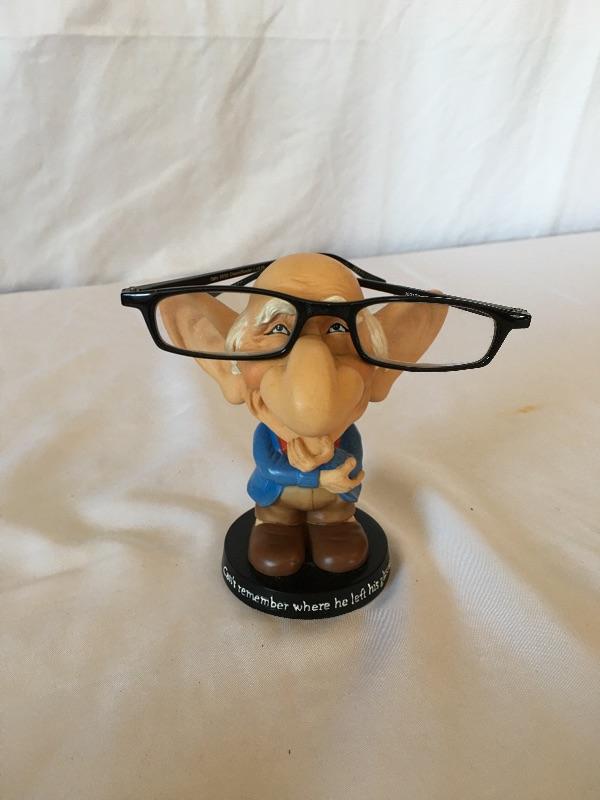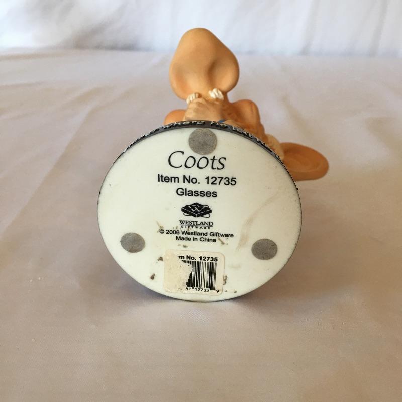 A great lot for Christmas gifts! This whimsical array includes a funny framed piece of art titled "The Whole Dam Family", What the IRS Missed jar, Bill Vernon "Mean and Ornery" collectible figurine and a Coots piece titled “Glasses”. Frame measures 5.75” x 17.75”.