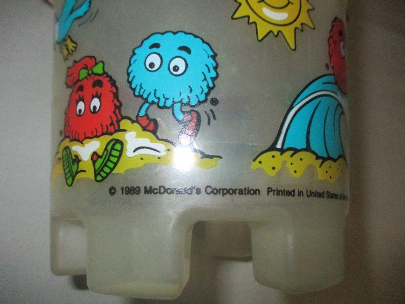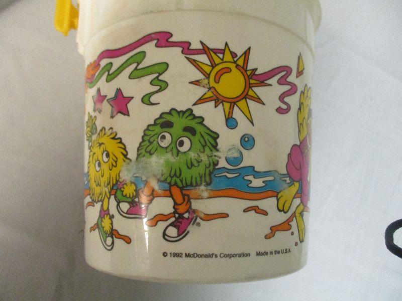 The clear bucket is 1989 and the paint is in very good condition. The opaque bucket is from 1992 and has a paint smudge (rubbing wear) on one of the green guys. This brings back memories - I had forgotten that they had given away plastic buckets!
