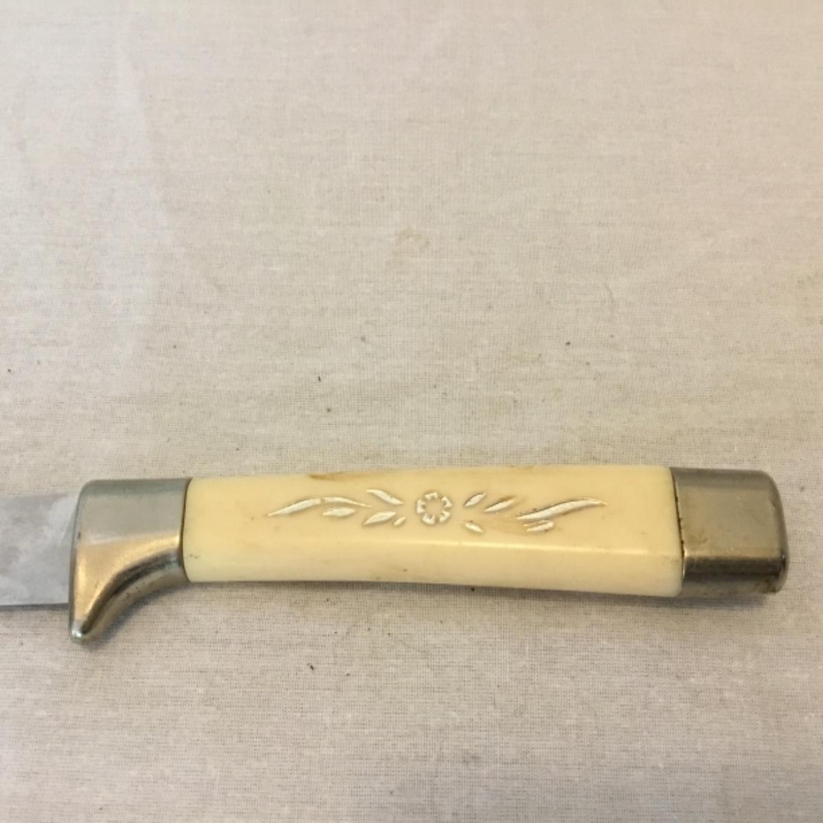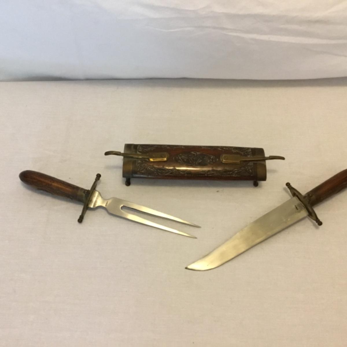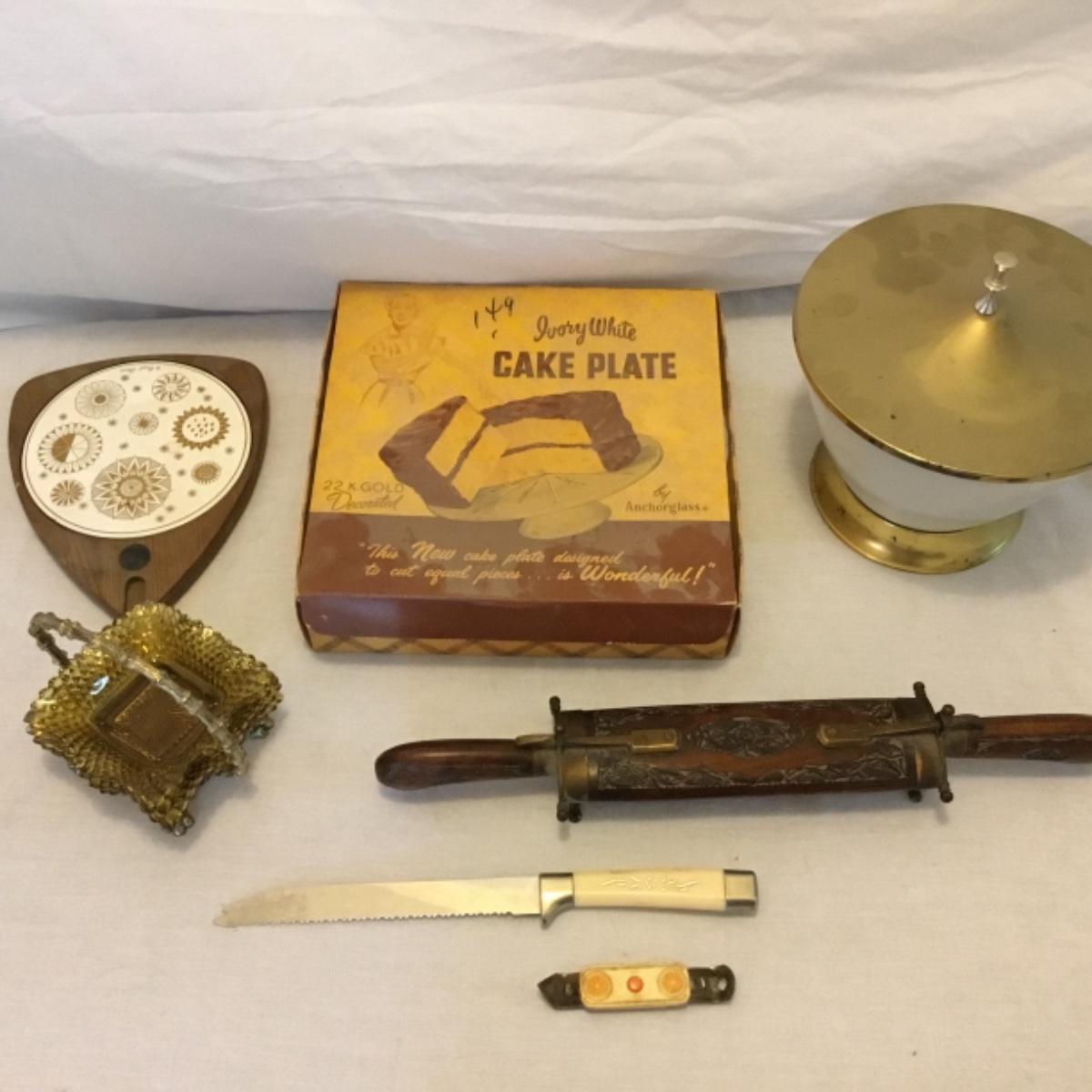 70's era entertainment lot includes cake plate with a diameter of 10". See photos for adorable design and details. Lot also includes an ice bucket, coasters, vintage bottle opener, and pot holder. Additionally includes a knife and a complete carving set in an ornate case. See photos! No shipping