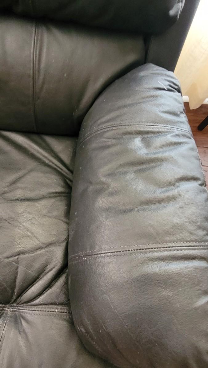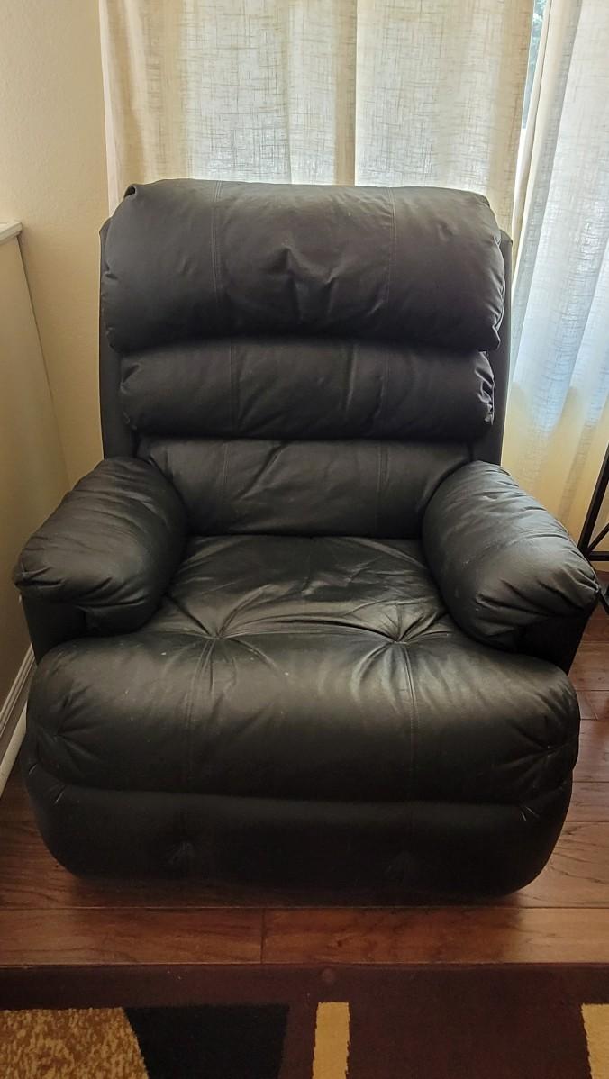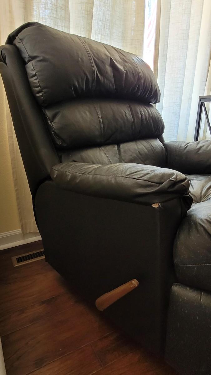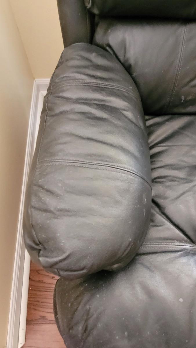 Older Recliner has a few spots on the seat and a spot on the corner where the leather has come untucked (shown in photos). Still has some life left and with some leather cleaner could restore nicely.