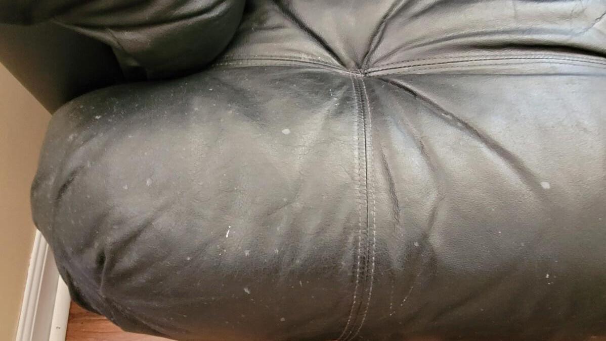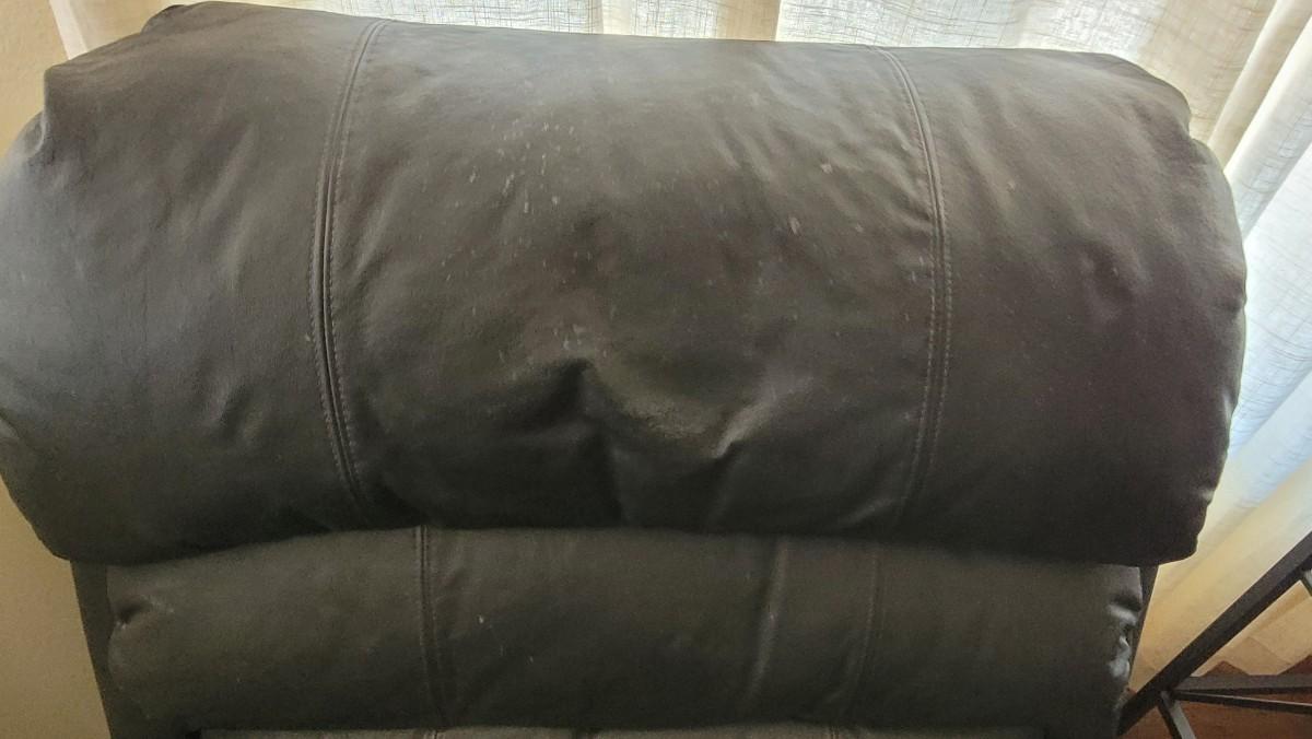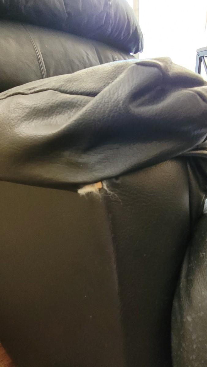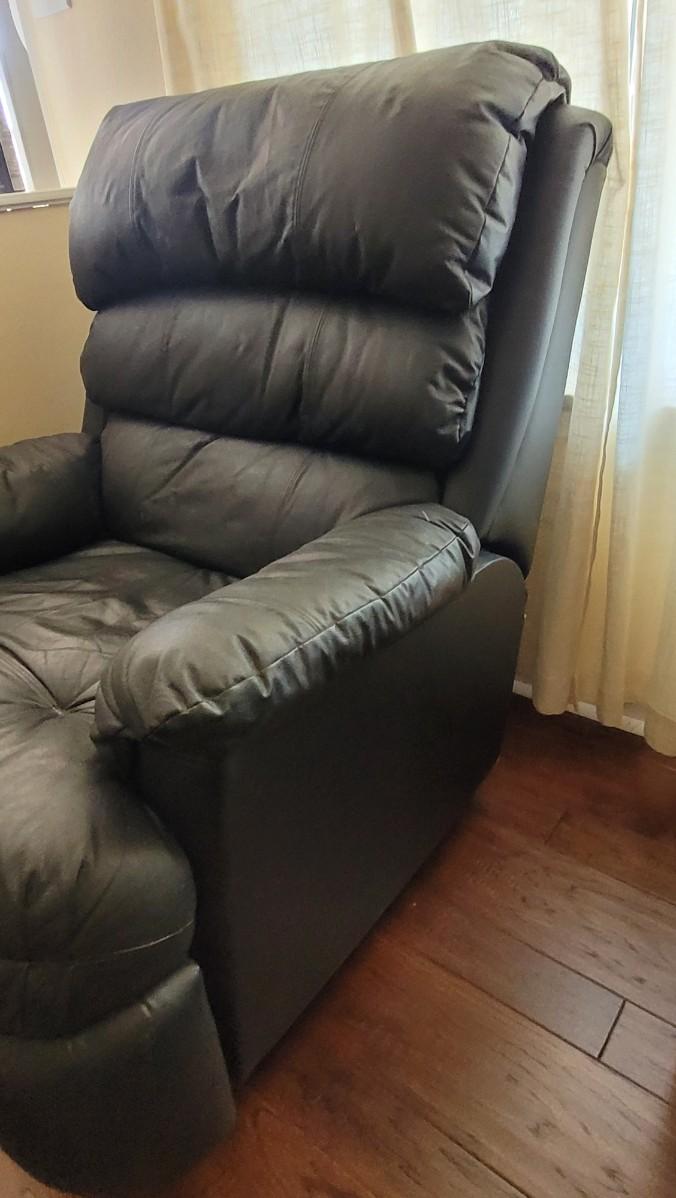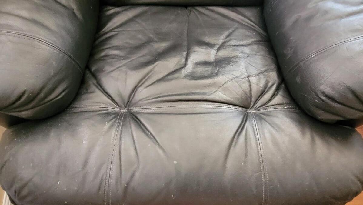 Older Recliner has a few spots on the seat and a spot on the corner where the leather has come untucked (shown in photos). Still has some life left and with some leather cleaner could restore nicely.