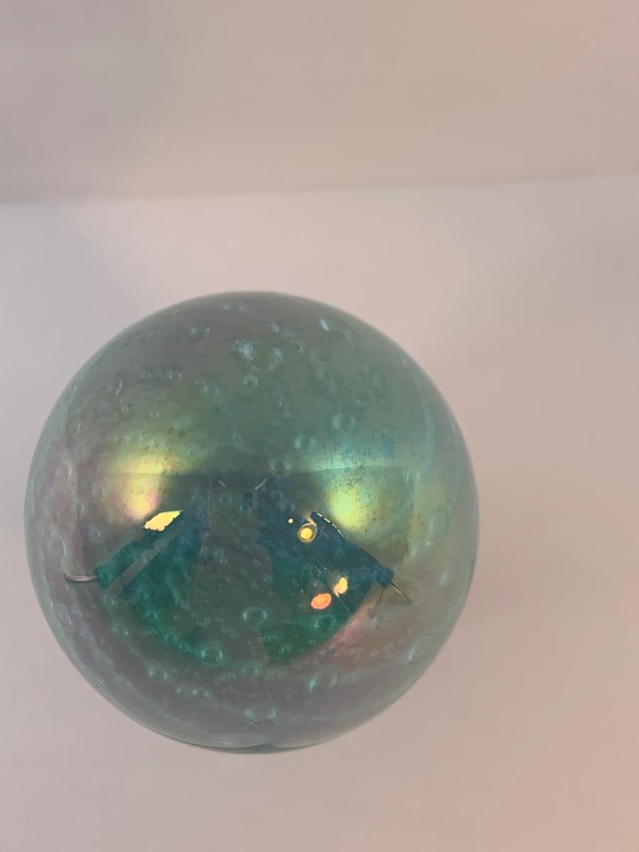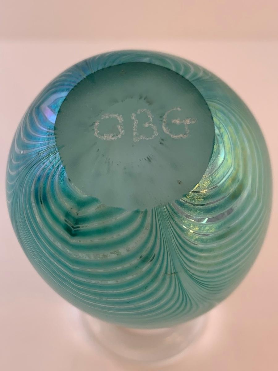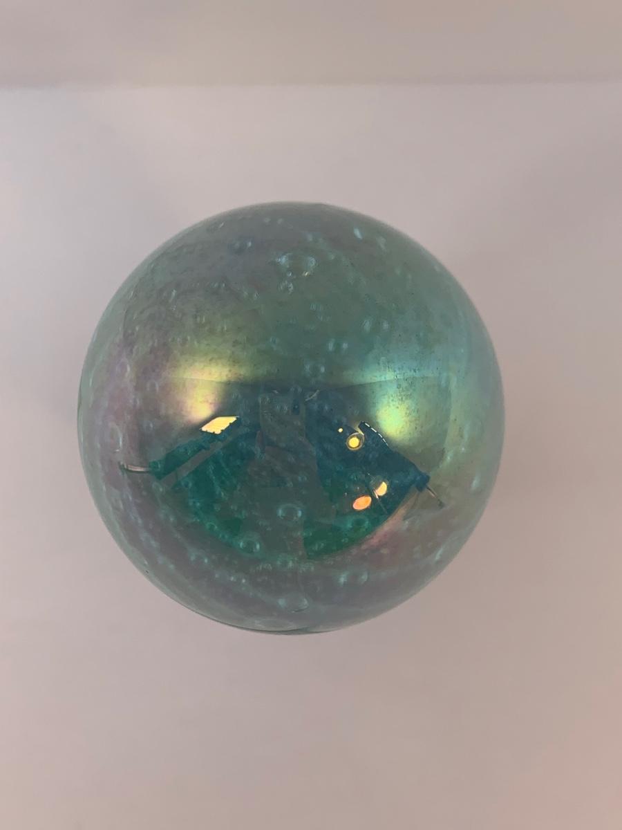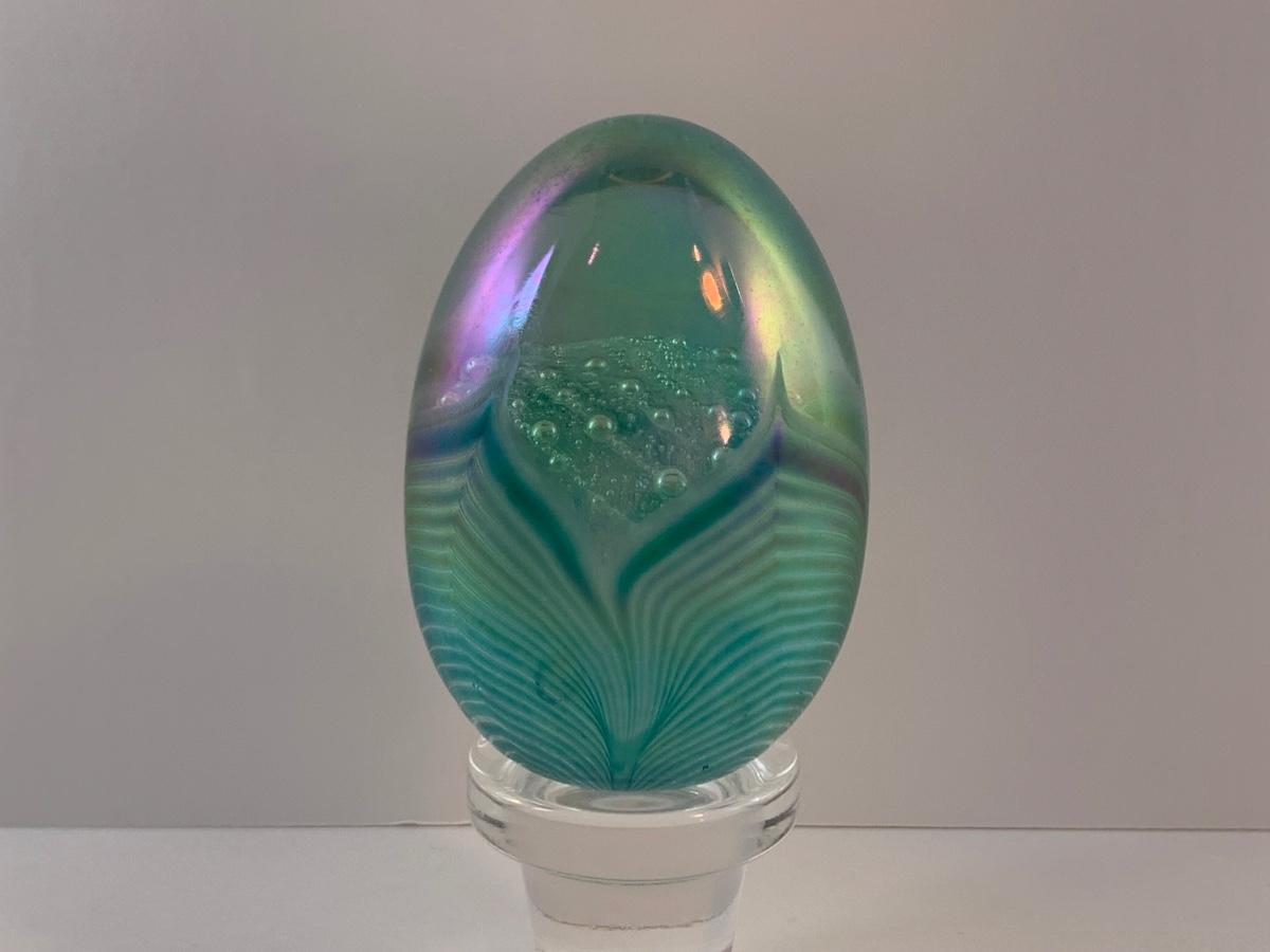 Oregon Blown Glass pulled feather iridescent green egg shaped paperweight. On bottom "OBG", 1 3/4" x 2 3/4"