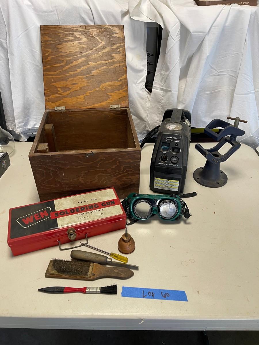 Lot 60 - Oak Box and Various Tools/ Goggles etc