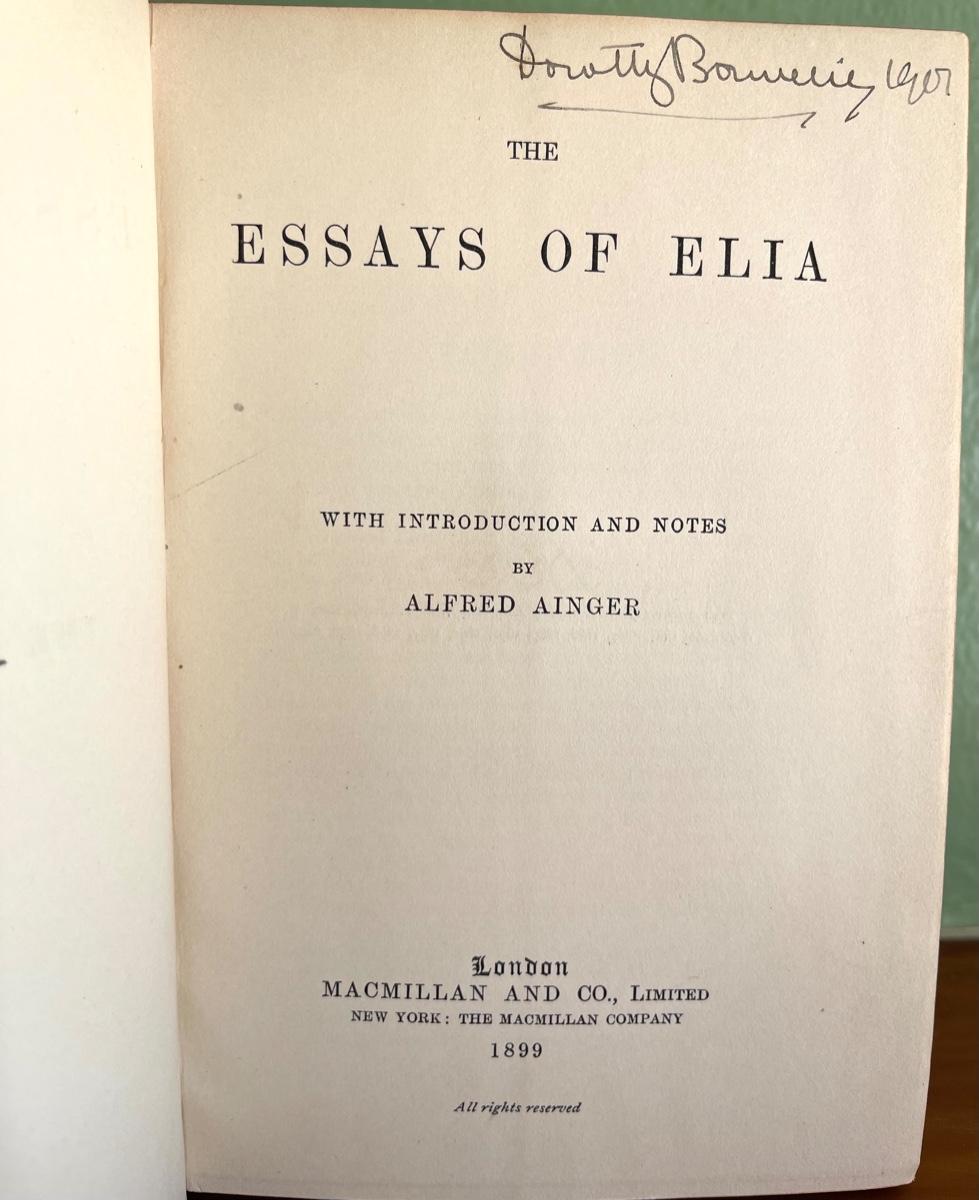 LOT 60 - Essays of Elia with introduction and notes by Alfred Ainger. This book was originally owned by David's mother, Dorothy Bouverie with her name written on the second page along with a 1901 date. 1899 Publication date. Overall good condition with some light wear to cover edges. This book was part of the David-Pleydell-Bouverie library at Bouverie Ranch in Glen Ellen. This item can be viewed at our Green + Cate Showroom in Sebastopol from July 15th - July 18th between the hours of 9am-5pm. For the benefit of the Bouverie Preserve of Audubon Canyon Ranch.