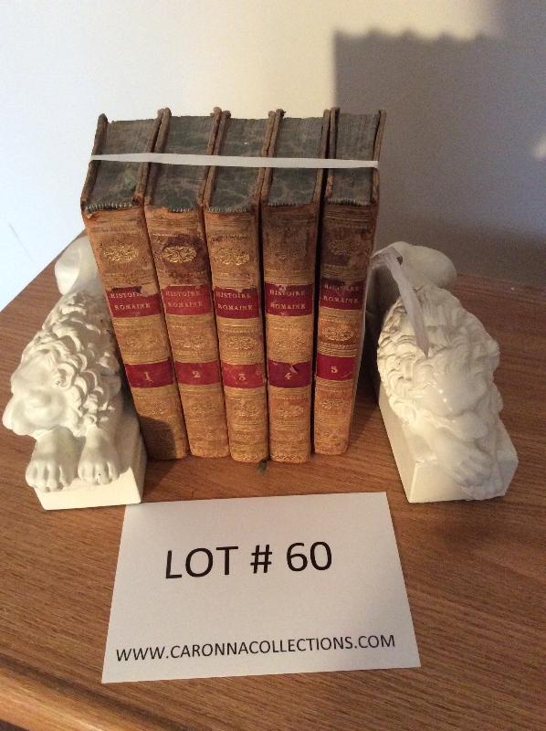 set of 5 antique Histoire Romaine Books with heavy Lion Bookends