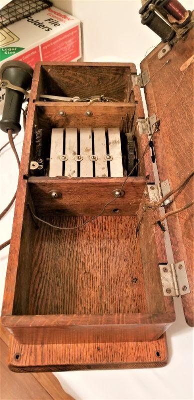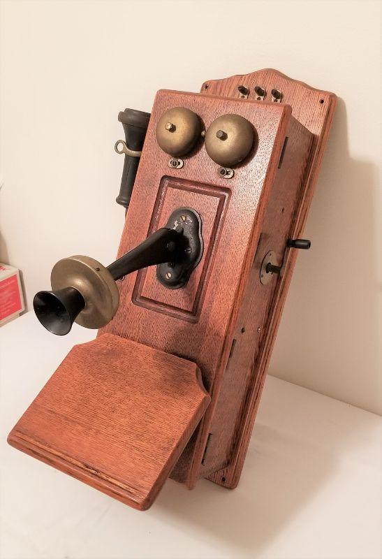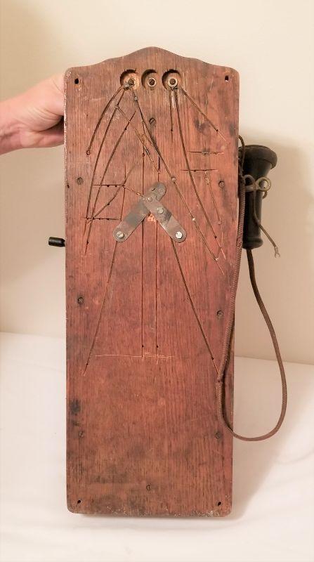 This antique oak telephone has a great decorative look, or take it on as a restoration piece. All original. Note: receiver/ear piece bottom not attached but present. 22" tall, 7.5" wide and 5.5" deep.