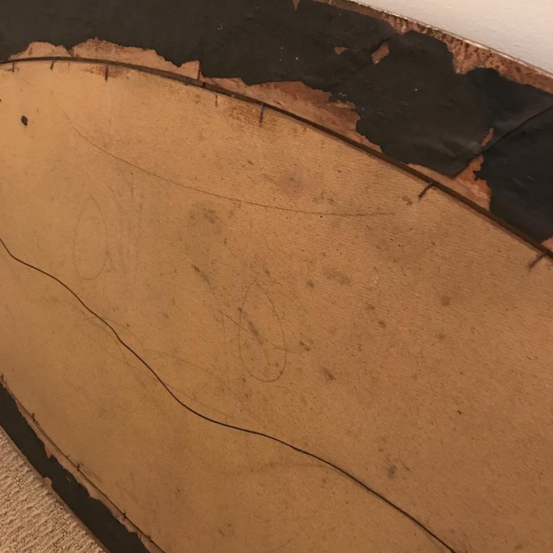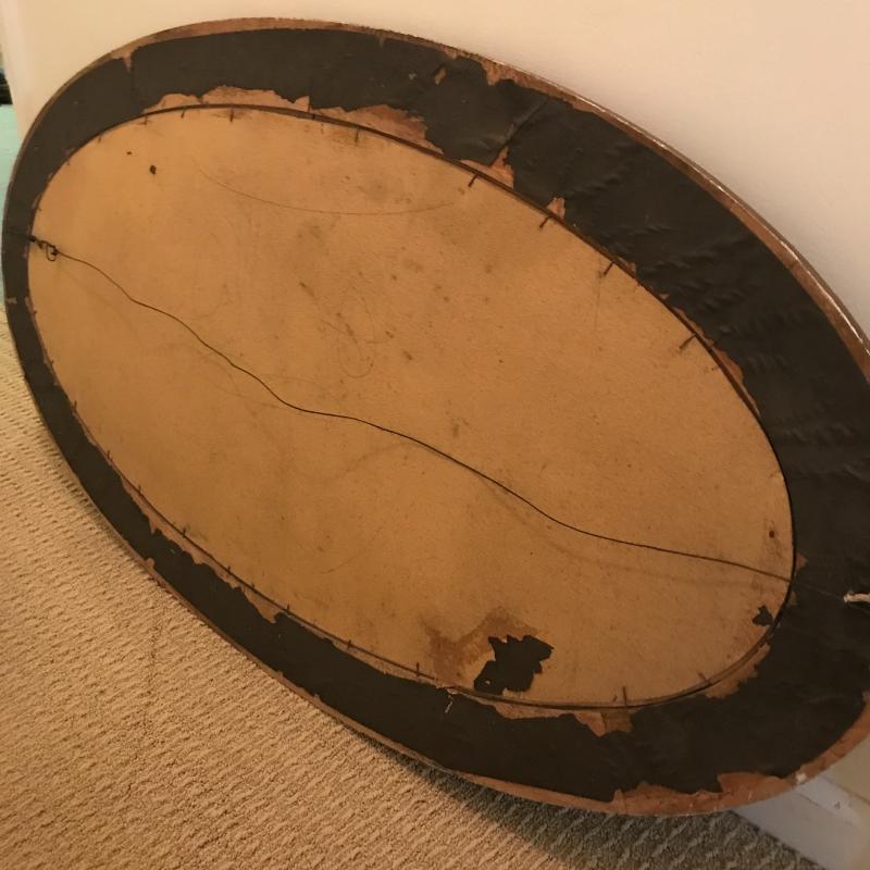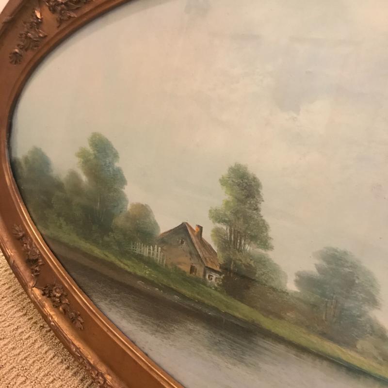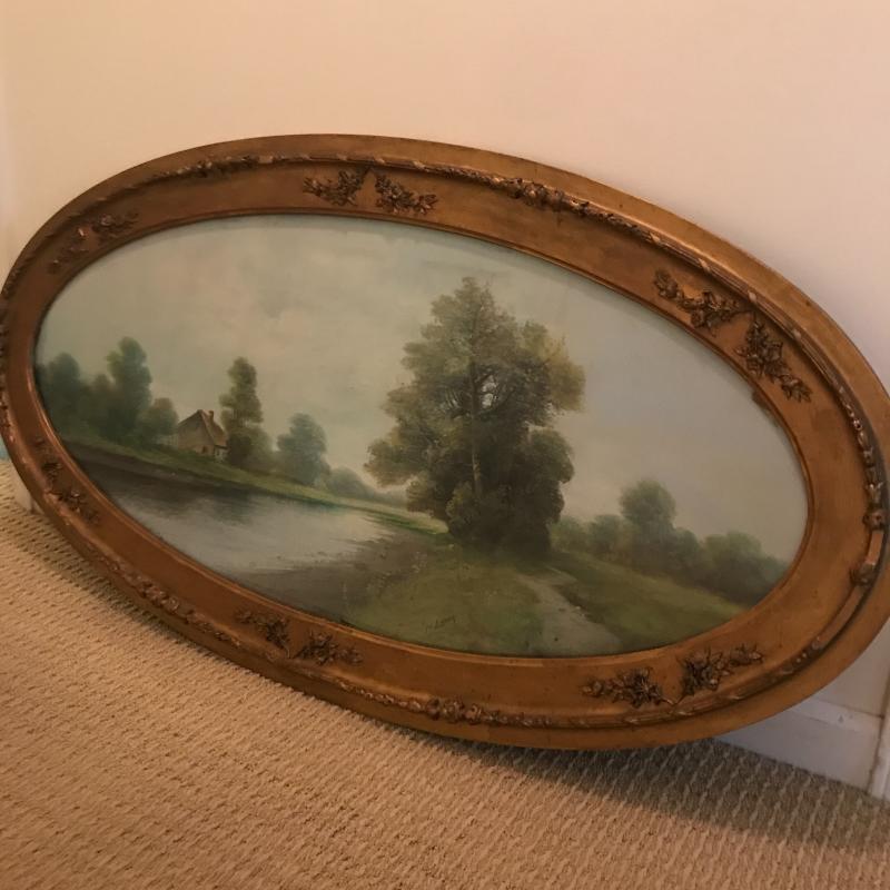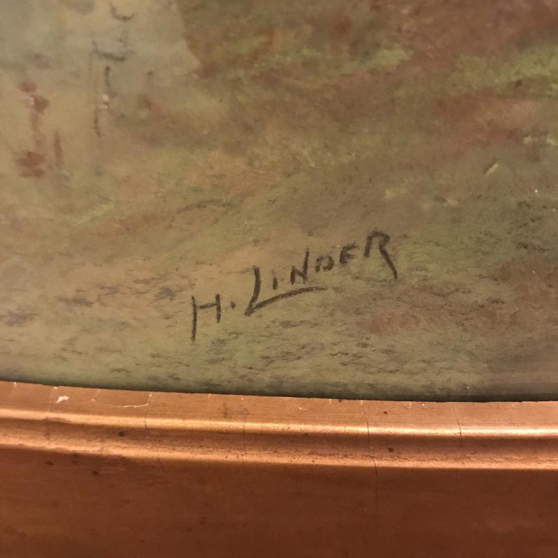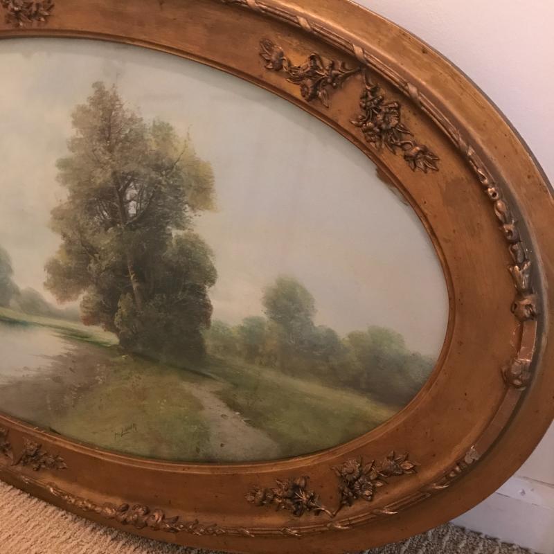 Large oval gold-painted framed H. Linder Art. Measures 45” x 24”.