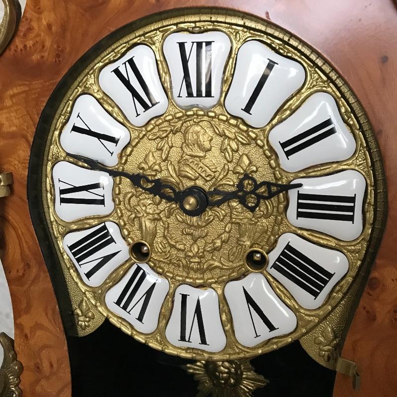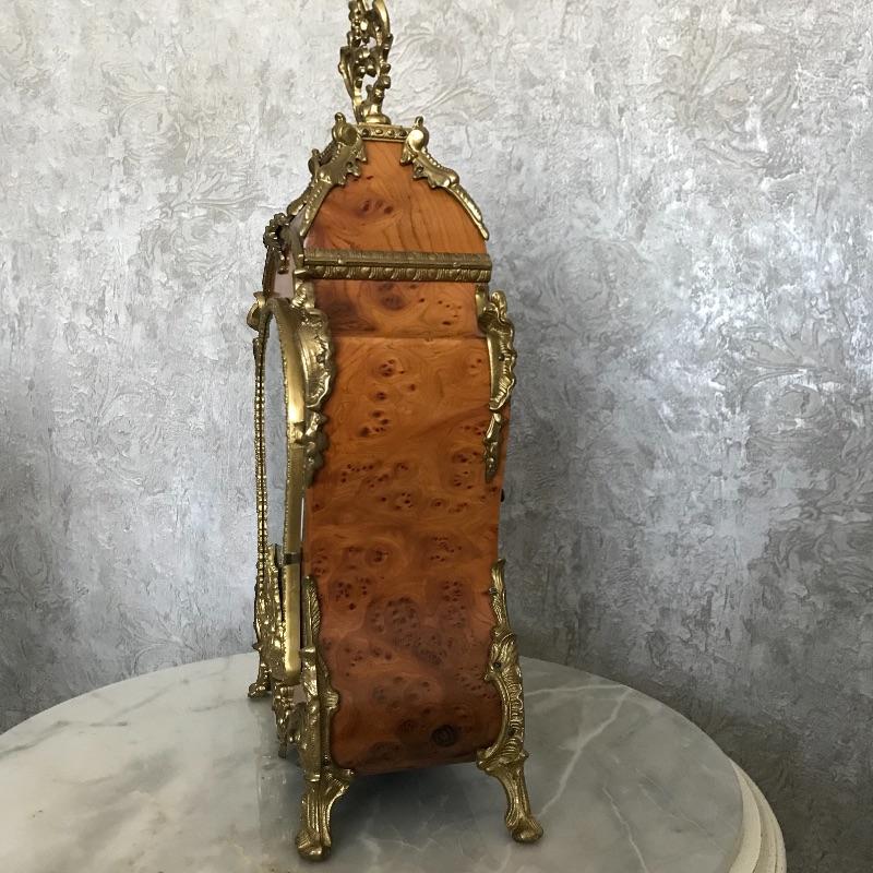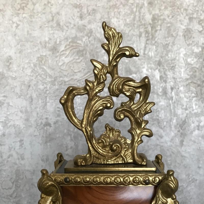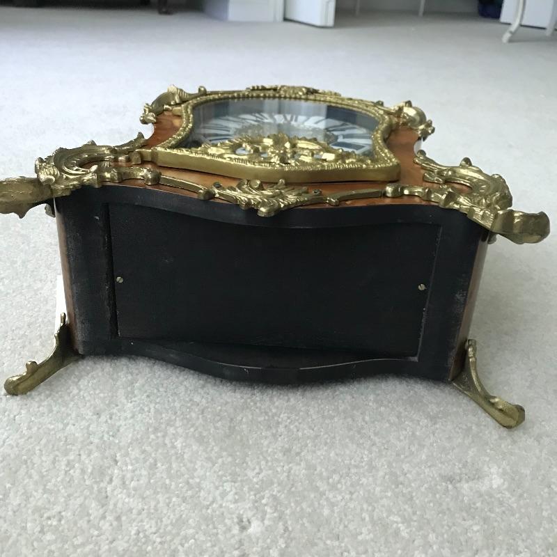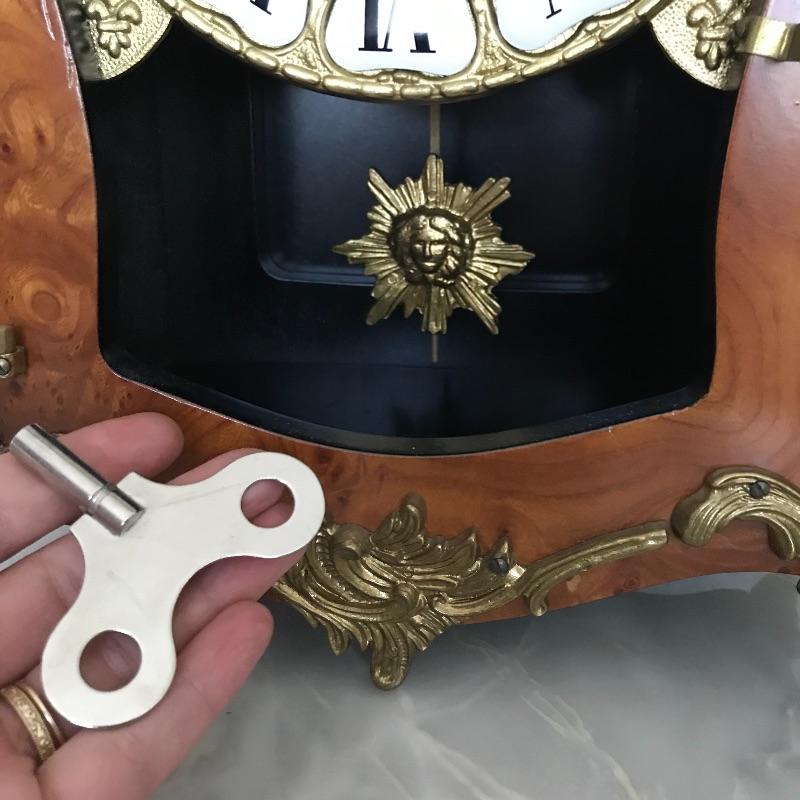 Elegant wood mantel clock with golden metal accents throughout. The wood grain is stunning and clock is complete with key. Working condition and whether or not it needs a tune up is unknown. Clock measures 10” x 5.75” x 22”. Shipping available. Please call UPS with dimensions at 828-252-6930 for a shipping quote prior to bidding.