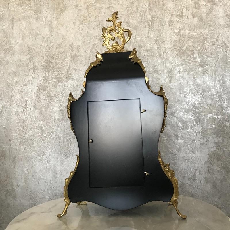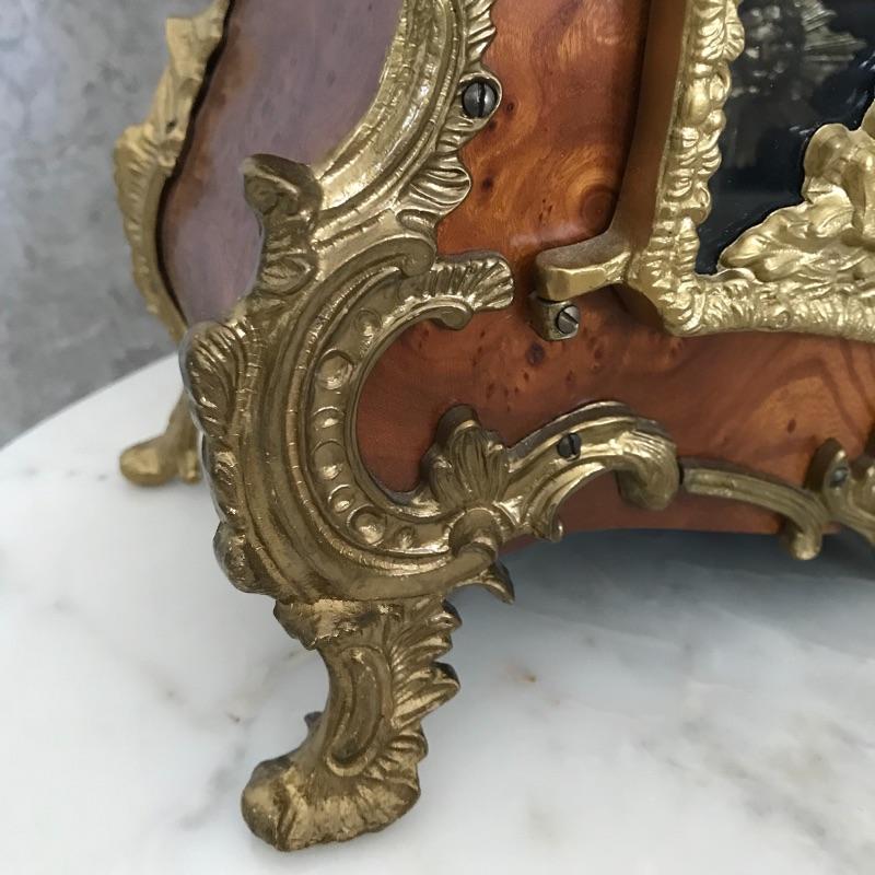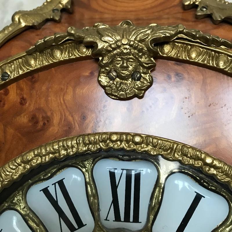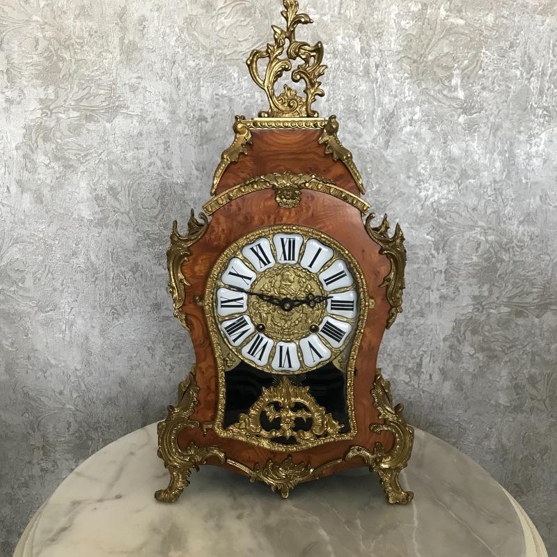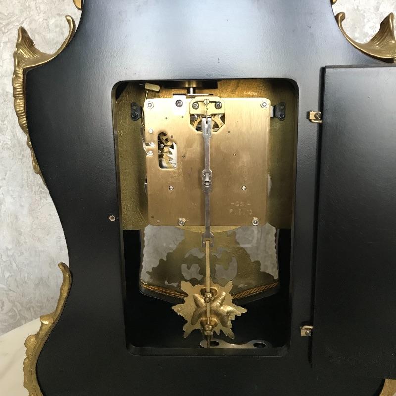 Elegant wood mantel clock with golden metal accents throughout. The wood grain is stunning and clock is complete with key. Working condition and whether or not it needs a tune up is unknown. Clock measures 10” x 5.75” x 22”. Shipping available. Please call UPS with dimensions at 828-252-6930 for a shipping quote prior to bidding.