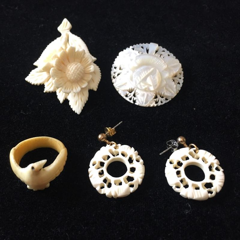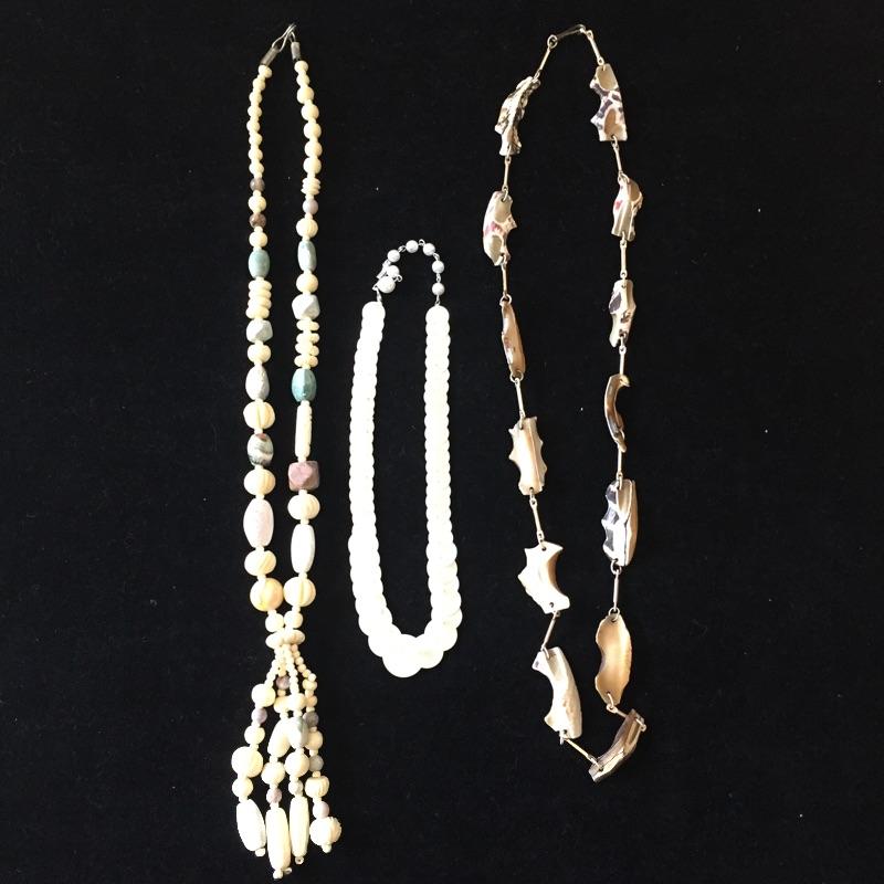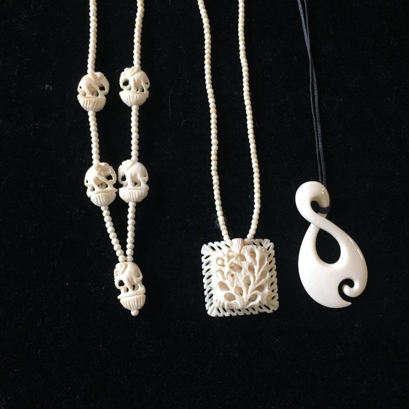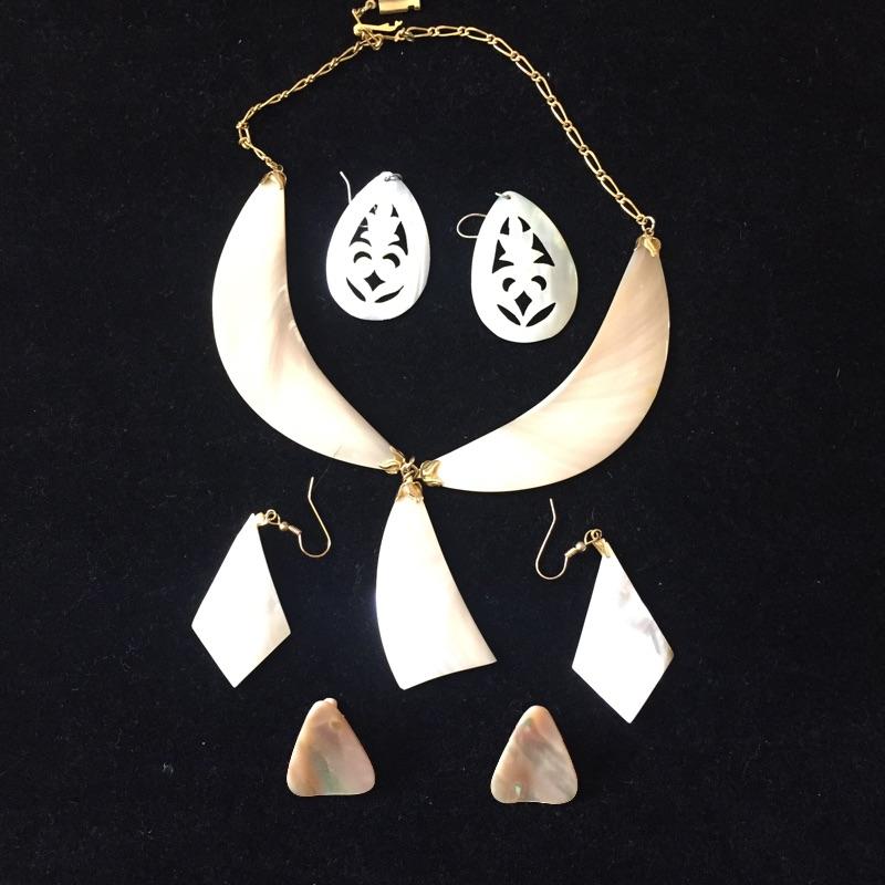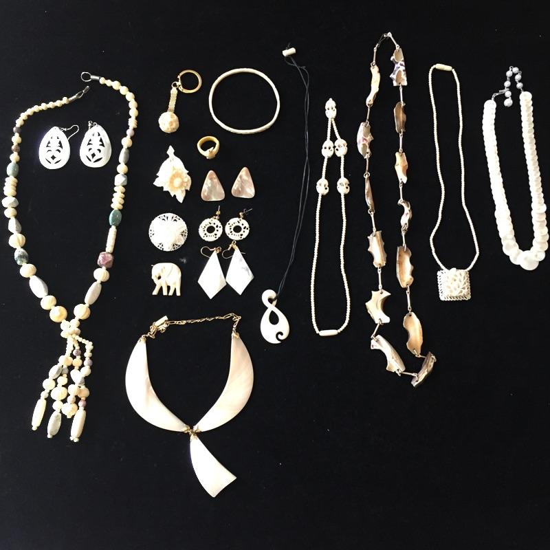 Large selection of carved and shell jewelry including keychain, earrings, necklaces and more.