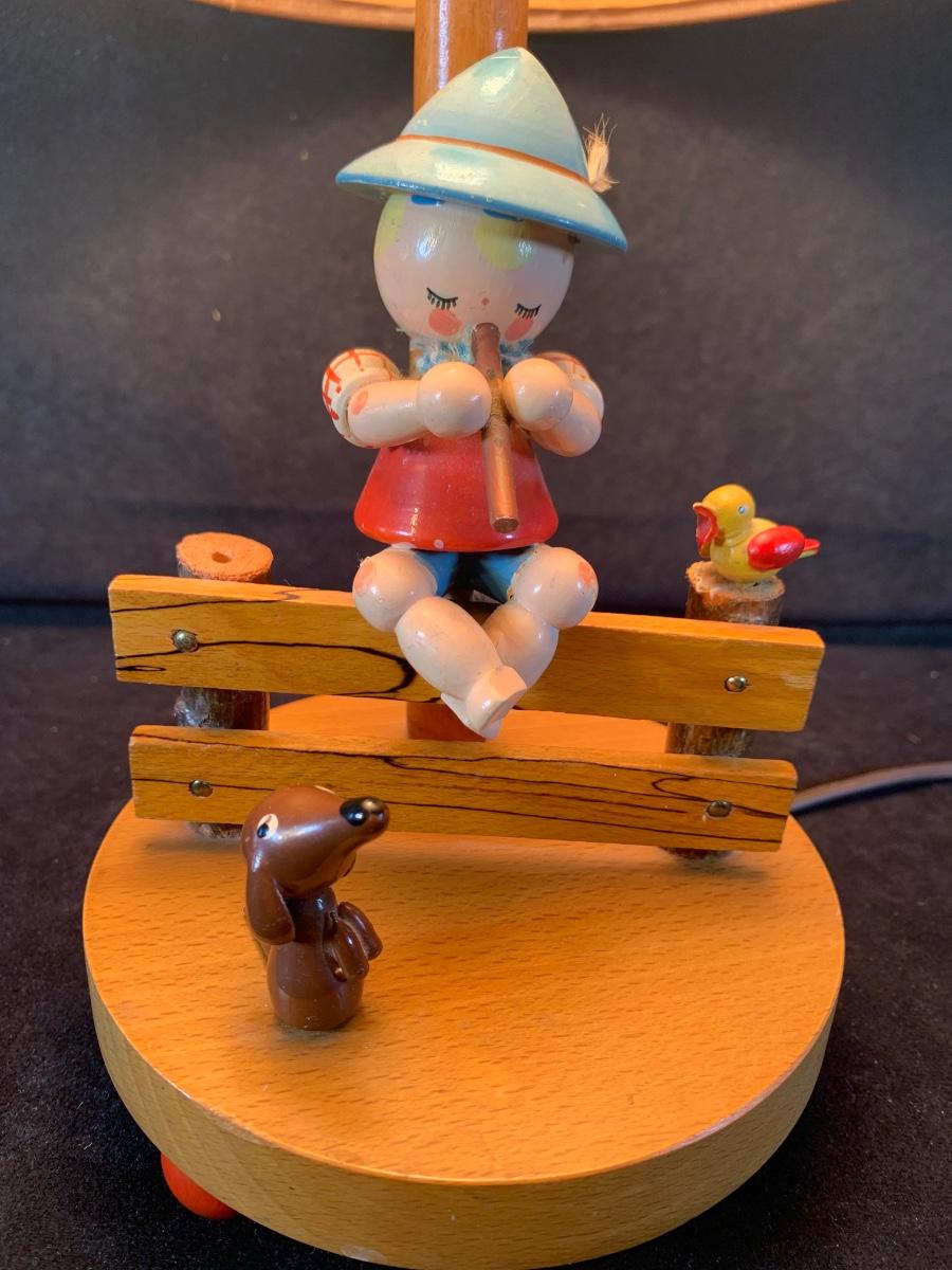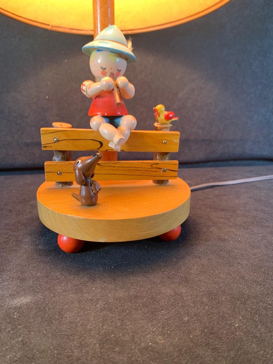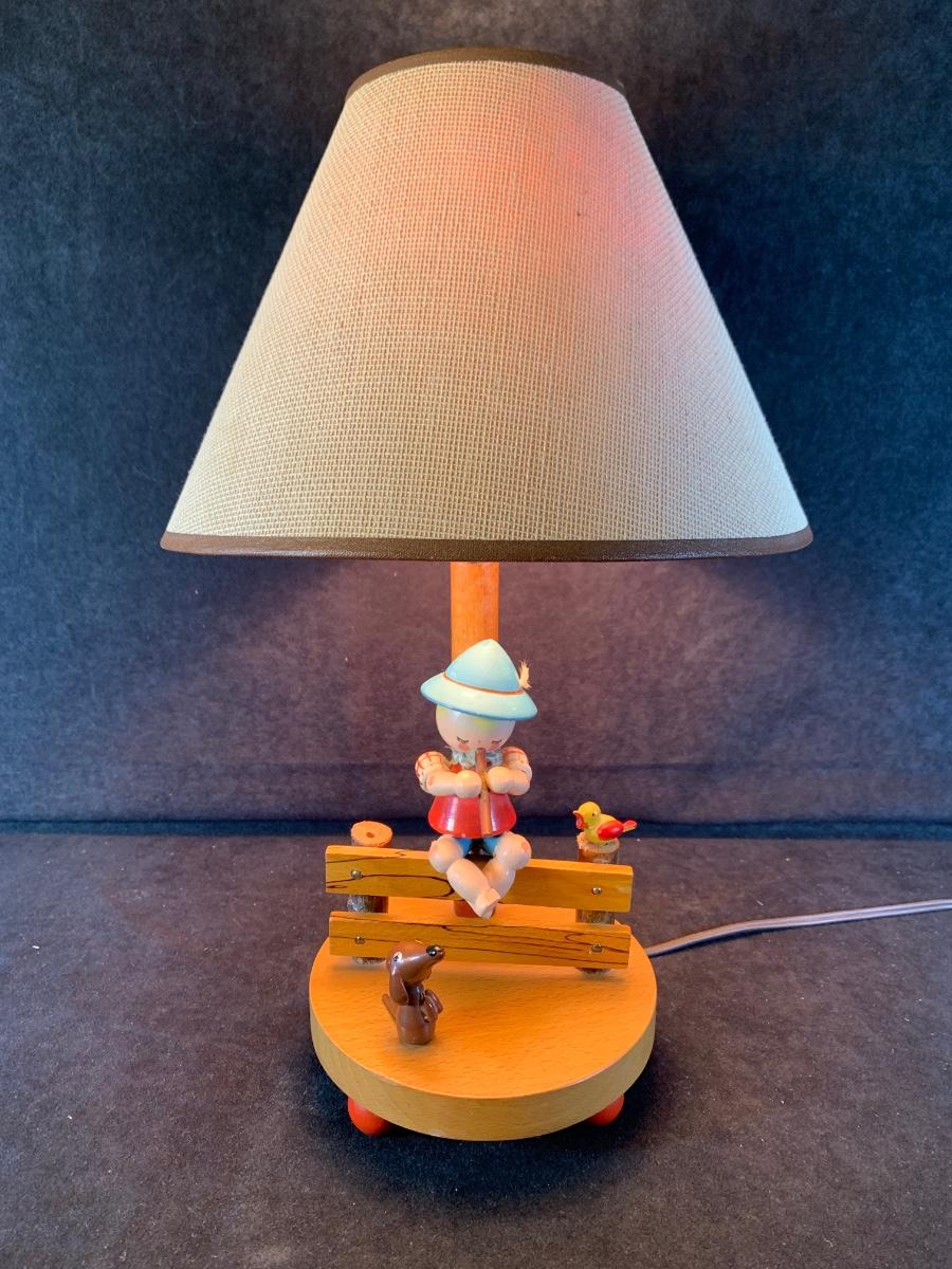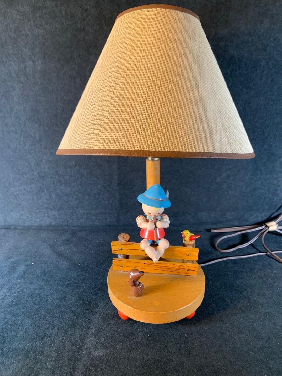 Adorable children's lamp with boy sitting on fence blowing a flute with a dog and bird listening nearby. approx. 14" tall