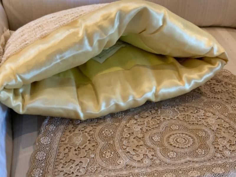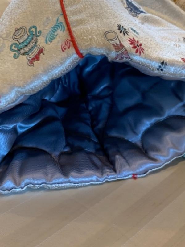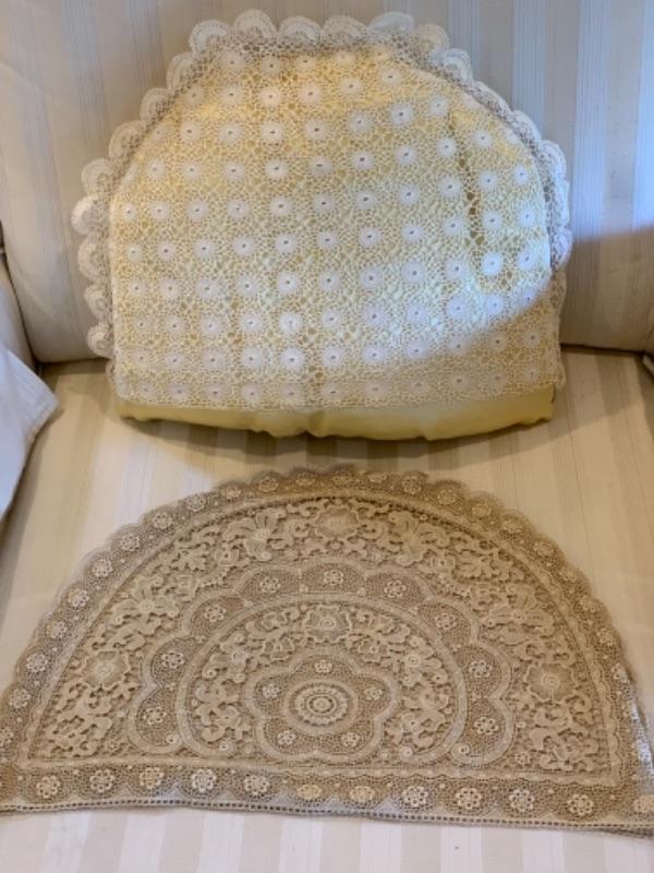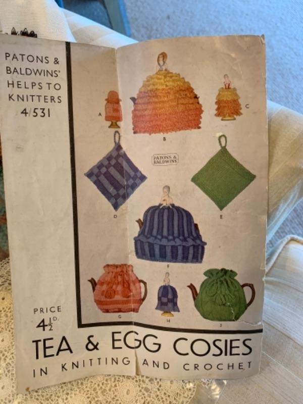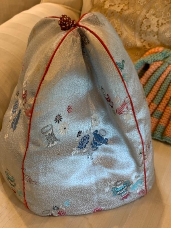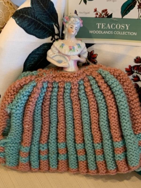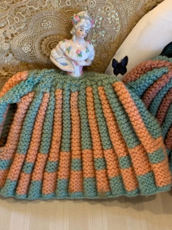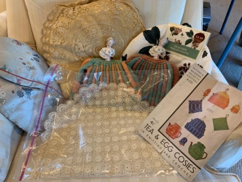 Lot 60. Collection of tea cozies“”2 lace, 2 knitted, and 2 of cotton and silk--$45