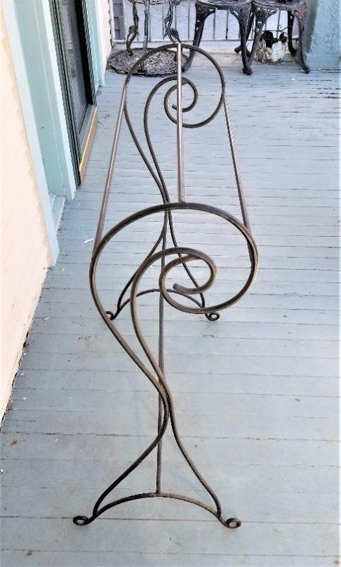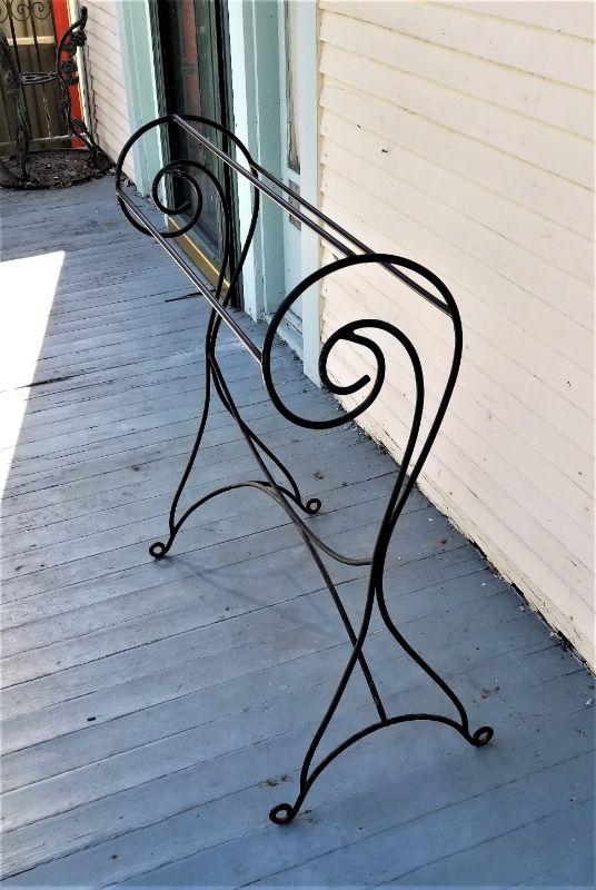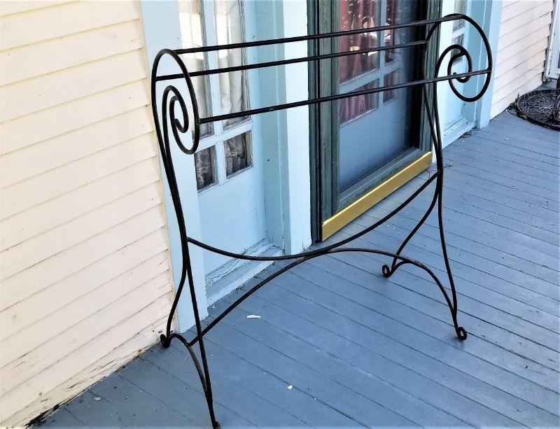 Curvy black metal rack for quilts, blankets, or even towels. Good used condition. Measures 30.25" across, 16" deep, 36" tall.