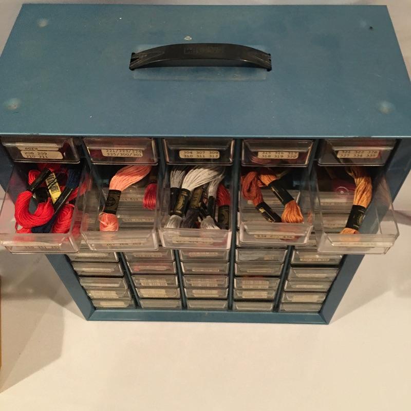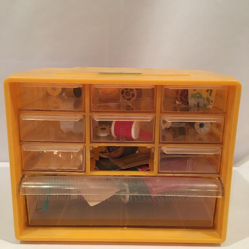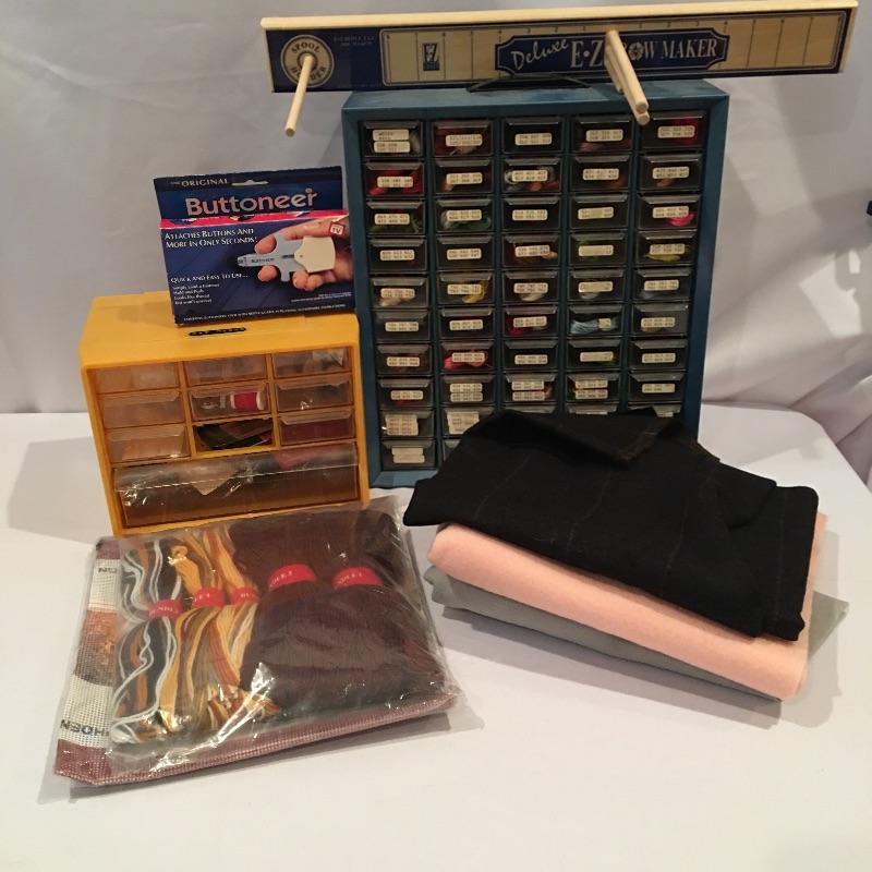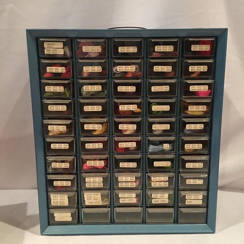 Lot includes fifty drawer mini cabinet with embroidery floss in most drawers, ten drawer mini cabinet with sewing accessories, fabric and more. Small cabinet is missing one drawer. Large cabinet measures 6.25” x 13” x 15”.