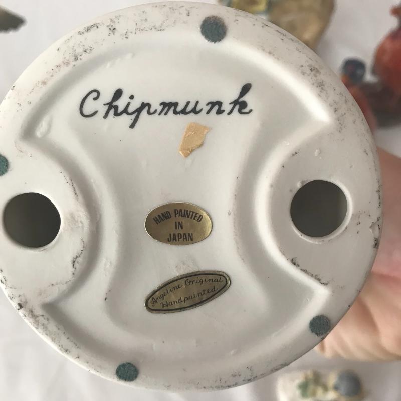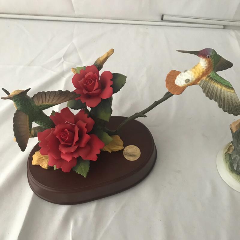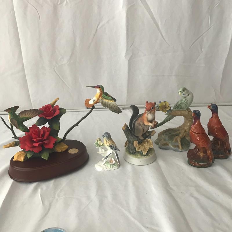 Lot contains porcelain humming bird statue with music box stand, two small wild turkey mini bottles, a chipmunk, and more. See pics for makers. Lot available for local pick up only.