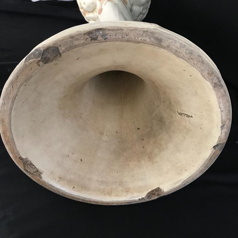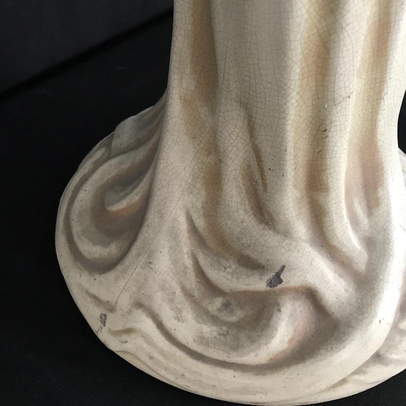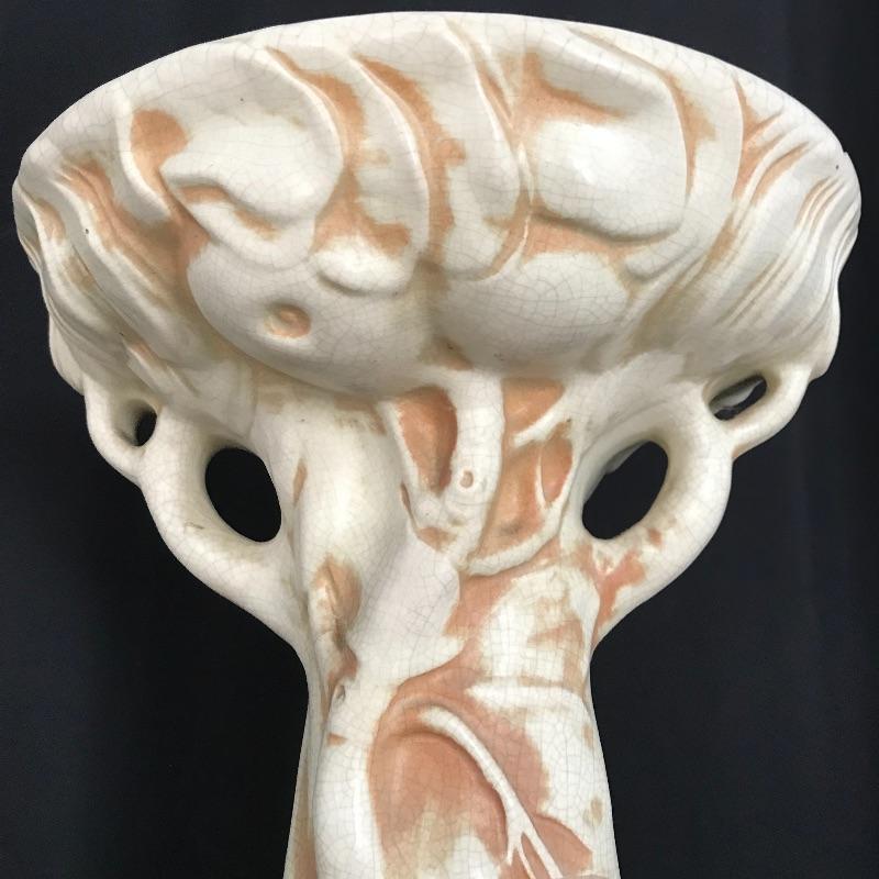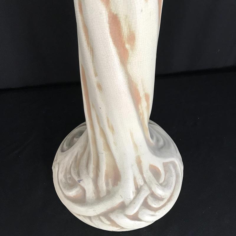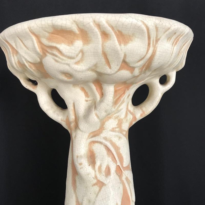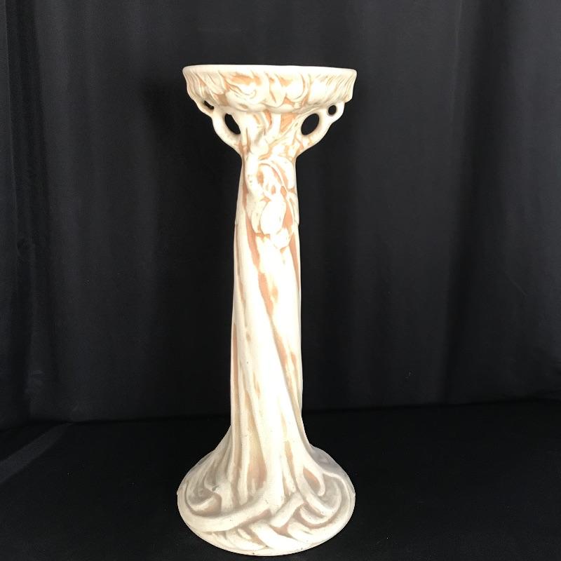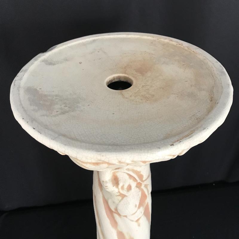 This lovely 29” tall ivory and burnt orange plant stand has fantastic details resembling a tree with foliage and intertwined roots. The crackle finish has a couple chips, noted in photos. The piece needs some cleaning, but would be a great addition to any area for a plant or to display your favorite item. You can even leave it as is. The family said this piece likely came from the renovations at The Battery Park Hotel in Asheville. It matches the planter in lot 20. No shipping.