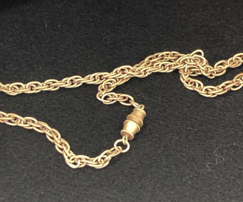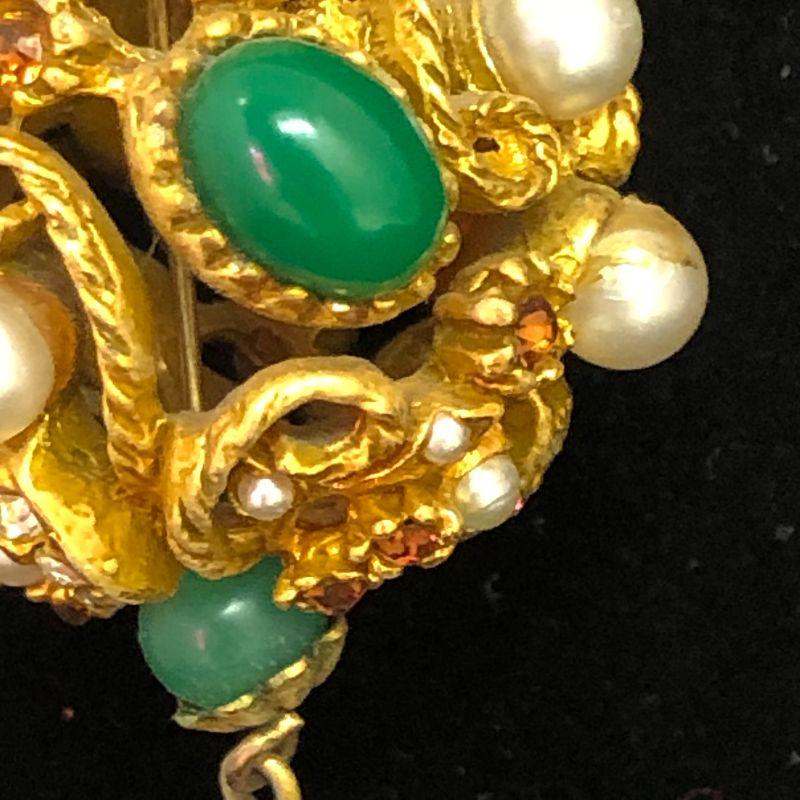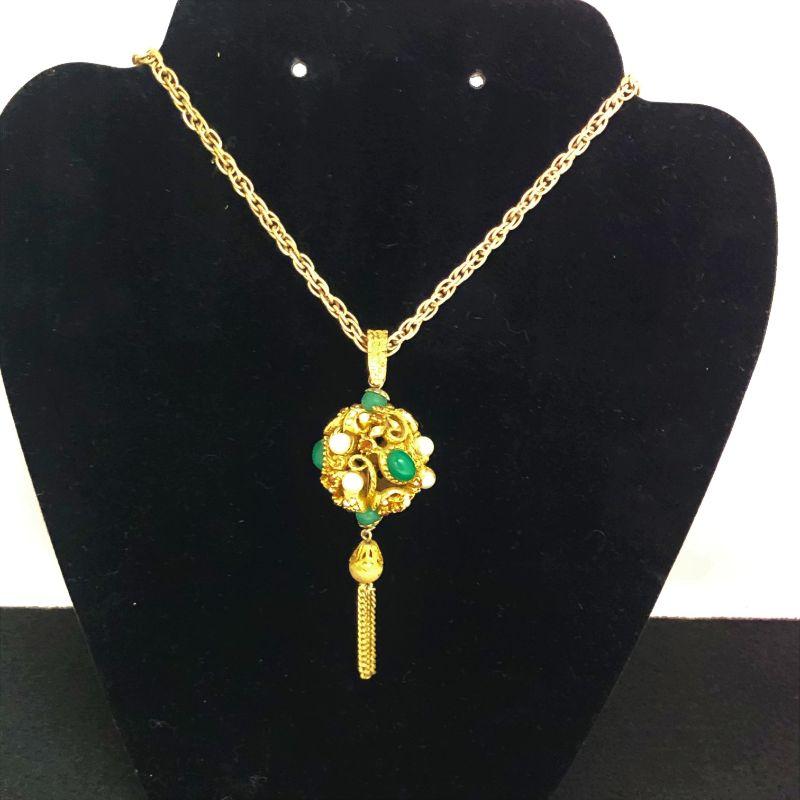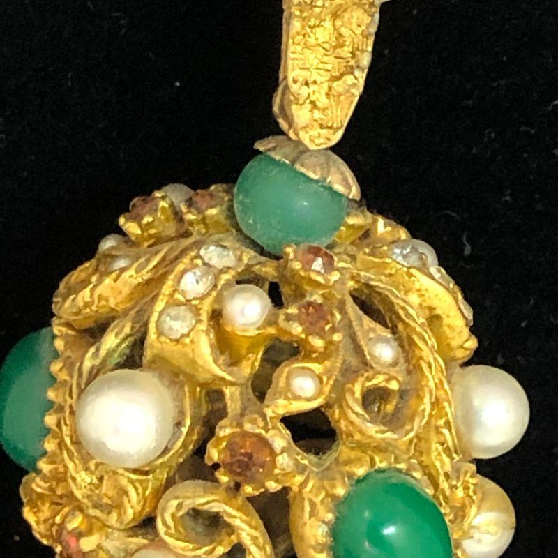 Such a pretty piece that combines faux jade, faux pearl, and clear and amber glass accents. All seem to be intact and overall this necklace is in excellent condition. It has a twist barrel clasp and the length of the chain is about 24" and the pendant length is about 3".