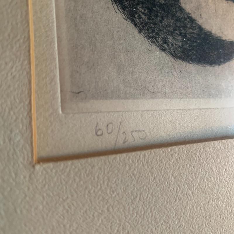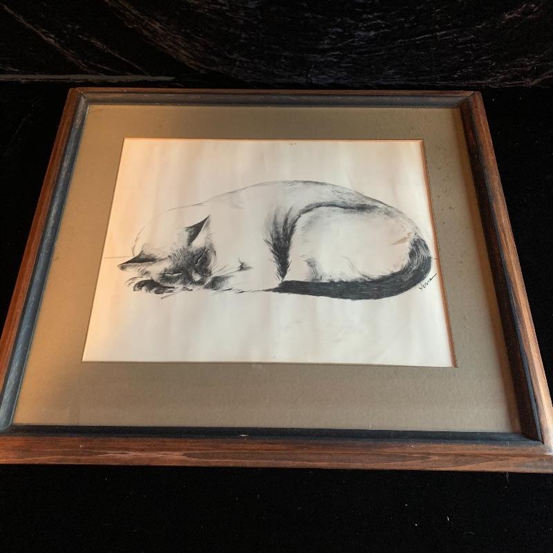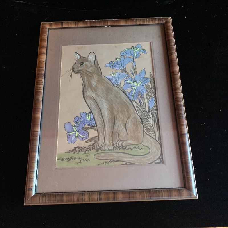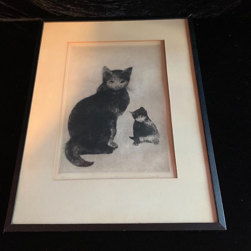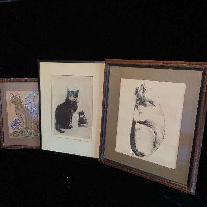 This lot includes three framed and matted pieces of cat art. The smallest piece is coloured and appears to be signed but can’t make out the signature. It measures about 17in x 13in. The black and white piece of two cats is titled “chats” and is numbered 60/250. It appears to be signed but can’t make out signature. The paper in the back has rips (see pictures). It measures about 21.5in x 16.5in. The last piece of a cat laying down appears to be signed by “Yeisha”. The paper on the back is ripped. It measures about 22in x 20in.