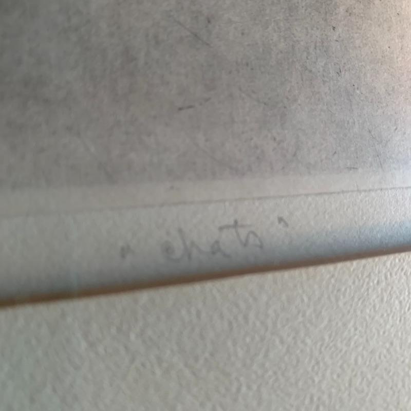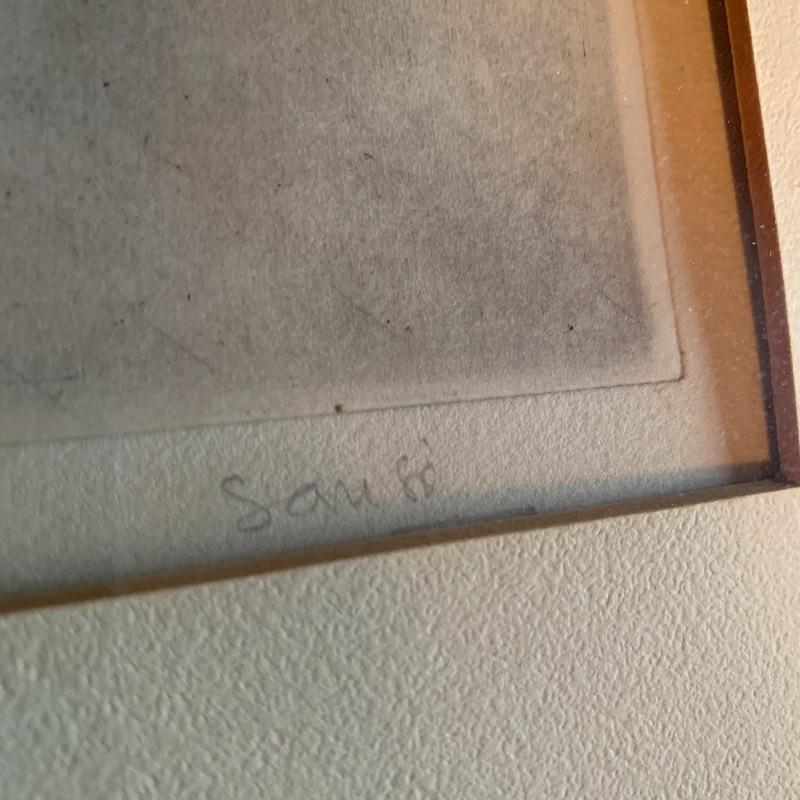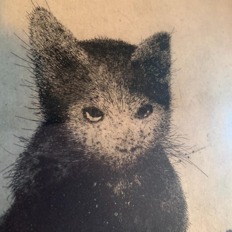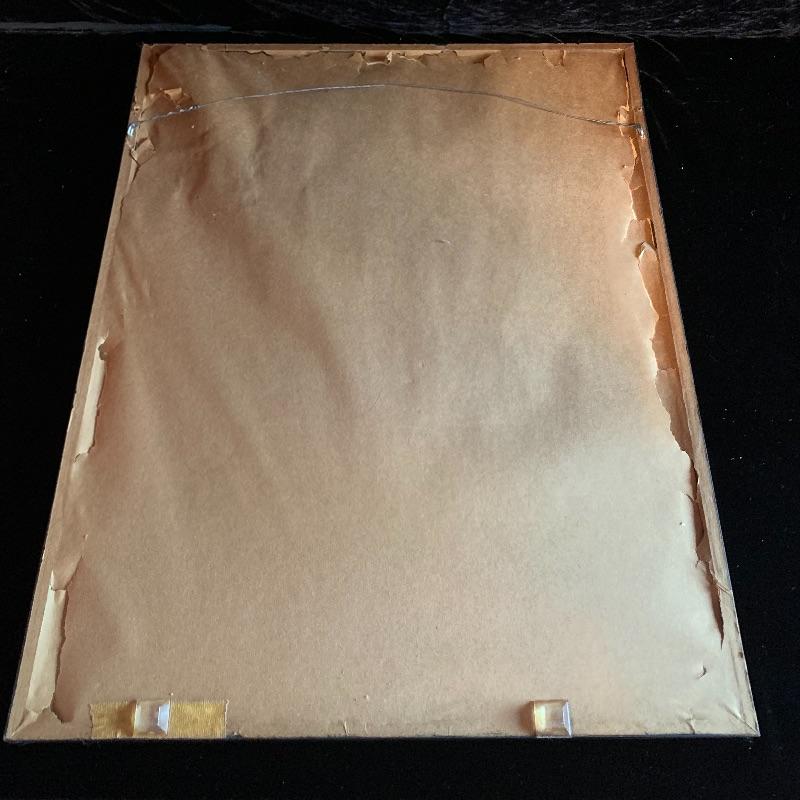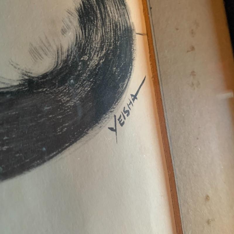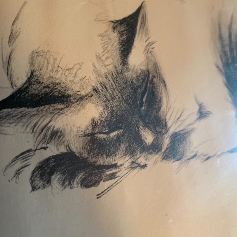 This lot includes three framed and matted pieces of cat art. The smallest piece is coloured and appears to be signed but can’t make out the signature. It measures about 17in x 13in. The black and white piece of two cats is titled “chats” and is numbered 60/250. It appears to be signed but can’t make out signature. The paper in the back has rips (see pictures). It measures about 21.5in x 16.5in. The last piece of a cat laying down appears to be signed by “Yeisha”. The paper on the back is ripped. It measures about 22in x 20in.