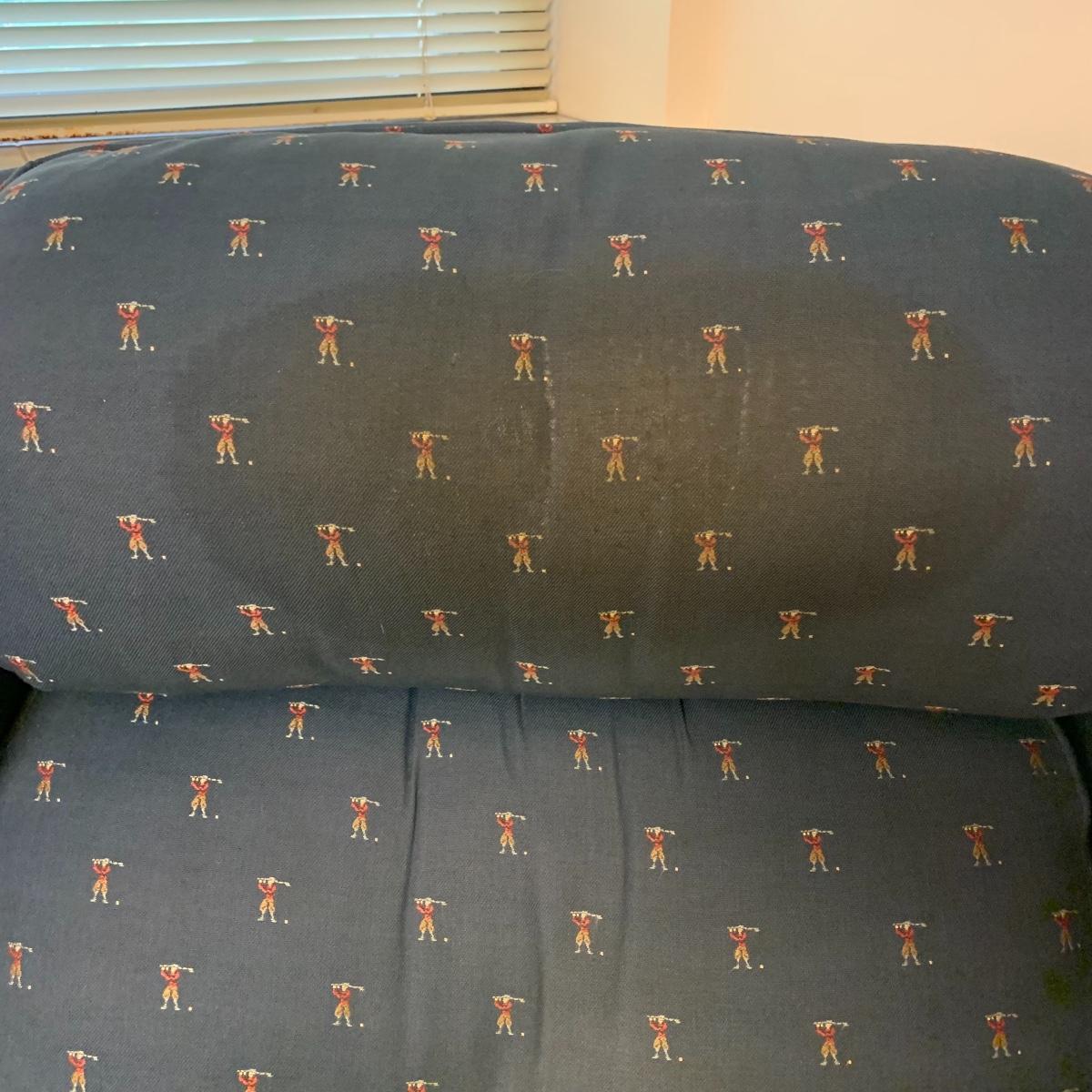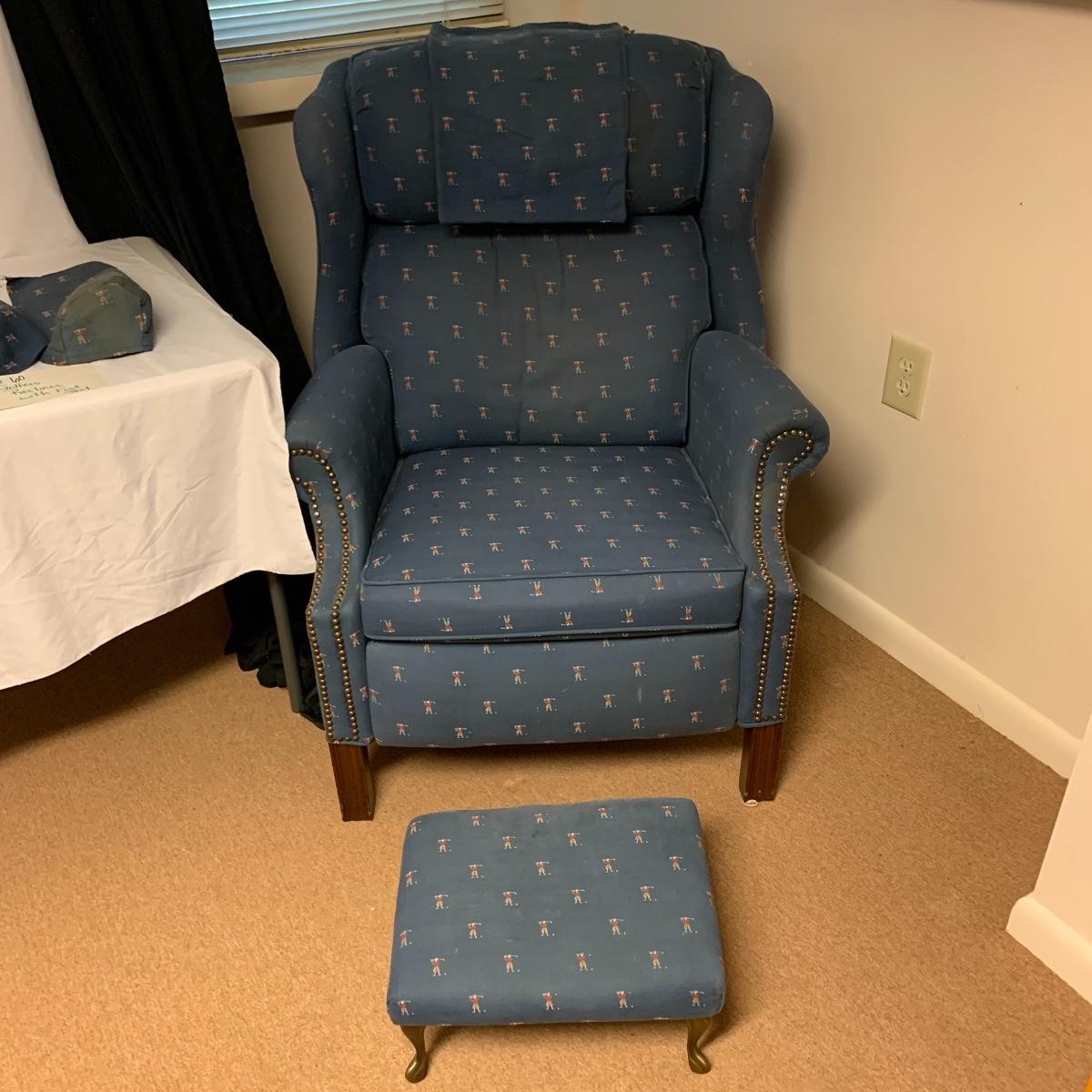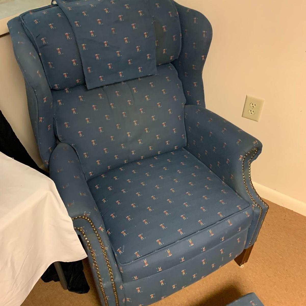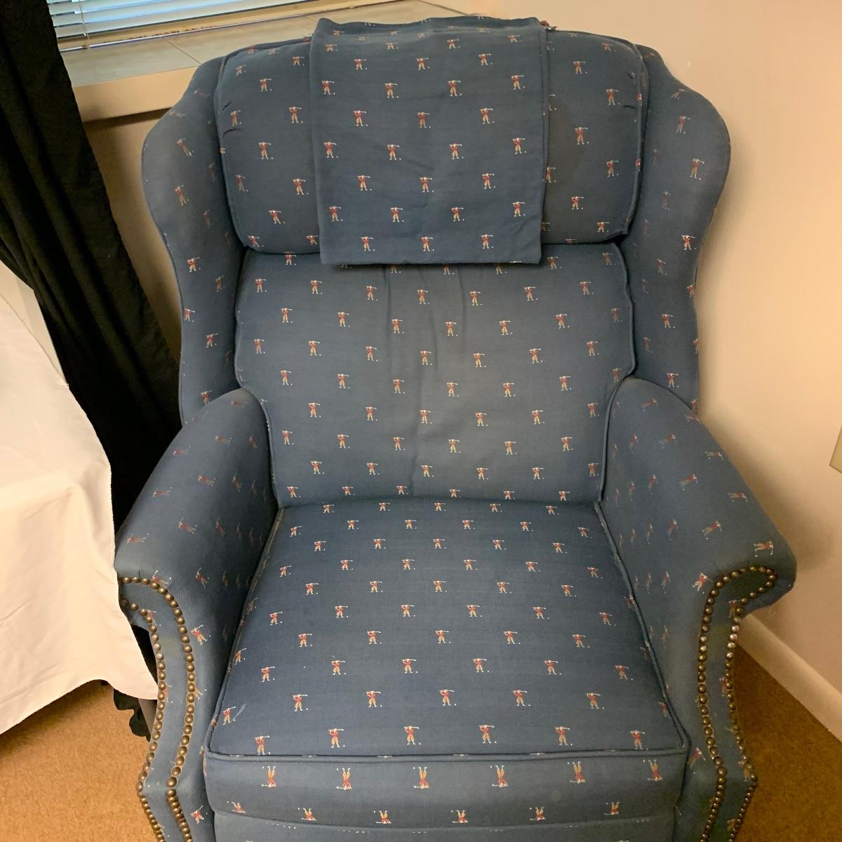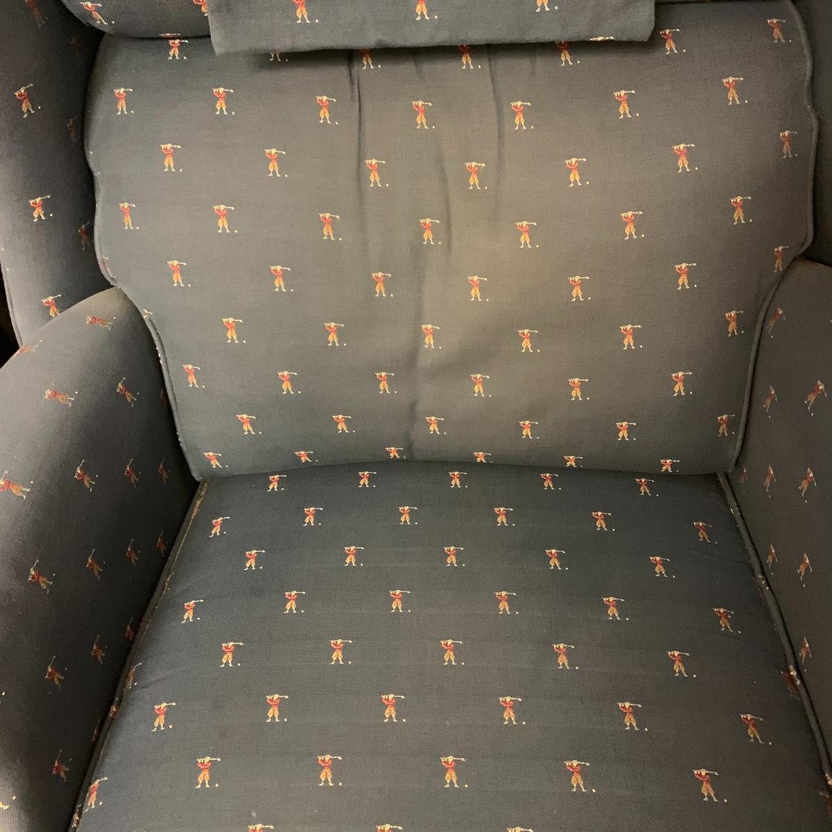 Relax after golfing 18 holes in this comfy recliner. This chair features a golf motif on a handsome navy blue background as well as a padded head rest. The chair reclines nicely and a foot stool is included. However there are a few stains that possibly could be steam cleaned out. The measurements are 33” wide X 41” tall X 36” deep. See pics for details and condition. Please bring help to move this item