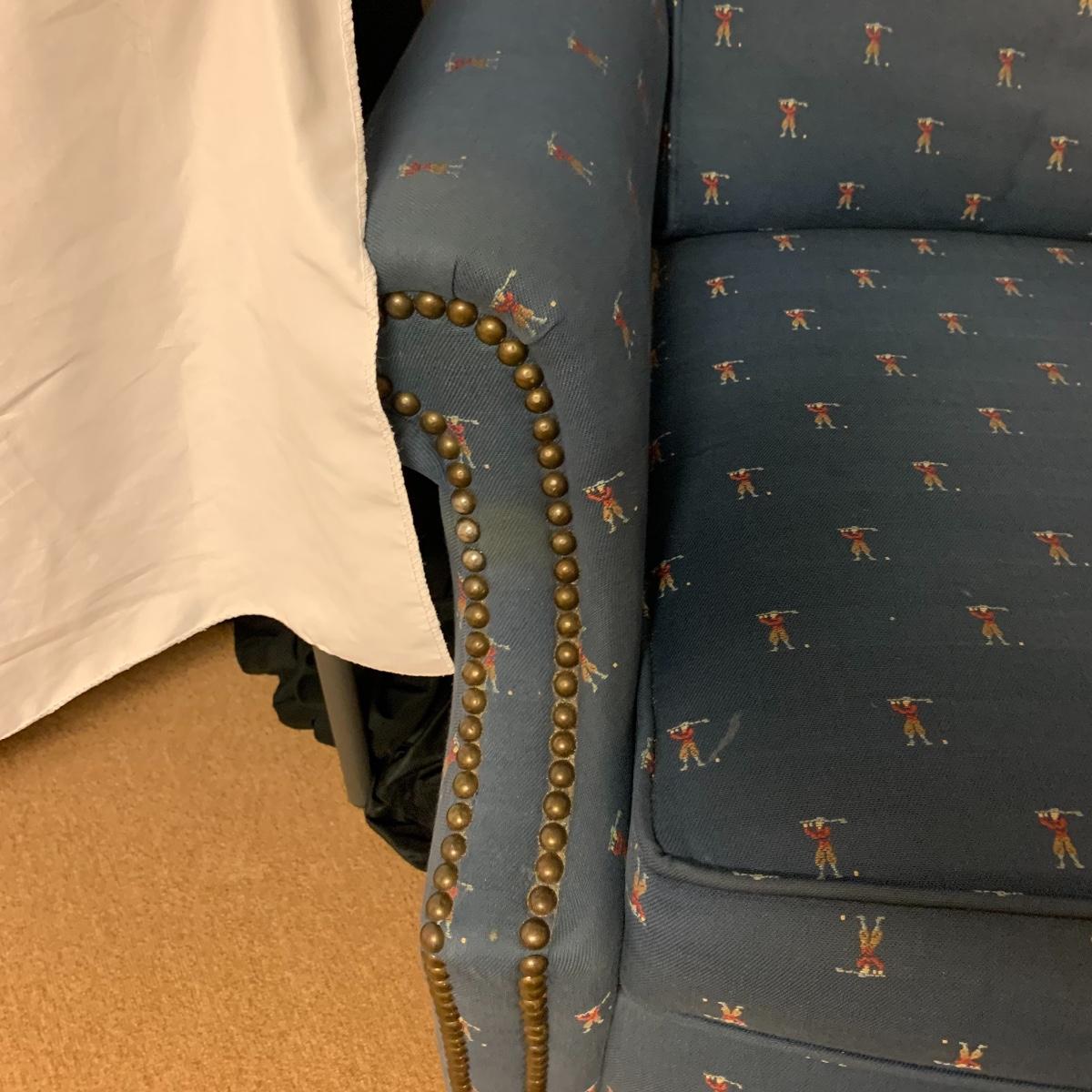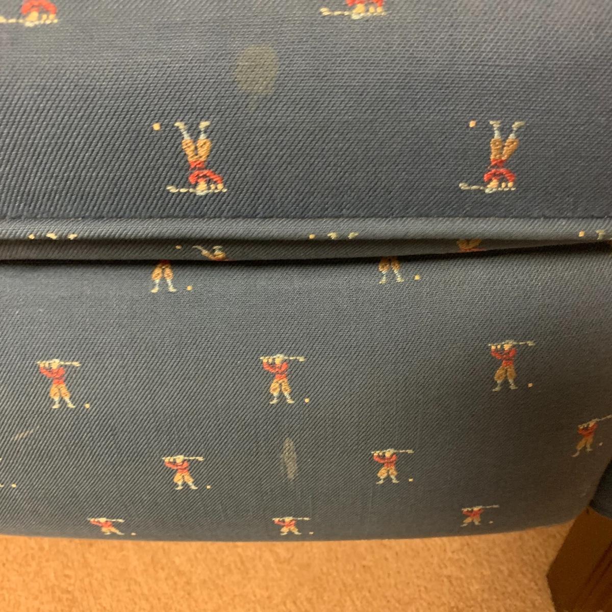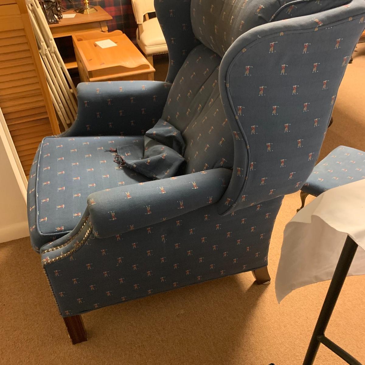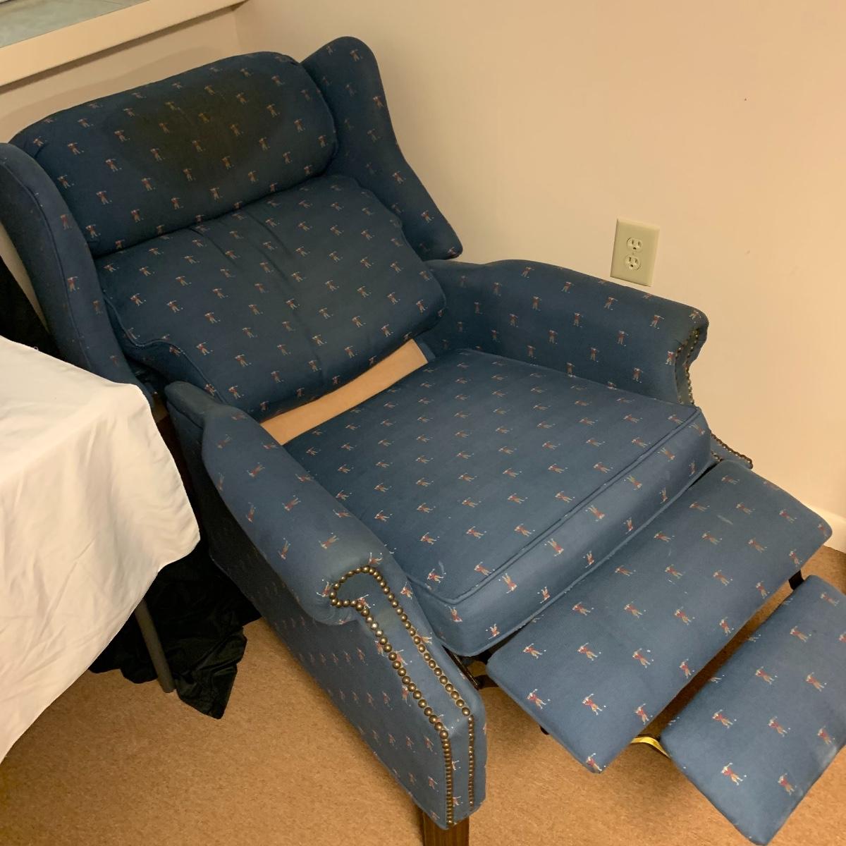 Relax after golfing 18 holes in this comfy recliner. This chair features a golf motif on a handsome navy blue background as well as a padded head rest. The chair reclines nicely and a foot stool is included. However there are a few stains that possibly could be steam cleaned out. The measurements are 33” wide X 41” tall X 36” deep. See pics for details and condition. Please bring help to move this item